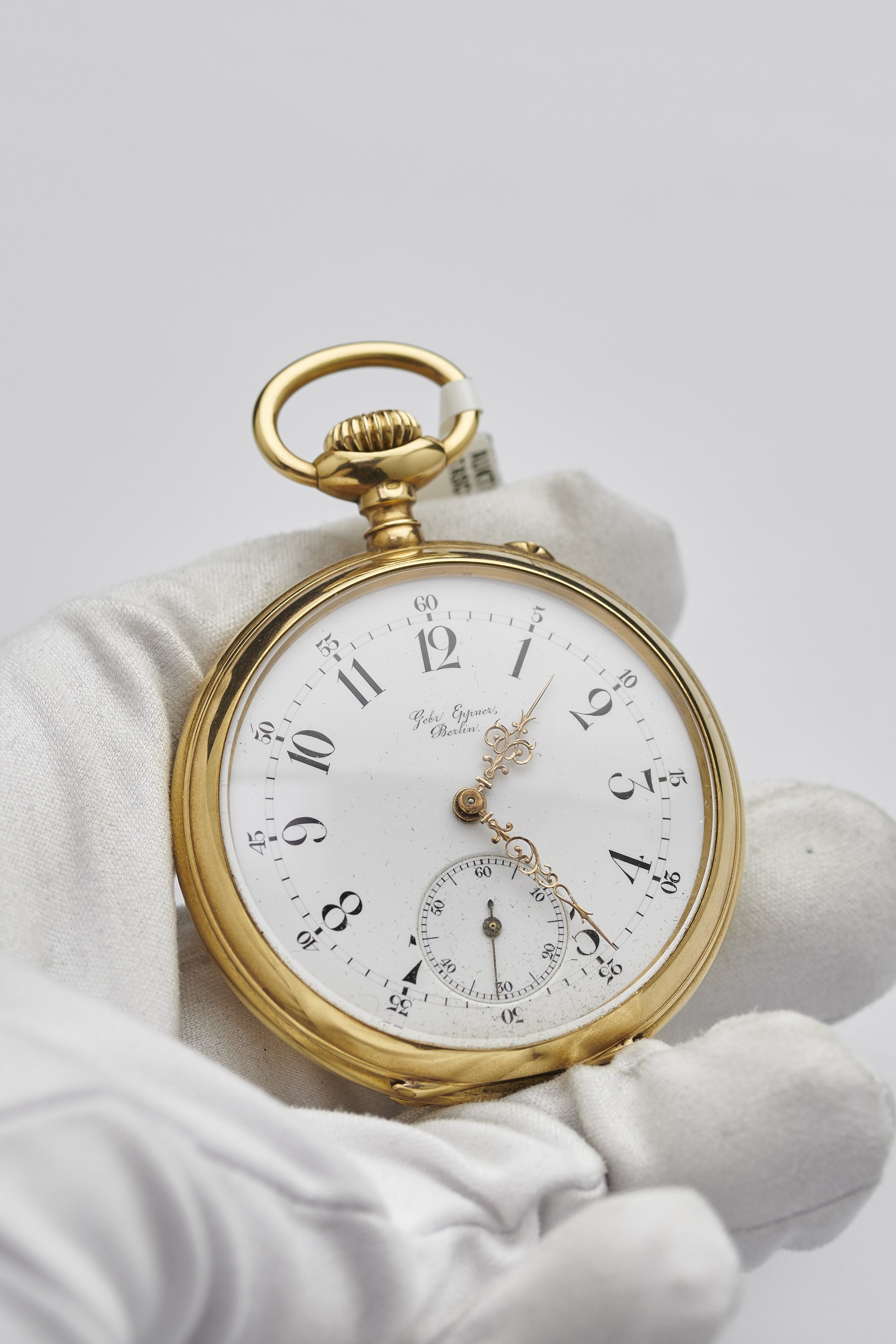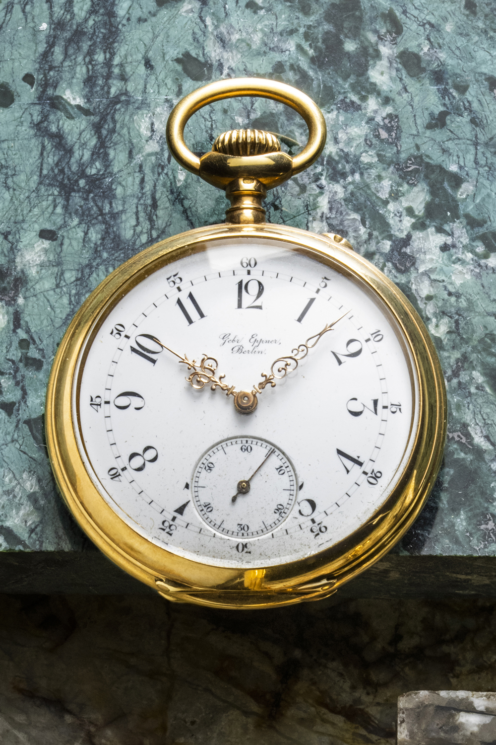 DialWhite enamel dial with Arabic numerals, small seconds at 6 o'clock, Louis XV hands, signed "Gebr. Eppner Berlin"