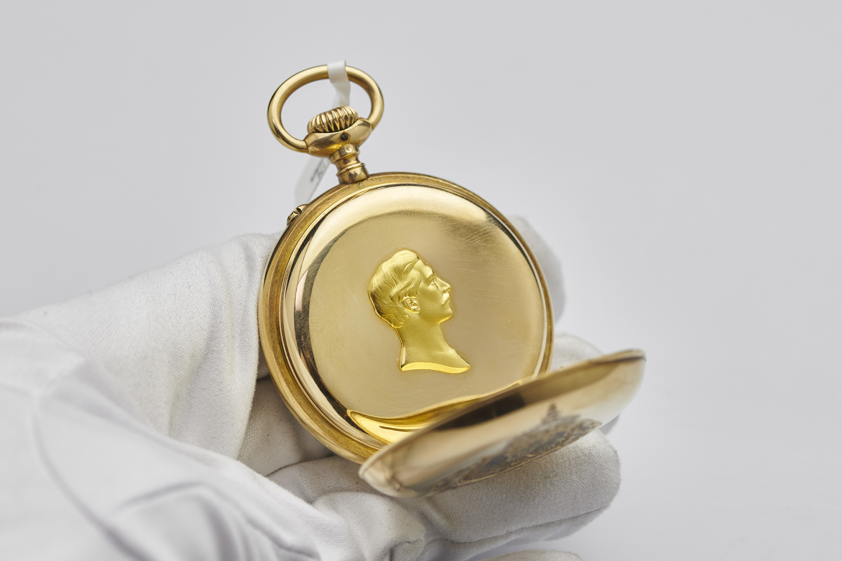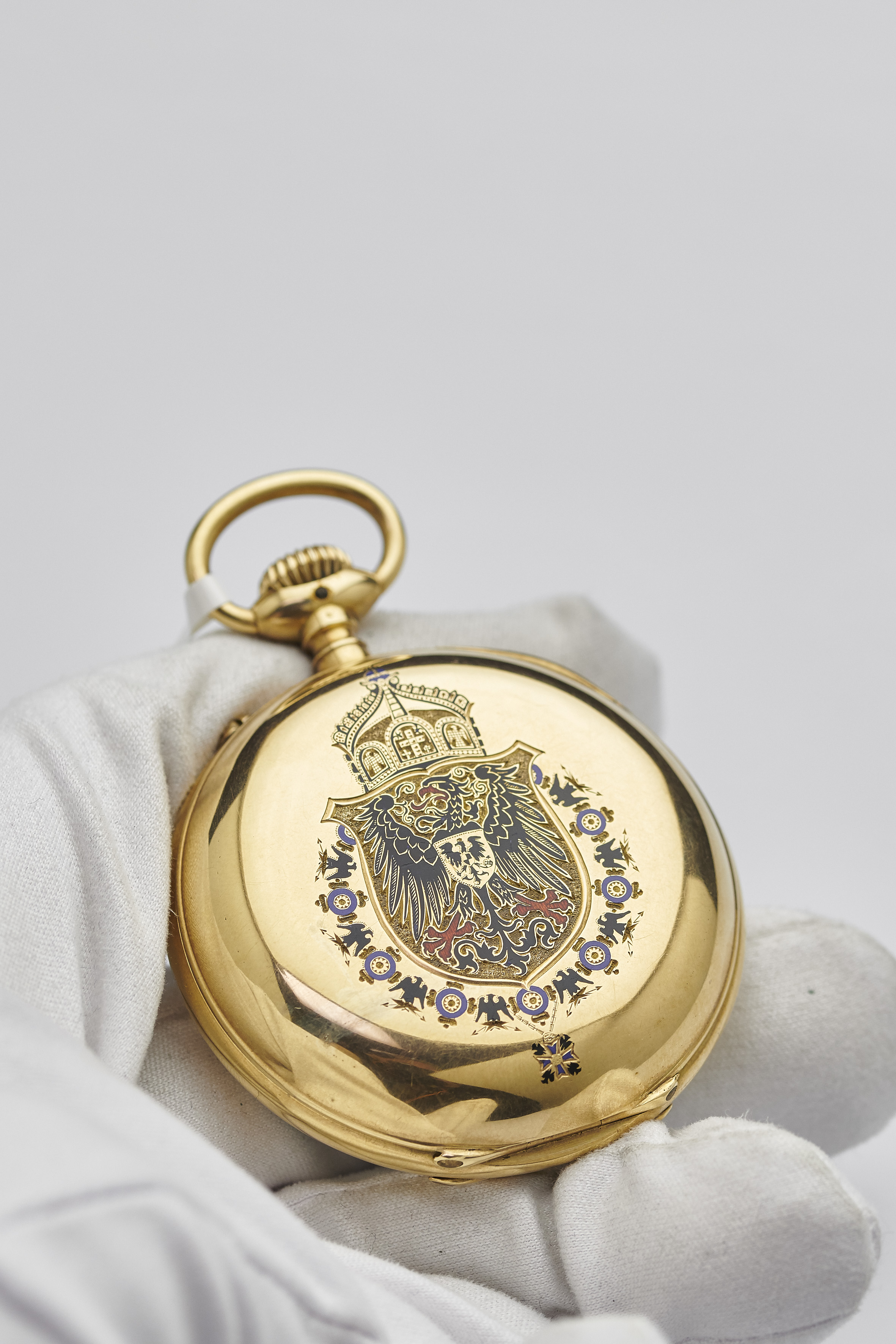 CaseRose gold case 585/1000, back with enamelled imperial coat of arms of the II German Kaiserreich, dust cover with portrait of Kaiser Wilhelm II.