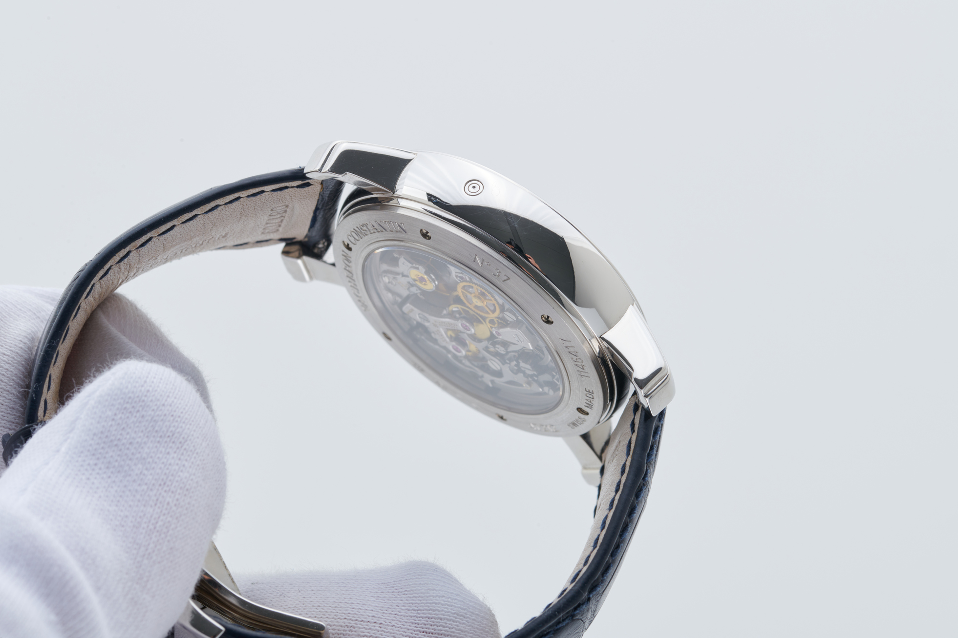 Vacheron Constantin generally prefers self-winding calibers for its perpetual calendars. Malte Chronograph Perpetual Calendar Ref. 47212/000P-9250 (limited edition of 50 pieces, launched in 2007) is a rare exception, which is all the more remarkable as the base caliber here is the Vacheron Constantin 1141, based on the respectable Nouvelle Lémania 2310, which has a very visually appealing chronograph mechanism. The layout of the chronograph includes a column wheel and a lateral clutch. All of this is complemented very appropriately by a hallmark of high-end watchmaking such as the hairspring with Breguet overcoil. This watch comes from the special Excellence Platinum line, which is primarily aimed at collectors. Therefore, we not only find a platinum case here, but also an exceptional platinum dial with a matt, grained texture and the ‘PT 950’ marking. An absolute bonus is the hand-engraved face of the Moon on the moonphase display disc.