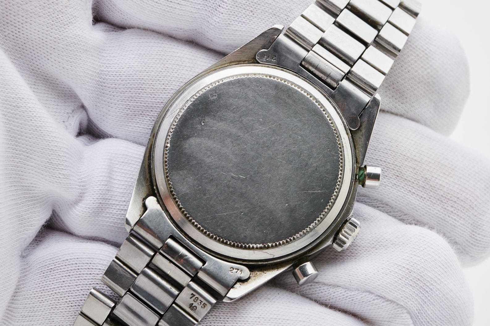 CaseRound case in stainless steel, fixed bezel in stainless steel with tachymeter scale engraved (50 to 200 Units per hour), screwed solid stainless steel caseback, winding crown at 3 o’clock with embossed Rolex crown, ‘pump’ chronograph buttons at 2 and 4 o’clock