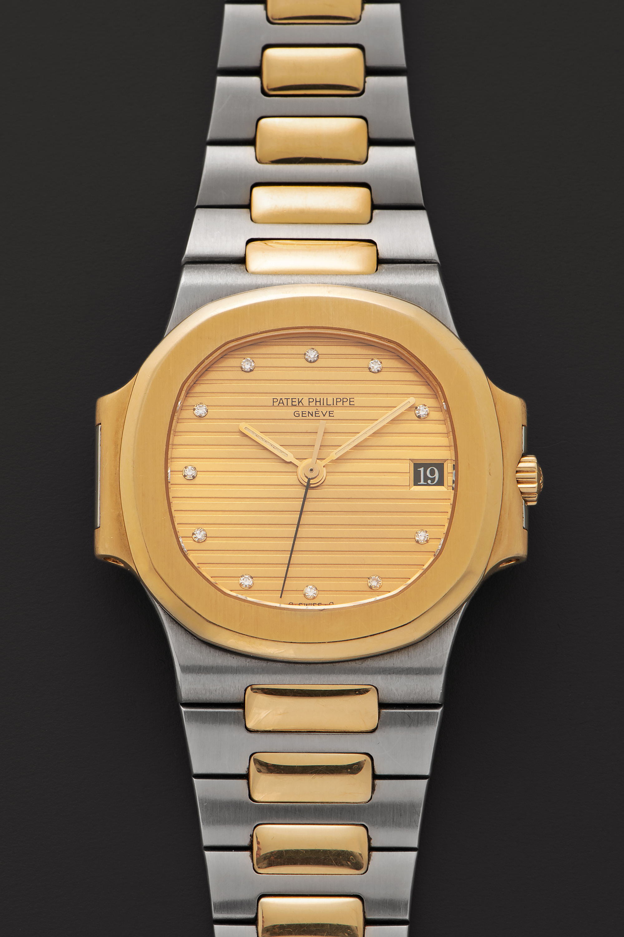 DialGold dial with horizontal engraved stripes, applied diamond indices, yellow gold hands, black date window at 3 o'clock, signed 'Patek Philippe Genève' at 12 o'clock,
