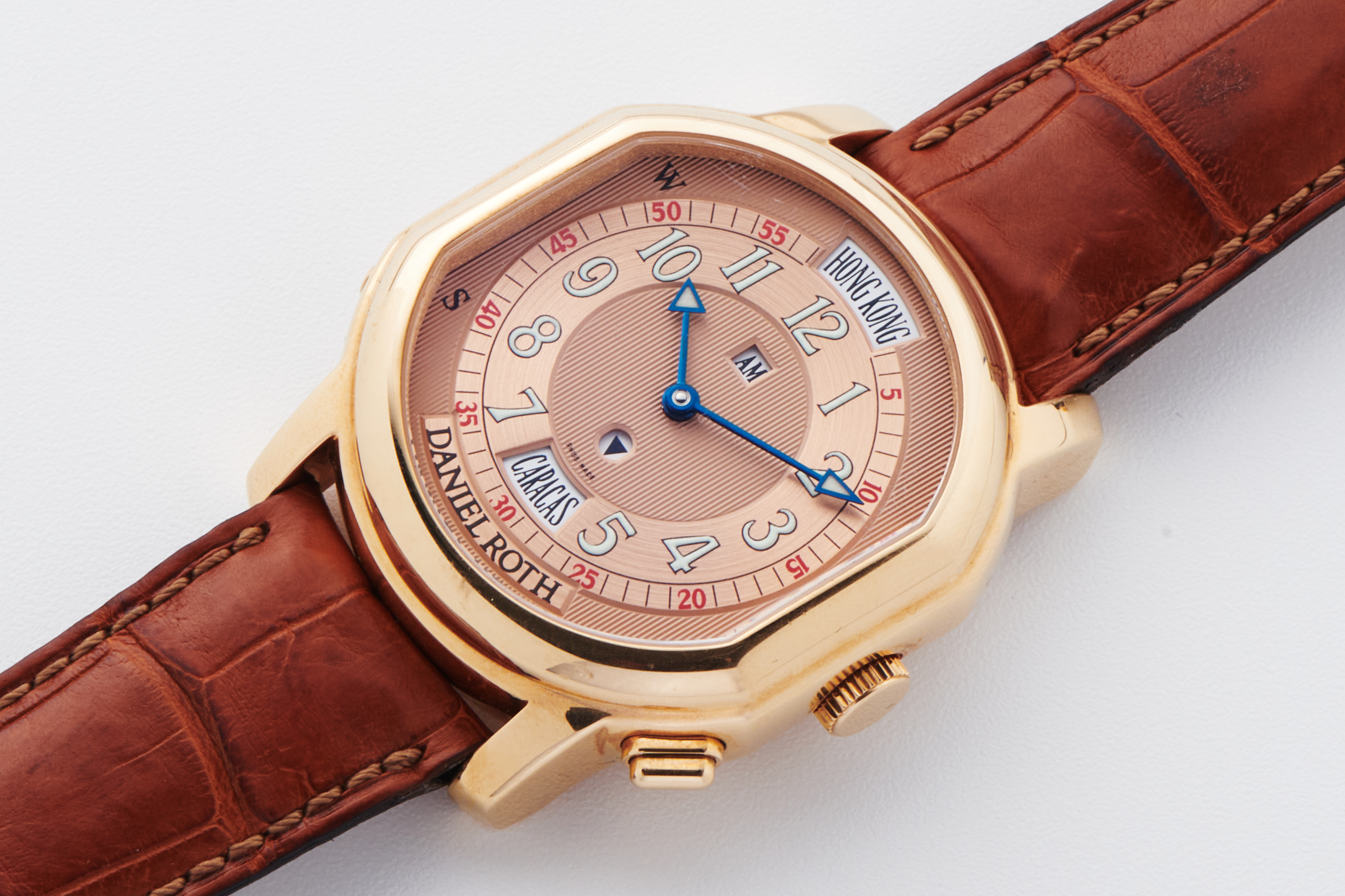 DialSalmon guilloche dial with luminous numerals and heat-blued hands, city window at 12 and 6 o'clock, am/pm indicator at 12 o'clock, signed 'Daniel Roth' at 6 o'clock