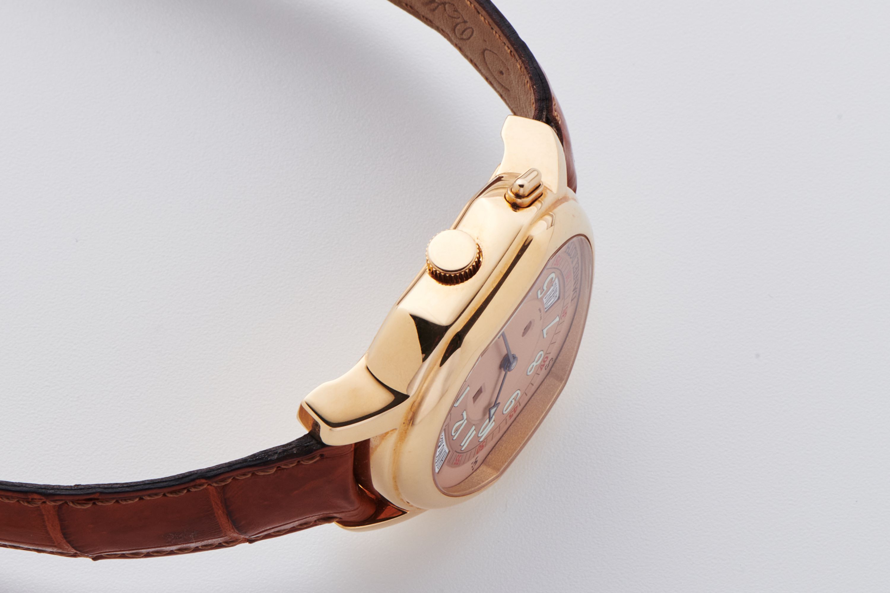 CaseEllipsocurvex case in 18k rose gold with crown at 3 o'clock, timezone pusher at 4 o'clock