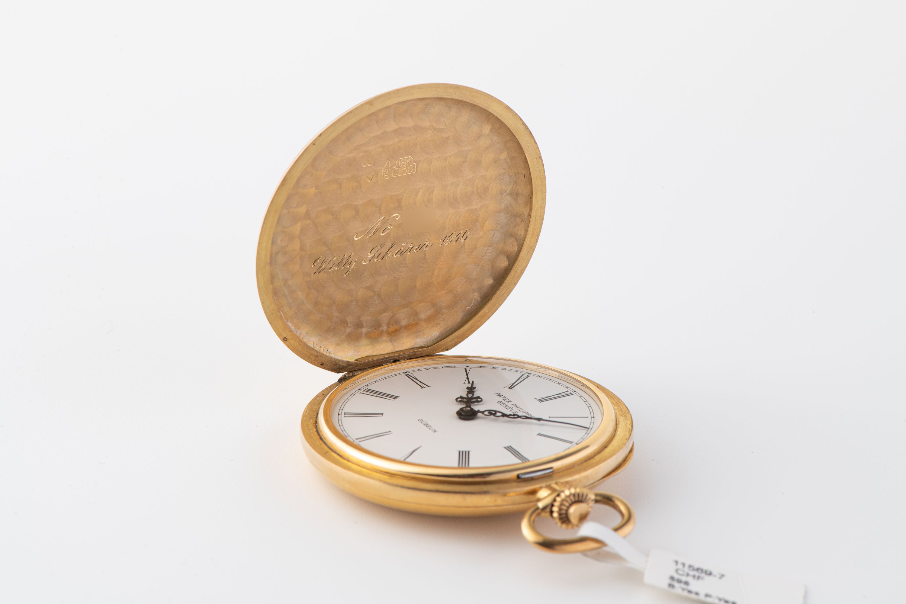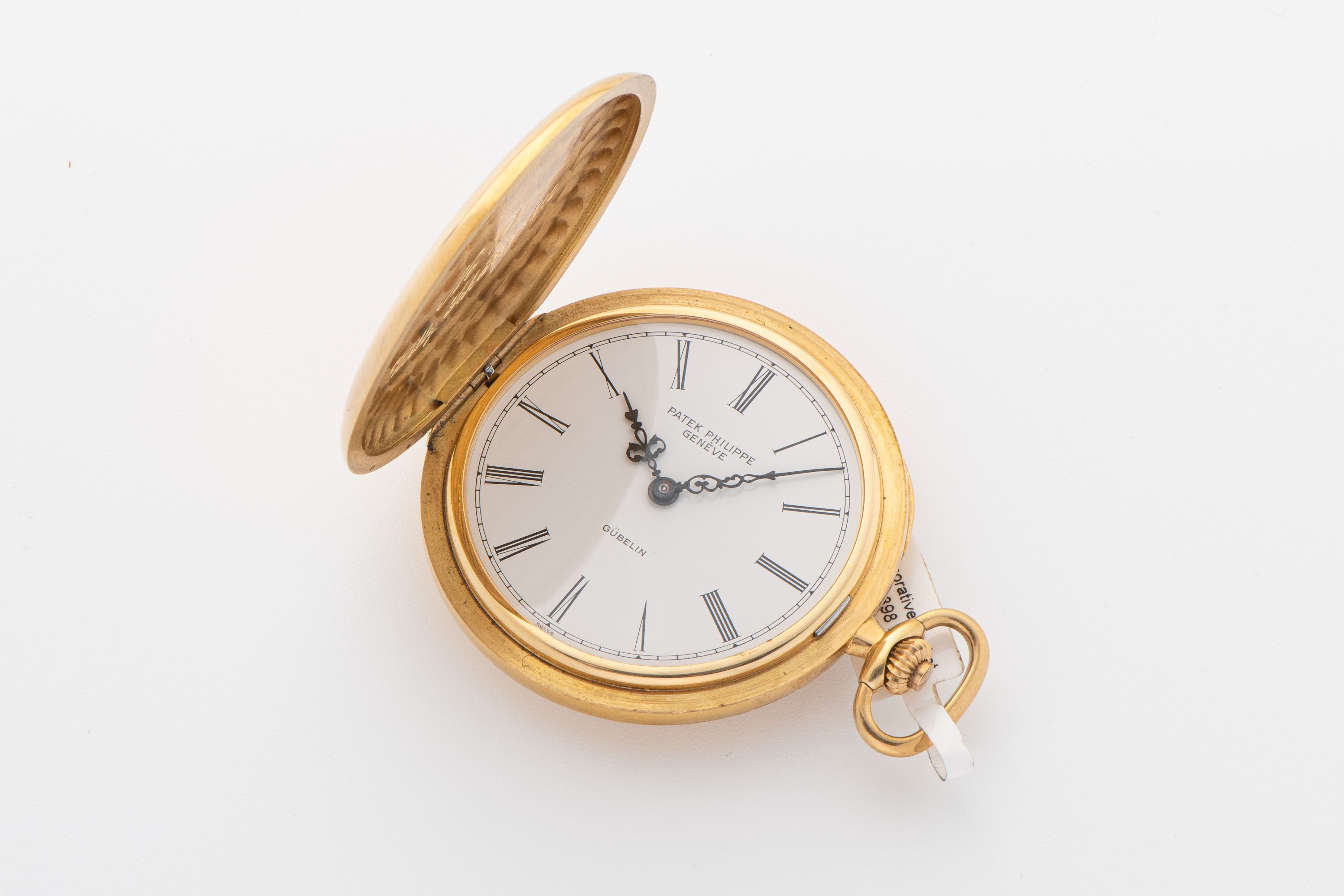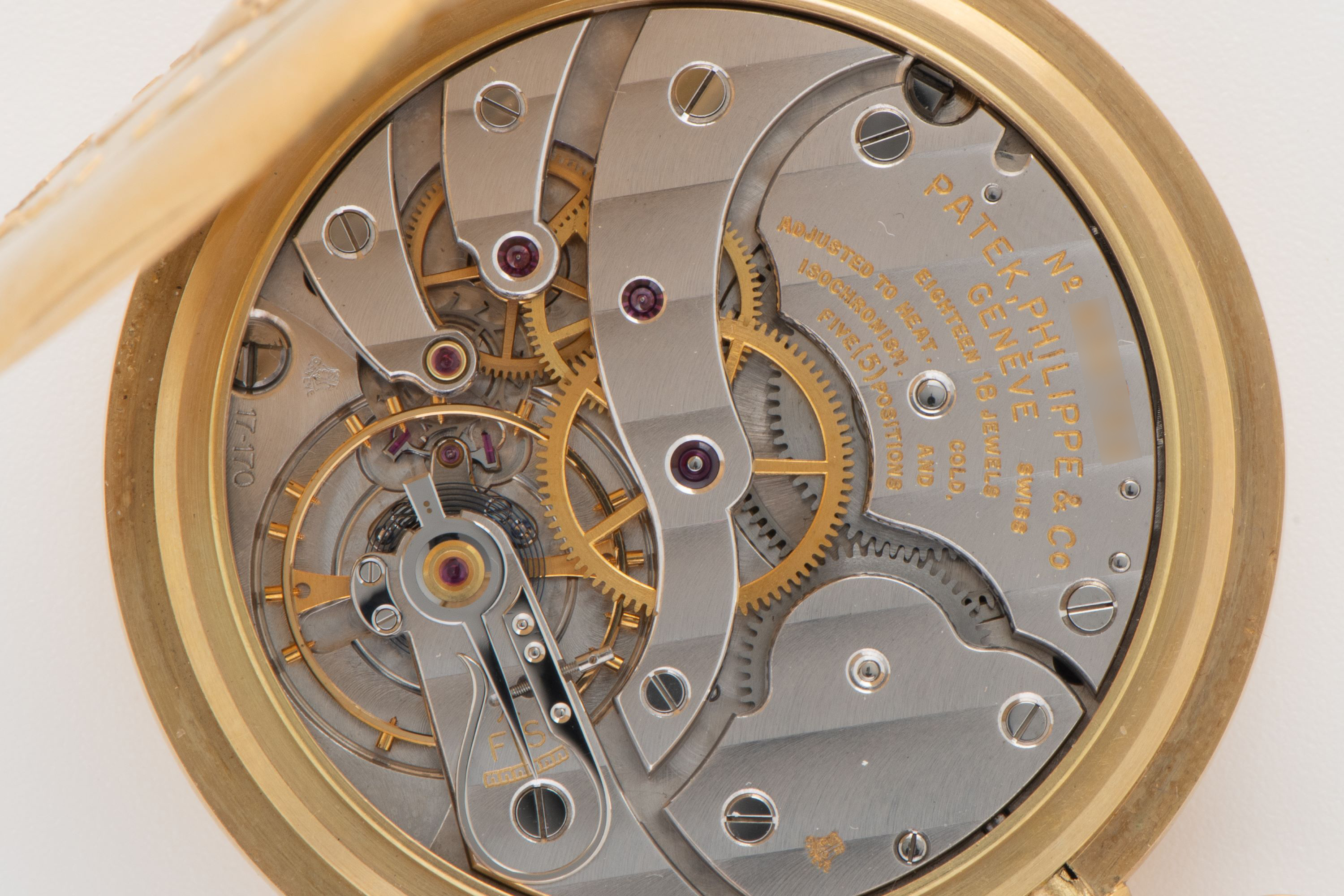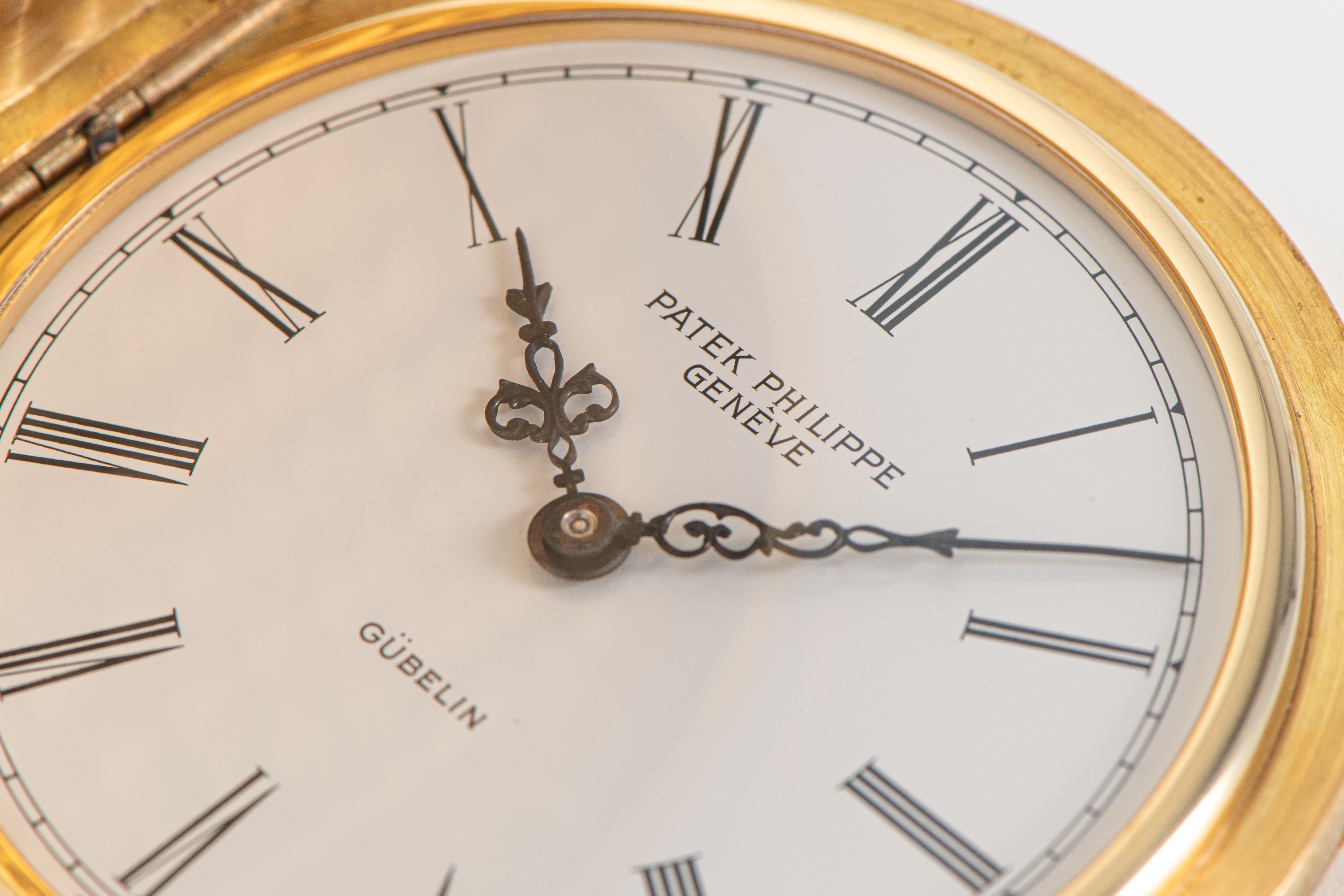 DialWhite enamel dial with roman numerals, ornate black hands, signed 'Patek Philippe' at 12 o'clock, signed 'Gübelin' at 6 o'clock