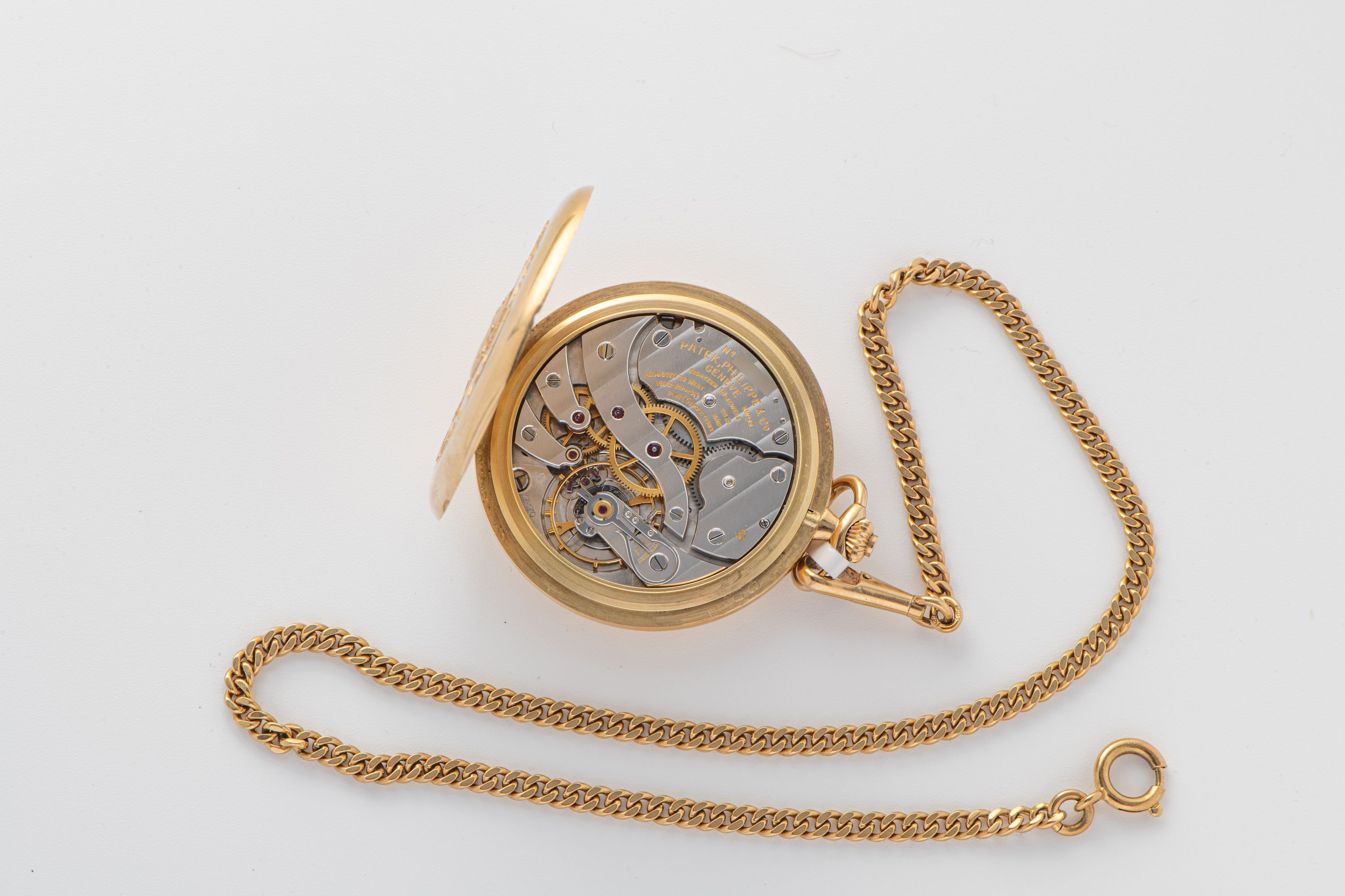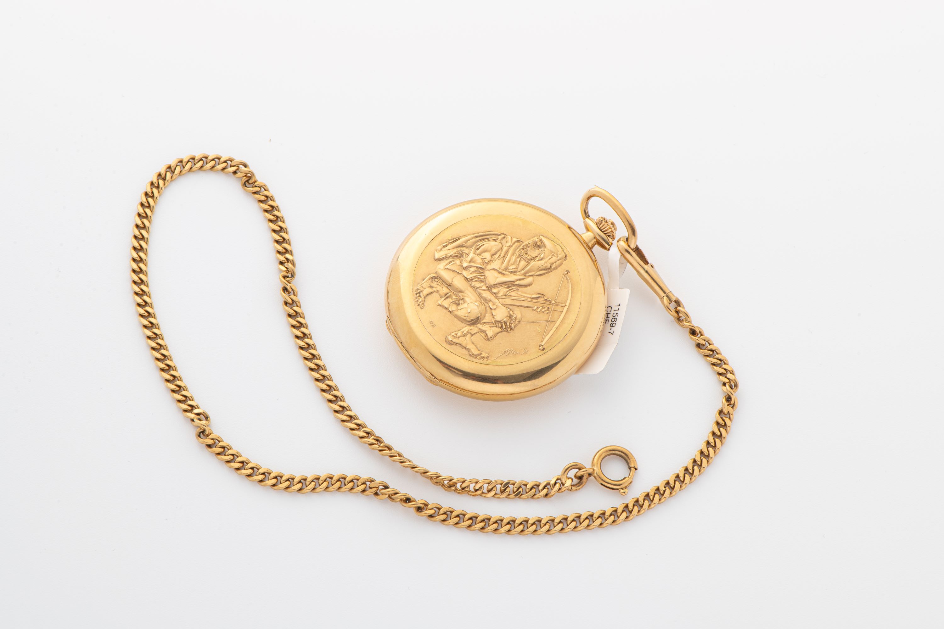 CaseRound case in 18k yellow gold with chain hook and crown at 3 o'clock, embossed case front and back