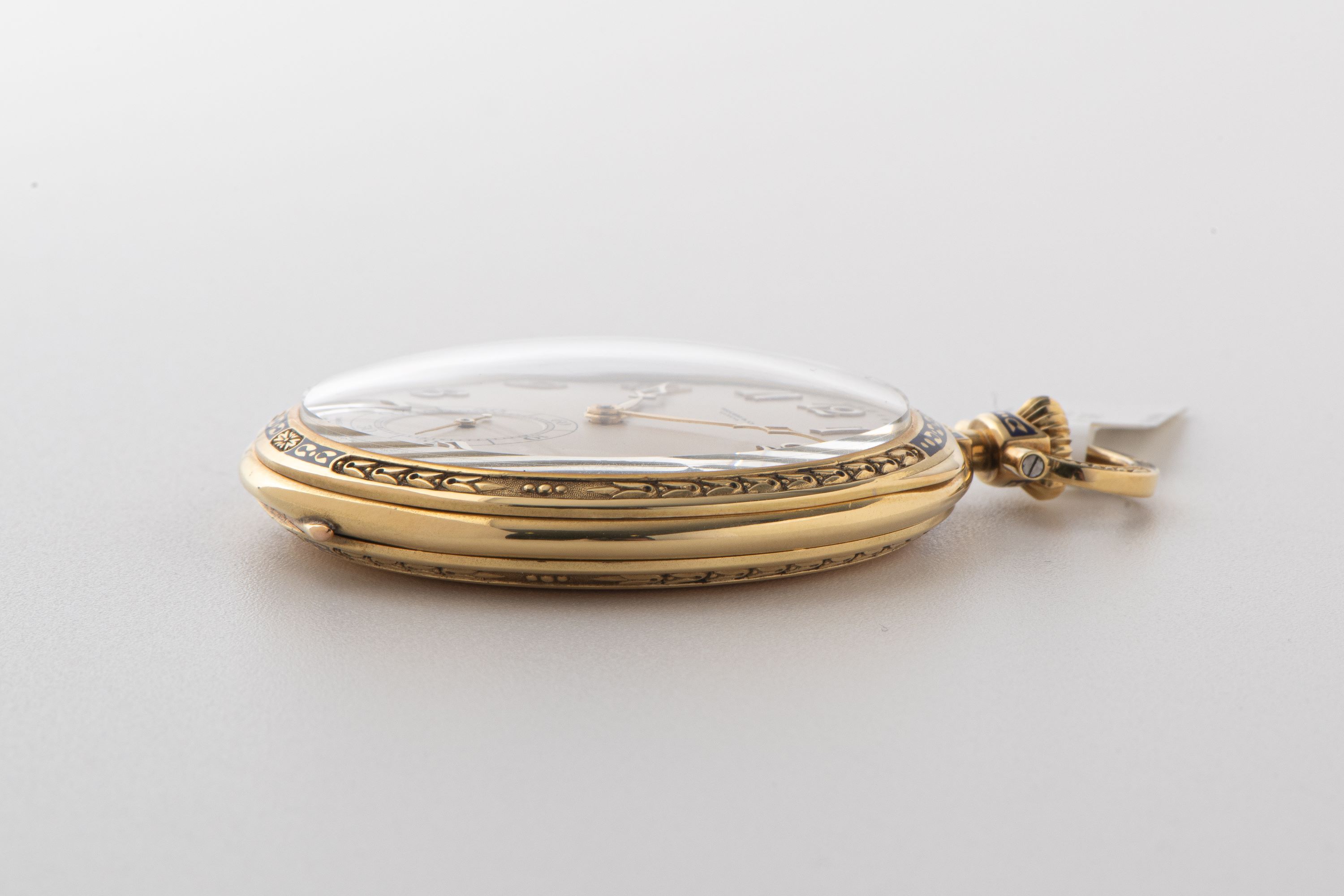 CaseRound case in 18k yellow gold with engravings, small parts enamel filled, double lid caseback, decorated chain hook and crown at 12 o'clock, minute repeater slider at 9 o'clock