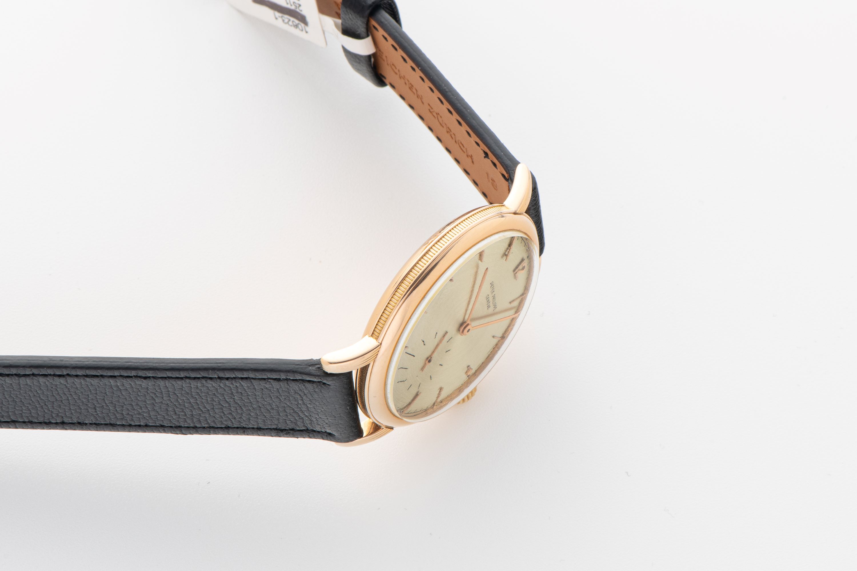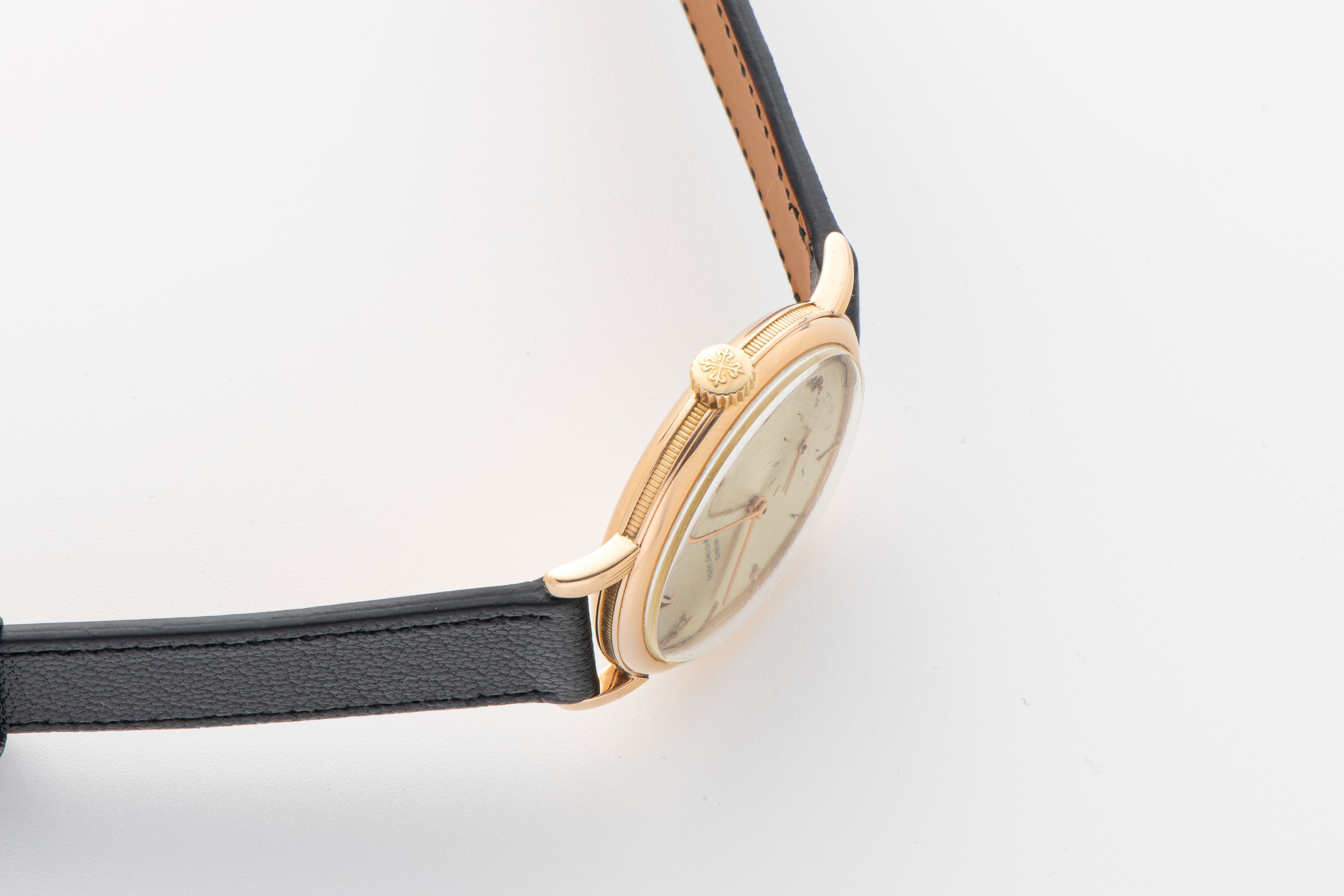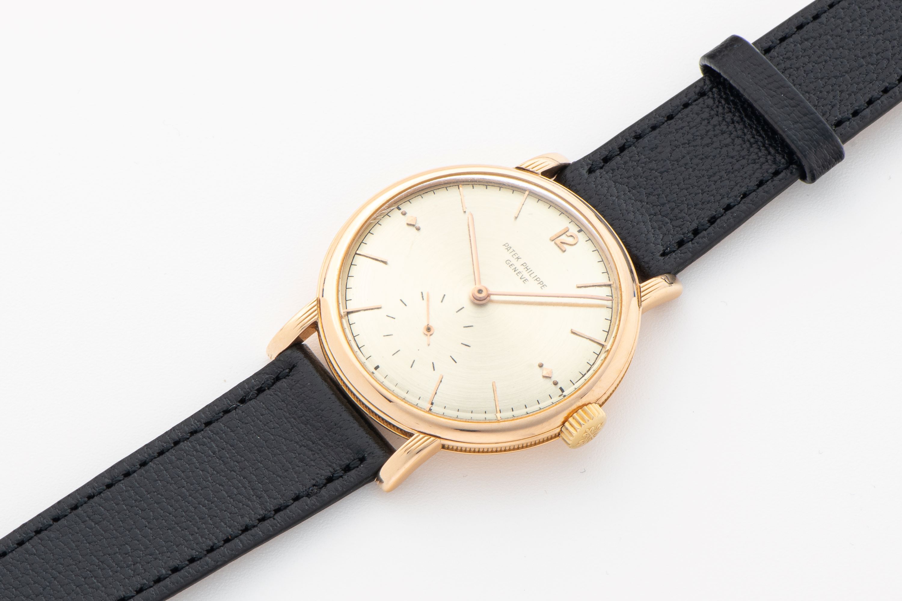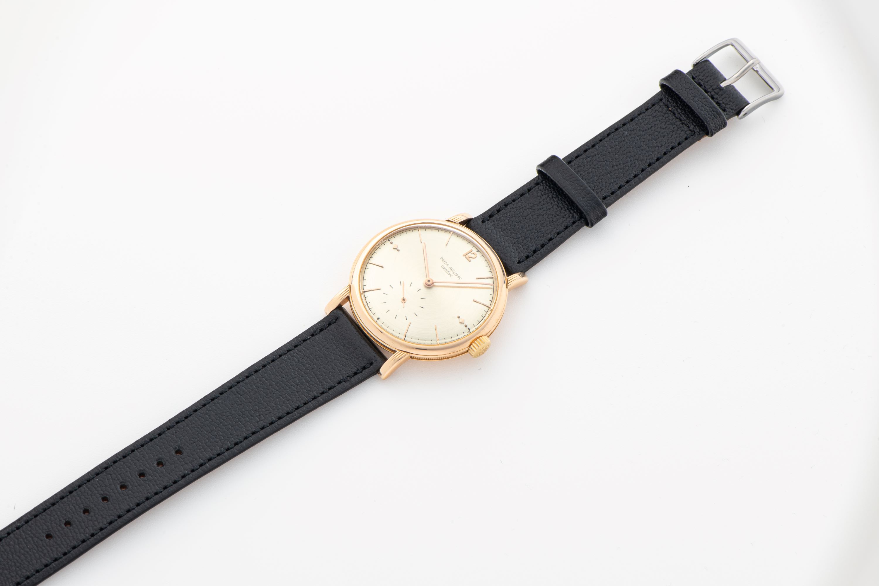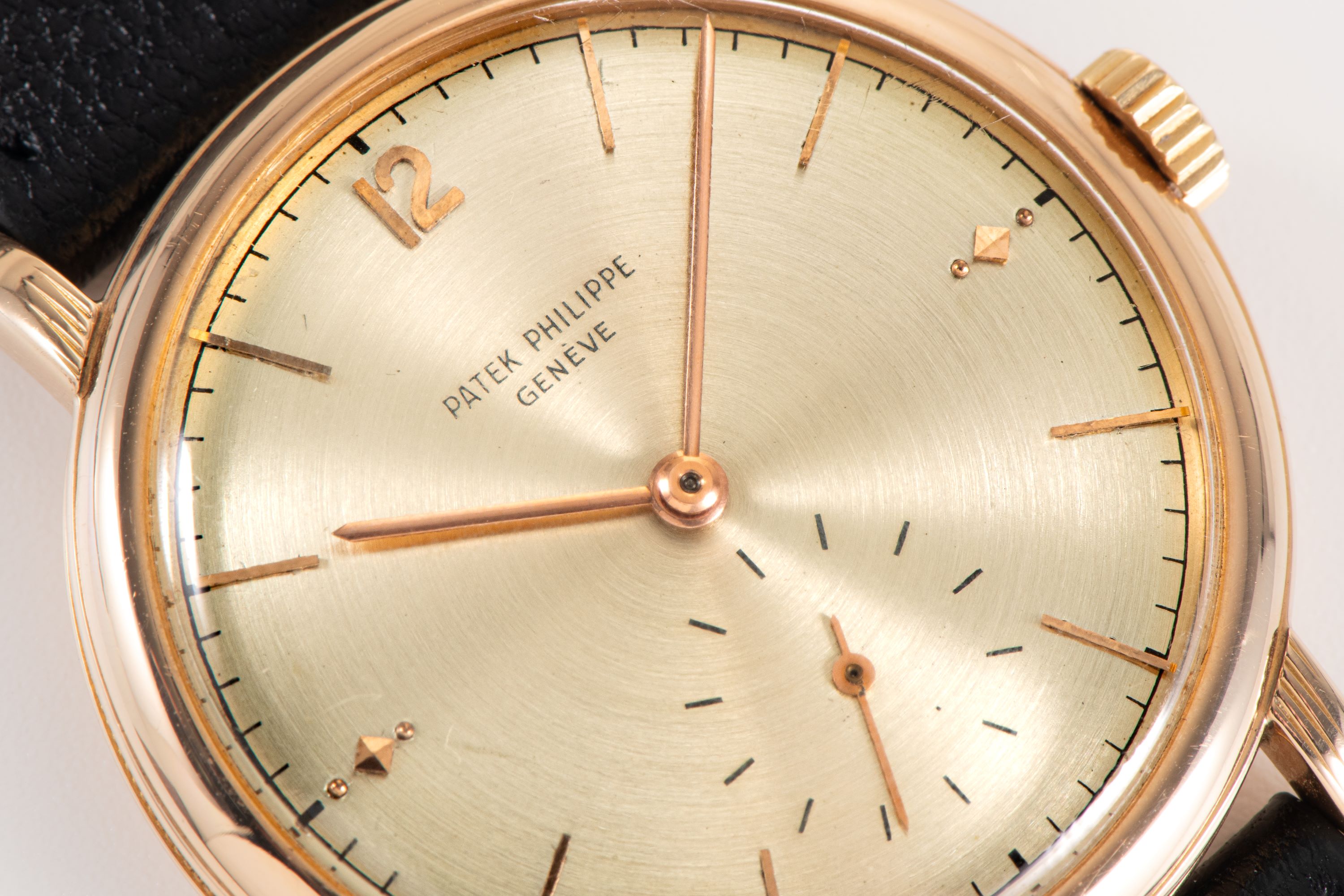 This Patek Philippe Calatrava Ref. 2511 “Empire” in 18k rose gold is one of the rarest and almost unobtainable Calatravas and also one of the largest Calatrava watches of the 1950s. It is believed that from 1951 to 1954 or 1955, only about 120 examples were produced in yellow gold and 100 in rose gold. The large 36.5 mm case of this watch is designed in the Empire style with fluted lugs and caseband, which is extremely rare for Patek Philippe in general – hence the nickname “Empire”. The case was reportedly made by Dubois & Cie in Le Locle and the dial by Stern Frères. The magnificent caliber 12’’’400 with the characteristic Patek Philippe S-shaped central bridge is a feast for the eyes, while the unusual fine adjustment system with flat swan-neck spring and spiral with Breguet overcoil definitely underlines the high technical mastery it embodies.