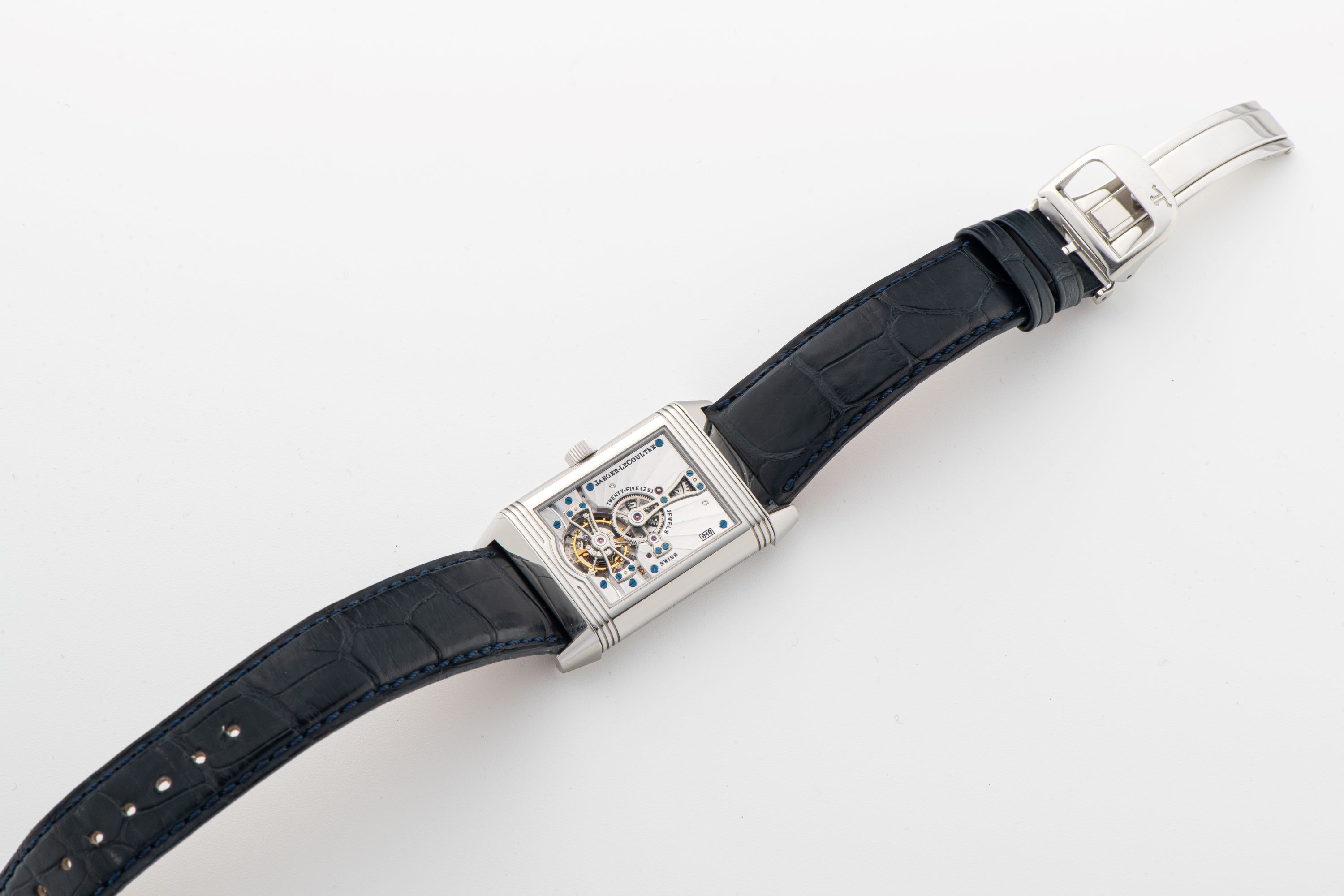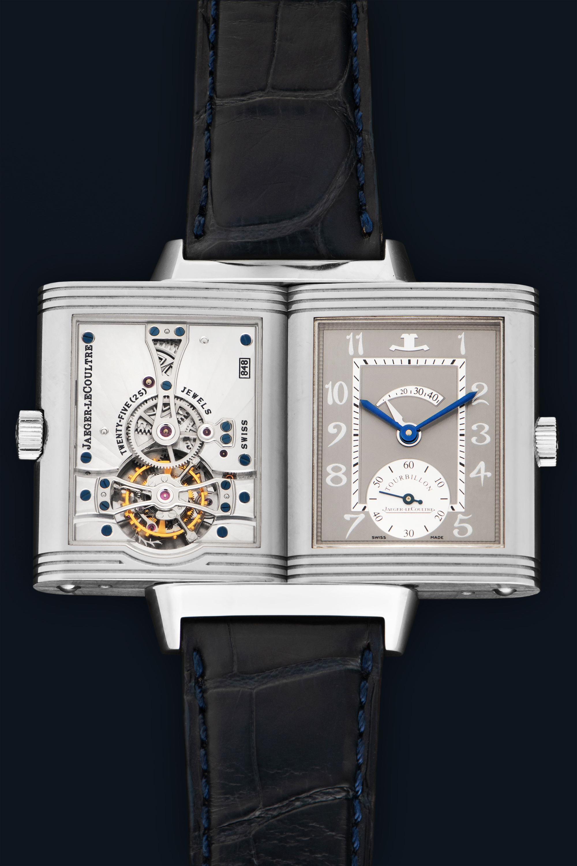 This Jaeger-LeCoultre Reverso Platinum Number Two Tourbillon Ref. 270.6.48 in platinum, produced in 2003 in a limited edition of 500 pieces, is a very beautiful and rare rectangular and reversible platinum wristwatch with a tourbillon visible on the back of the swivel case. The caliber 848 of this watch has the characteristic shape of the tourbillon bridge, which was inspired by the bridge of Jaeger-LeCoultre’s historic caliber 170 pocket watch. It was the brand’s first tourbillon, developed in 1946 for use in observatory chronometers, while this Reverso Platinum Number Two is only the second Reverso watch to feature a tourbillon. The combination of the rare Reverso case in platinum, whose design was developed in 1931, with the rare execution of the mainplate and bridges in 18k white gold, undoubtedly contributes to the appeal of this watch.