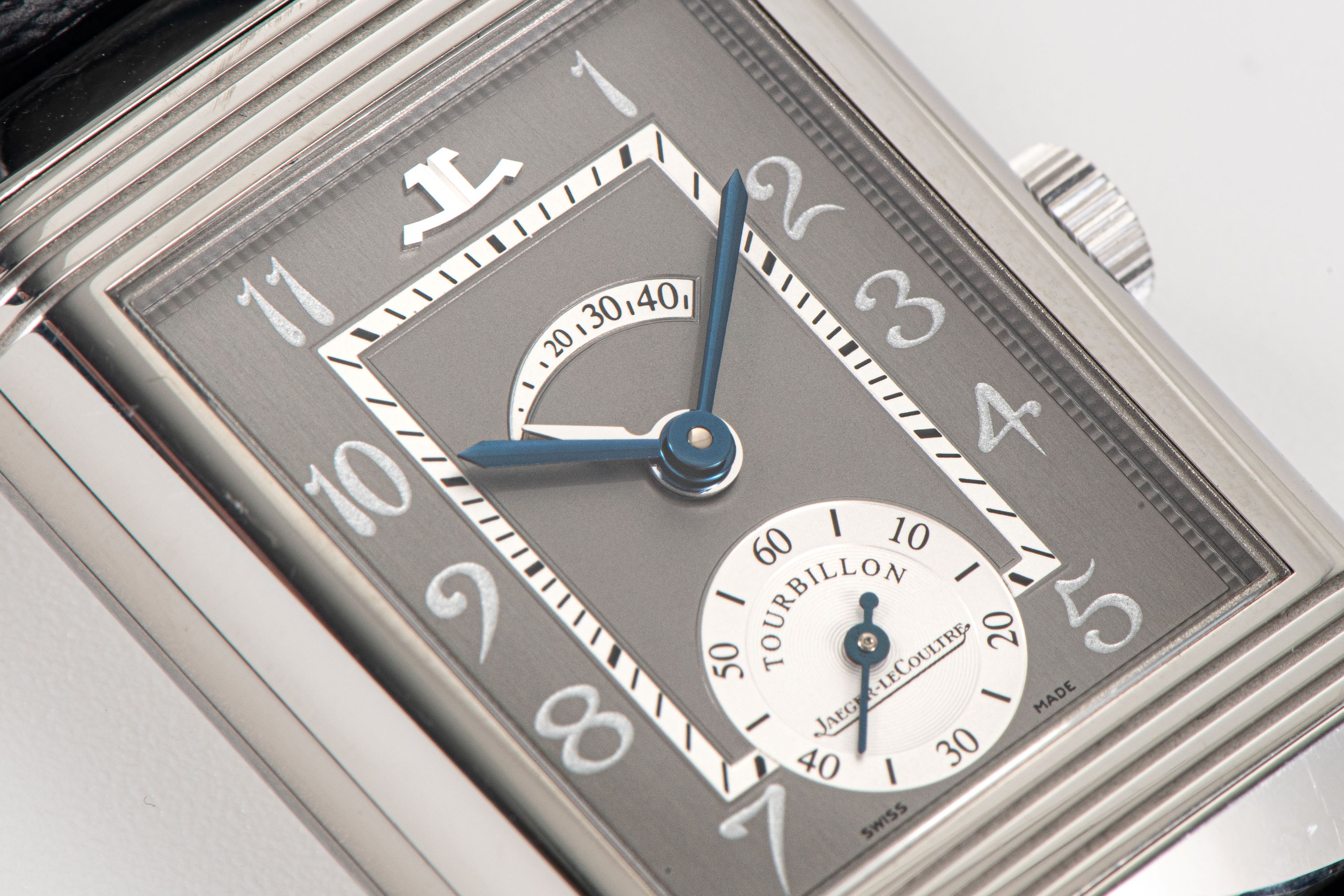 DialDial side: Grey dial with silver numerals, power reserve at 12 o'clock, heat-blued hands, small seconds at 6 o'clock, signed 'Jaeger LeCoultre Tourbillon' at 6 o'clock