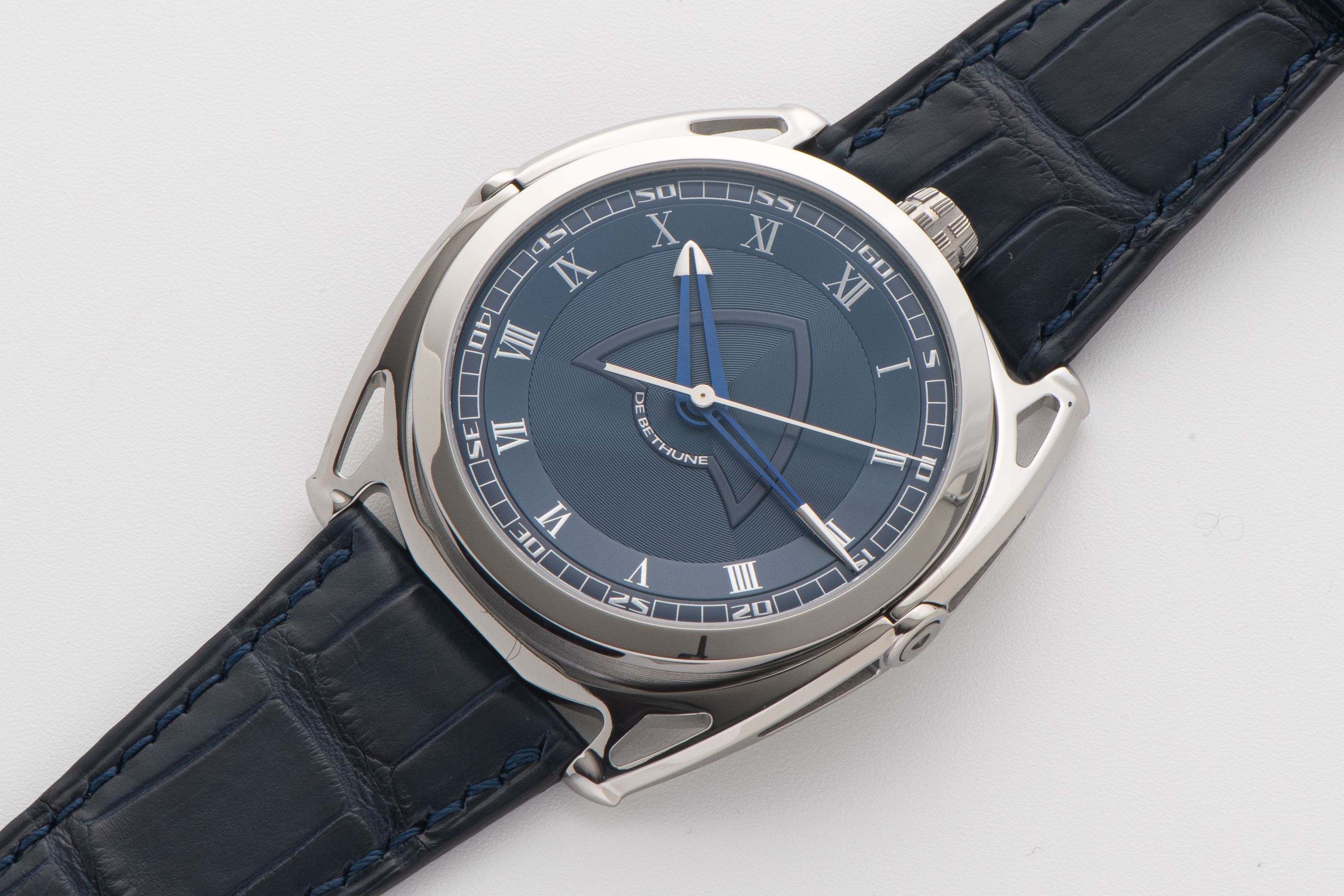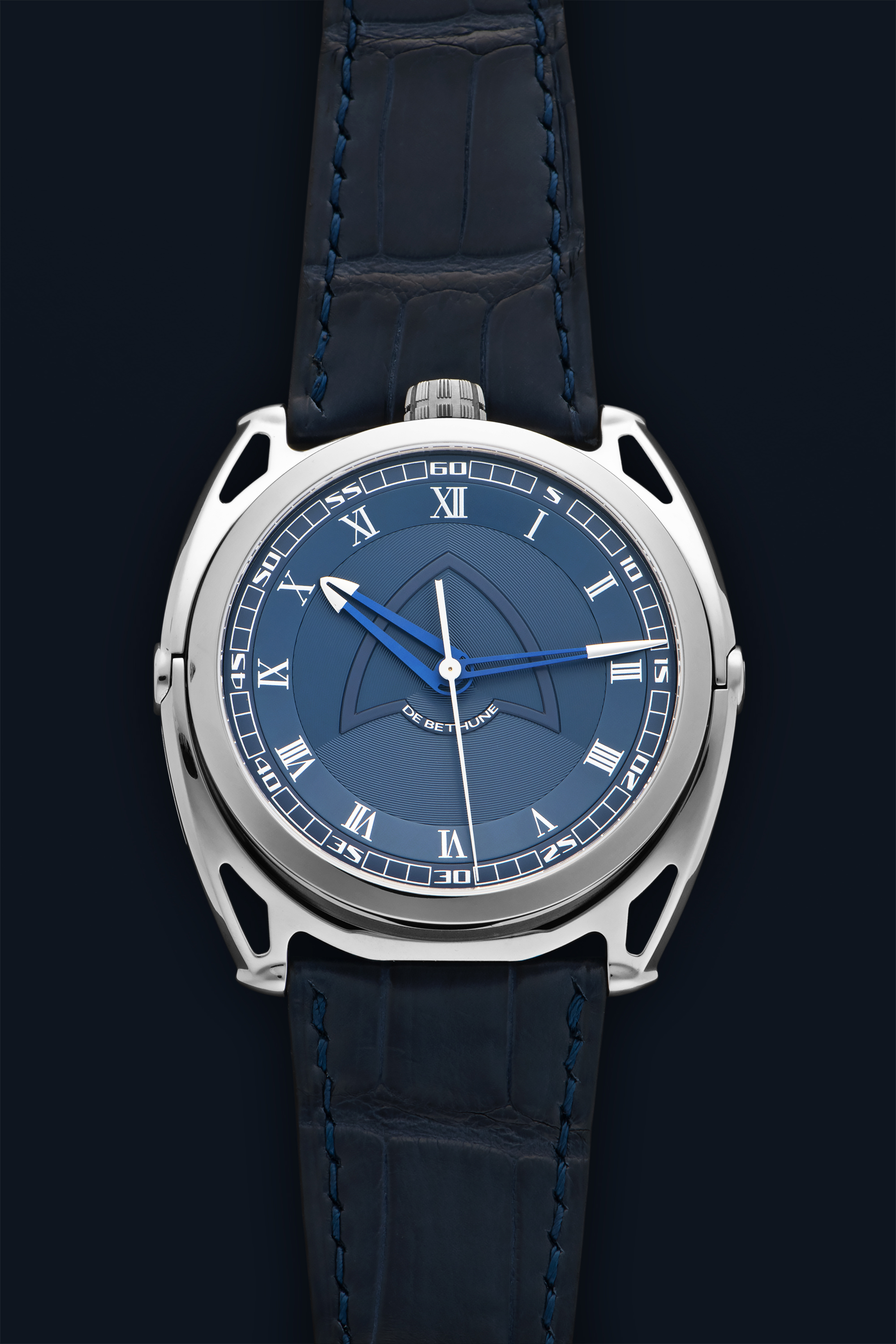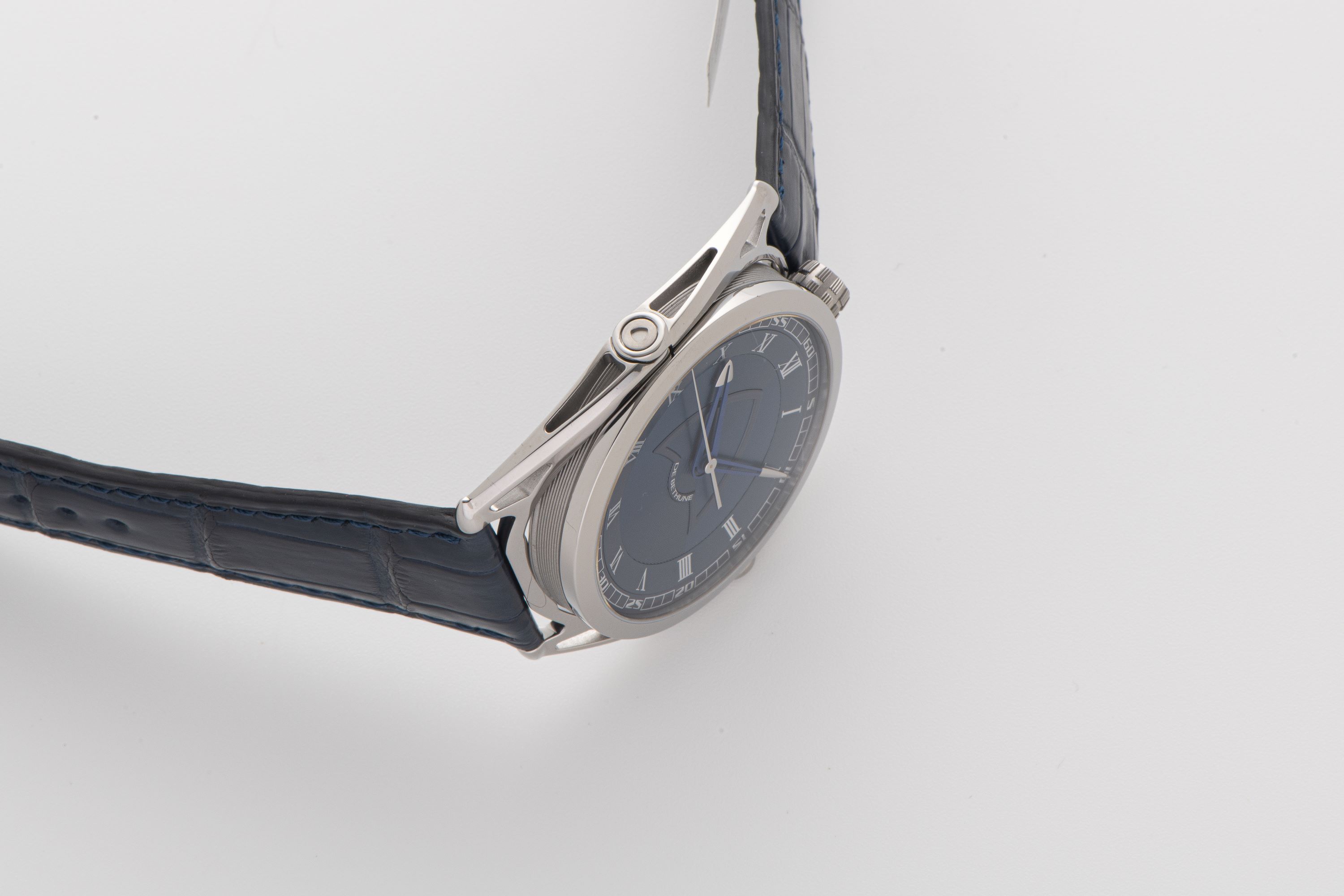 DialBlue partial guilloche dial with silver numerals, heat-blued skeletonized hands, signed 'De Bethune' below the handstack