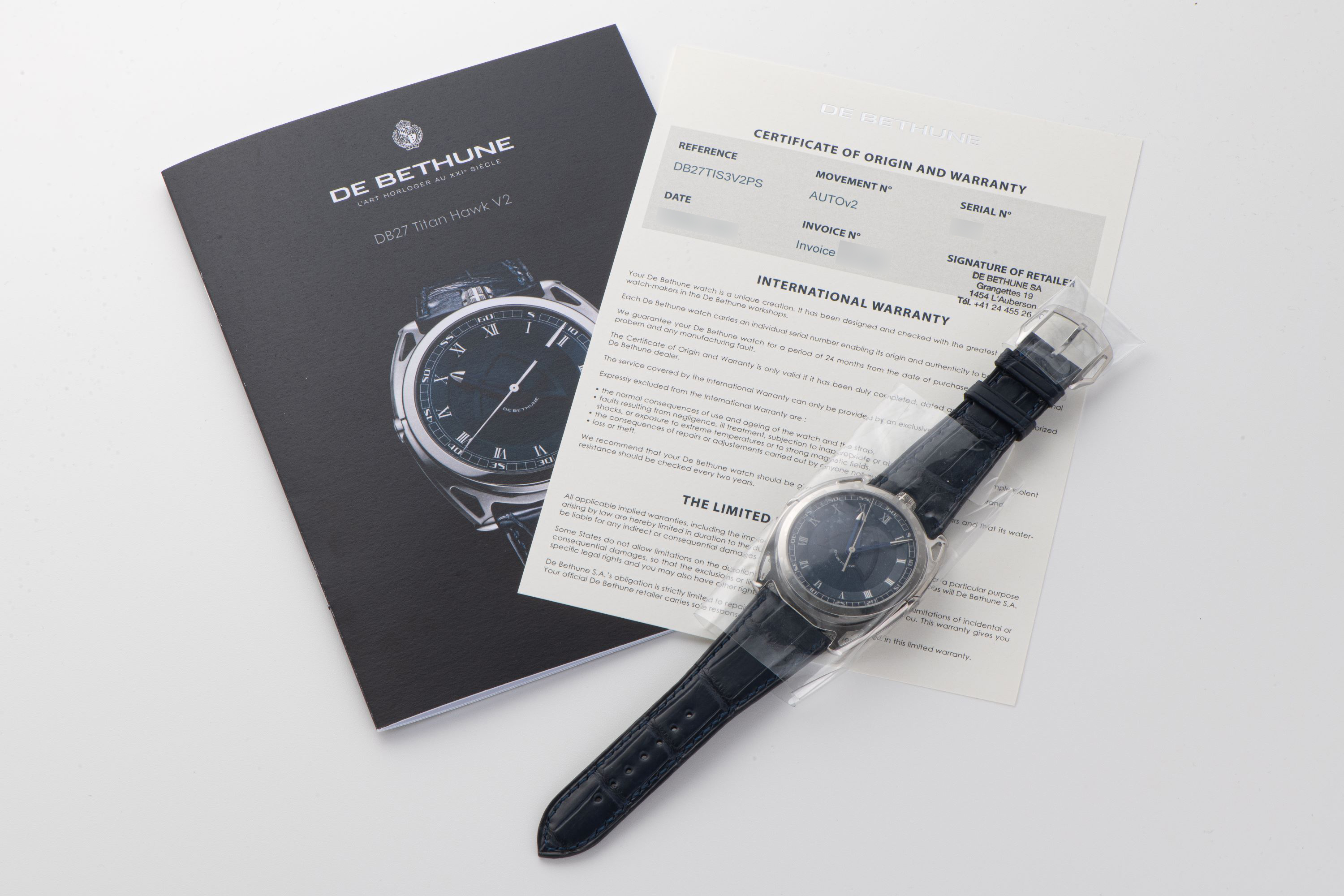 StrapDark blue alligator leather strap with De Bethune pin buckle in titanium