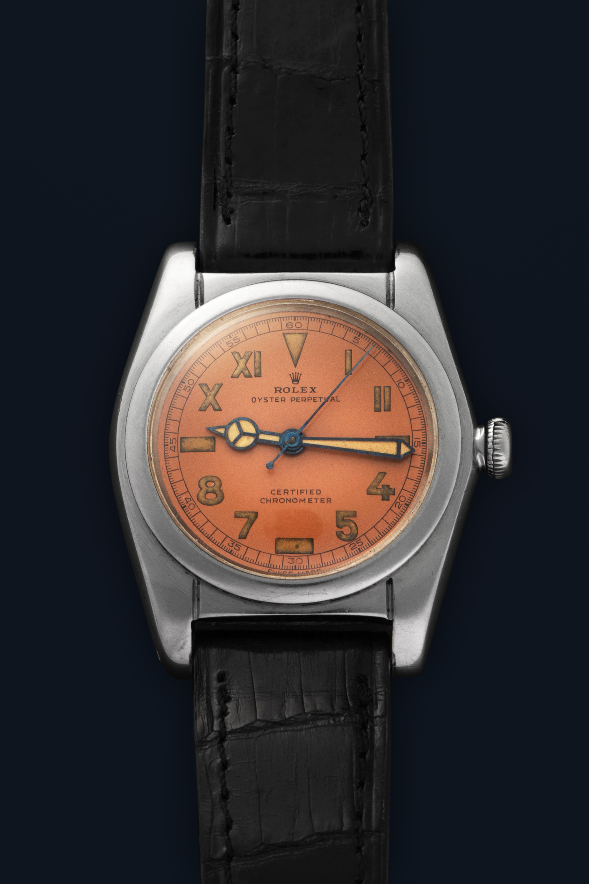 DialSalmon dial with radium indices, heat-blued 'Mercedes' hands, signed 'Rolex' at 12 o'clock