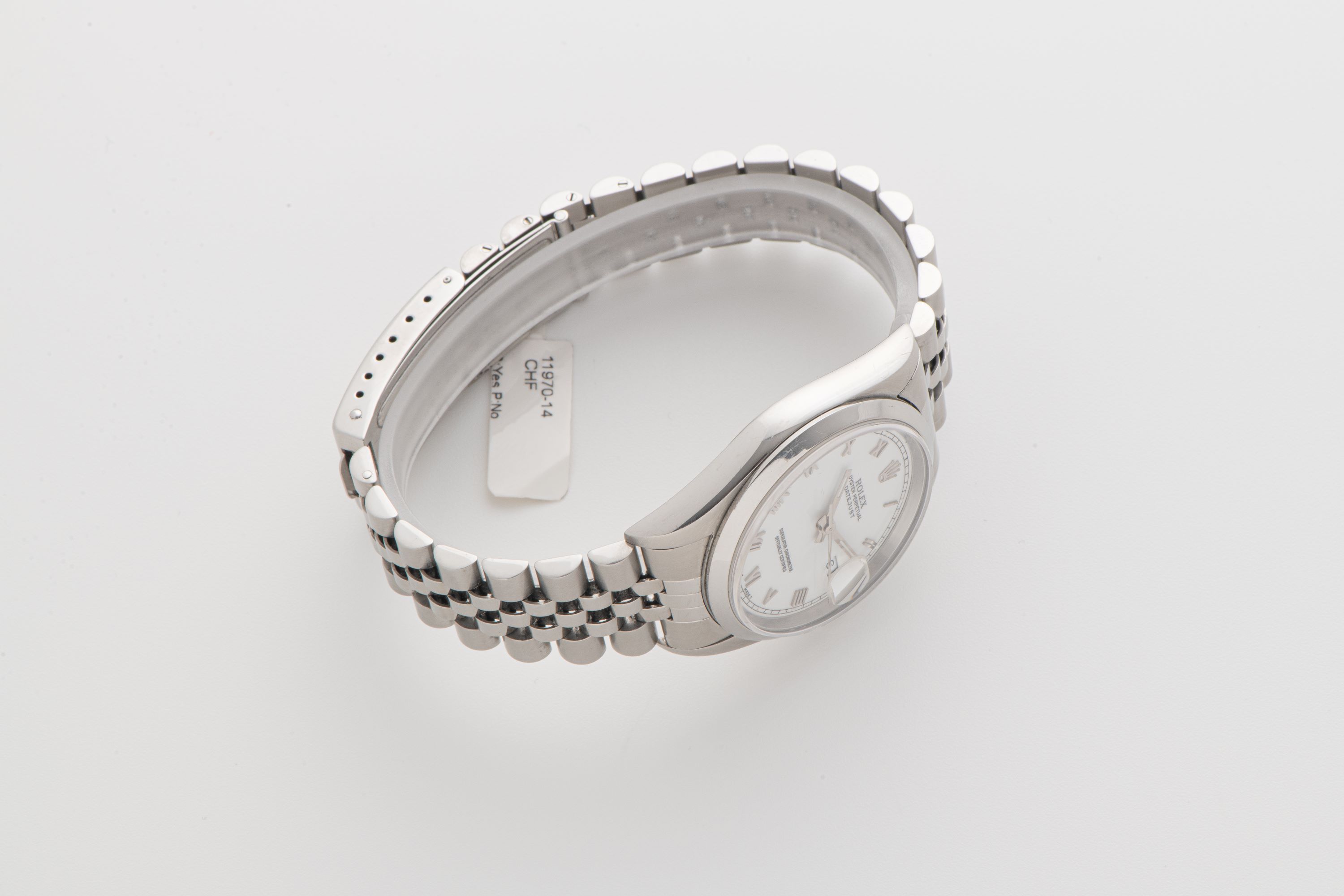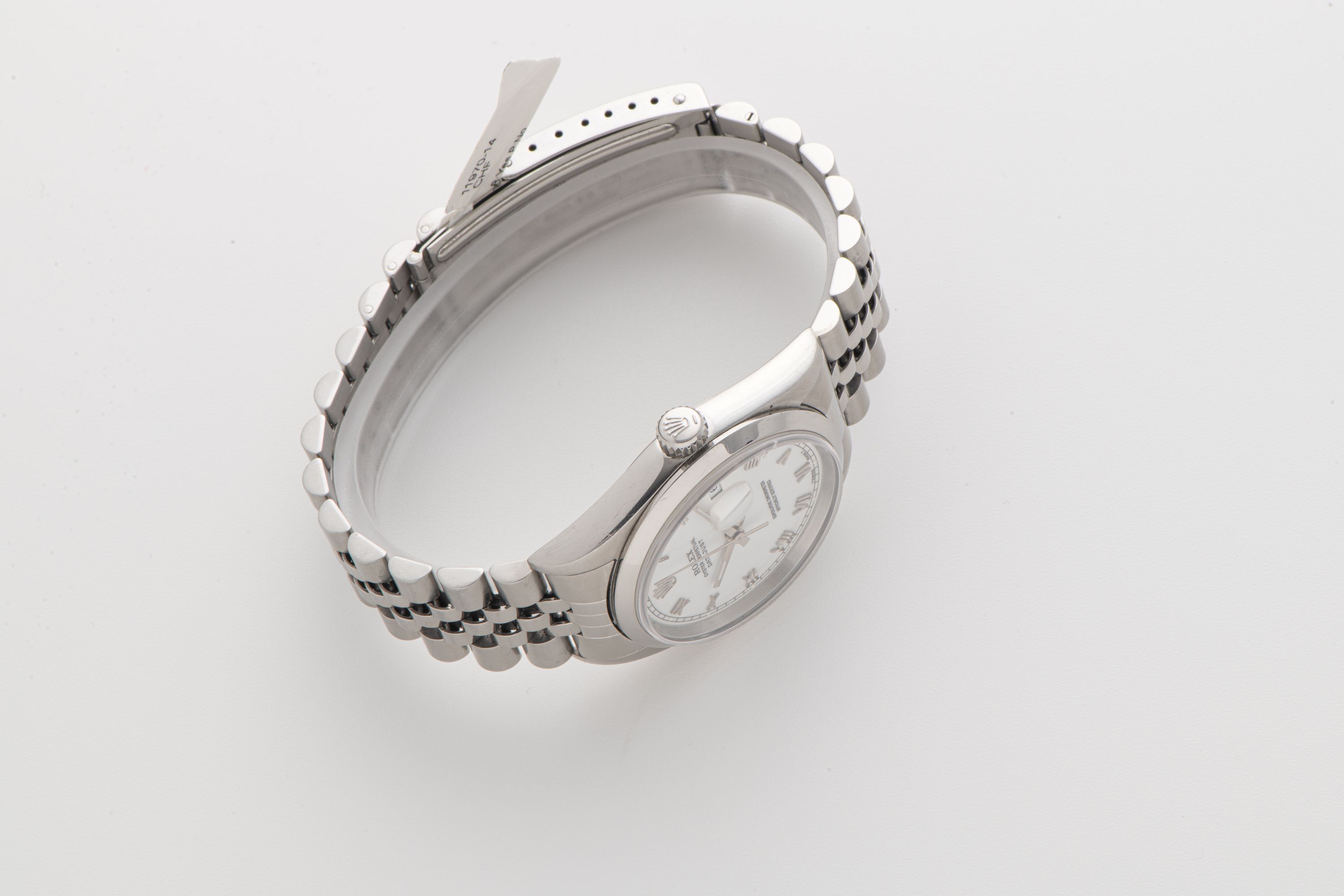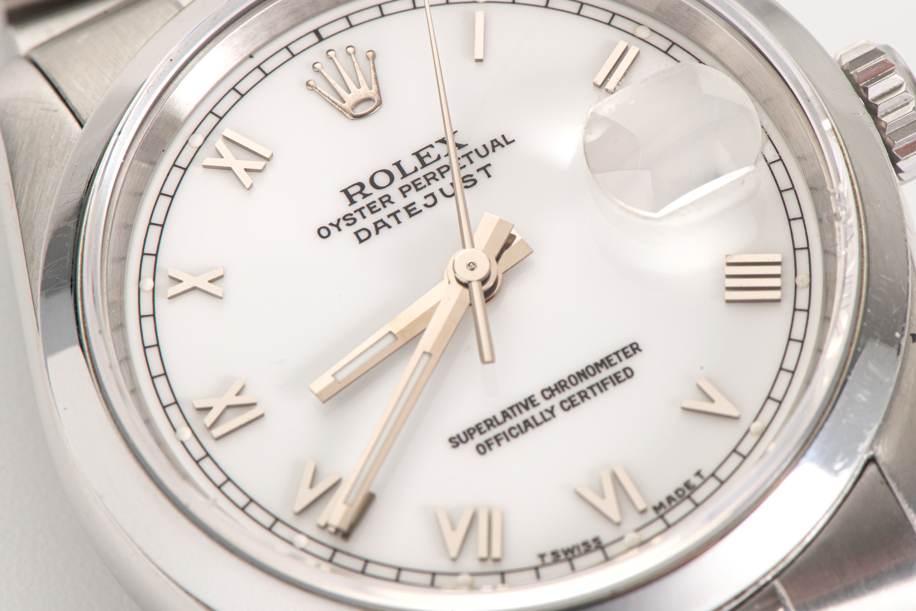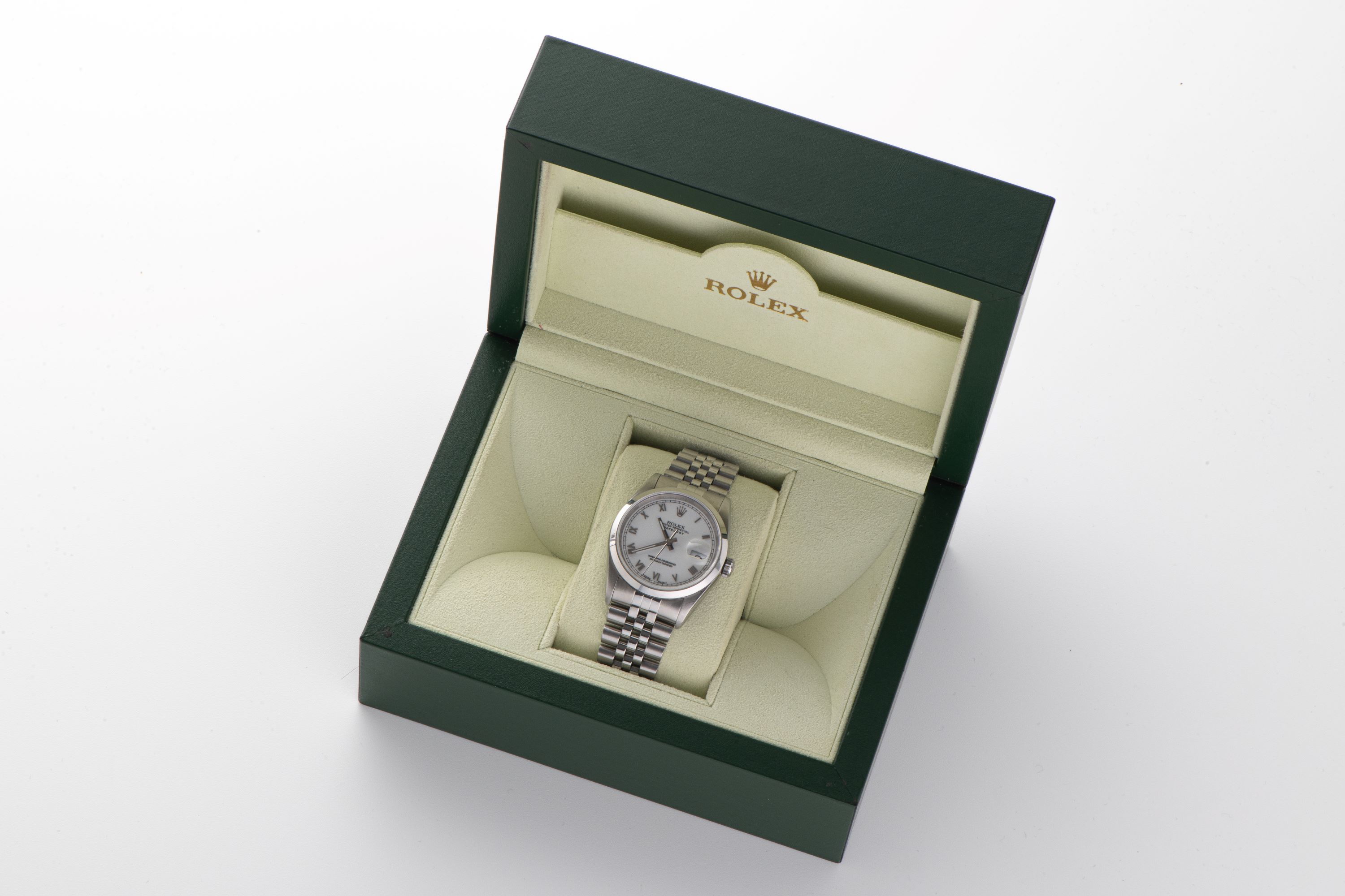 DialWhite lacquer dial with applied roman numerals, white gold tritium hands, magnified date window at 3 o'clock, signed 'Rolex' at 12 o'clock