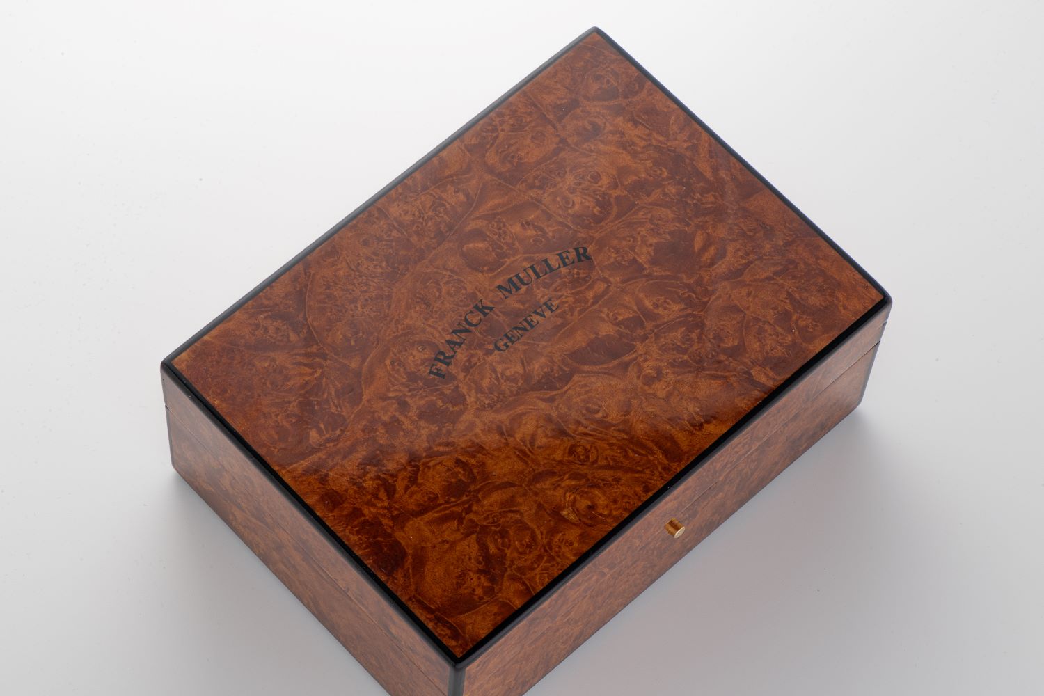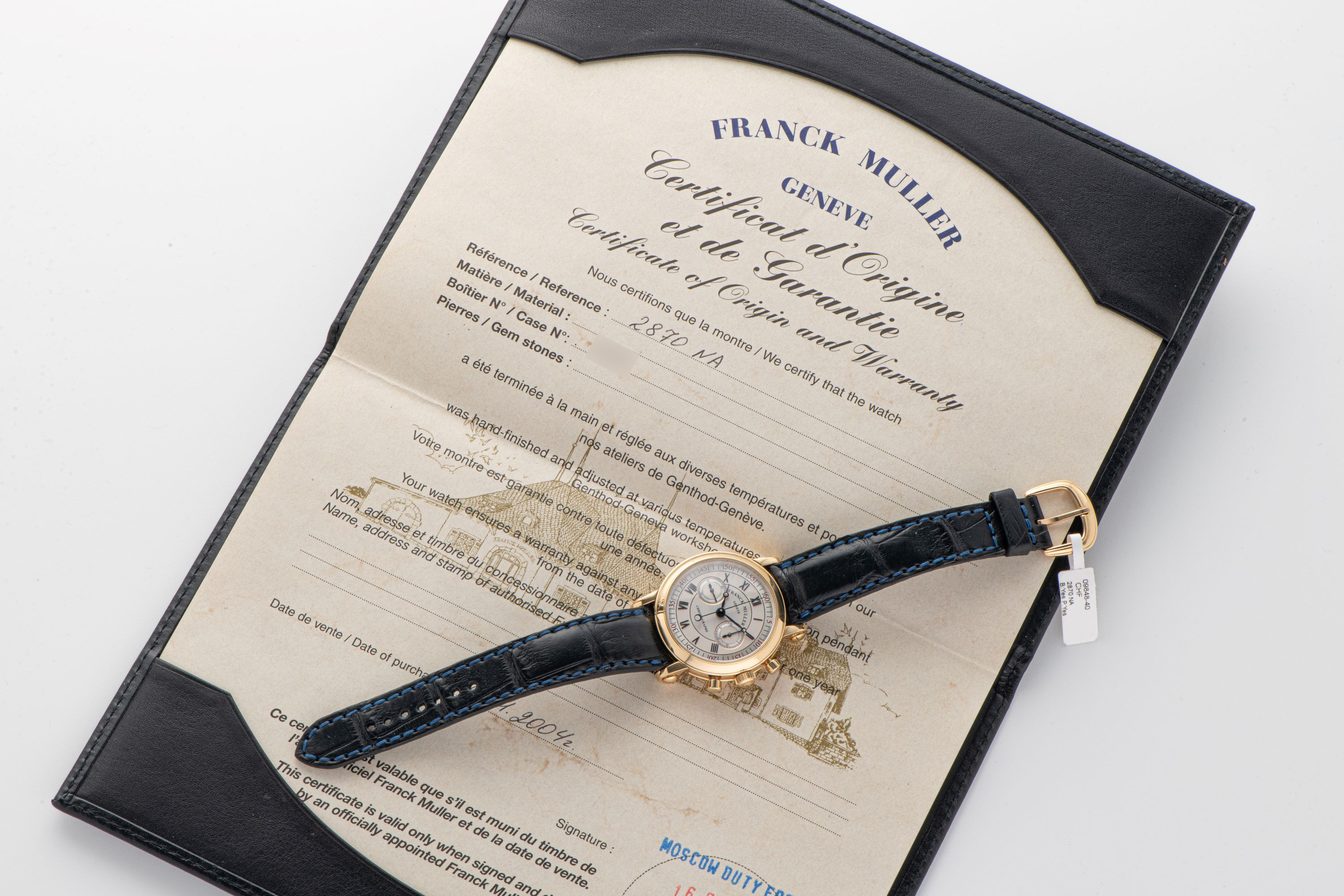 DialMatt silvered dial, signed Franck Muller Geneve, applied blued Roman numerals, blued Breguet hands, recessed counters with grooved outlines: 30-minute at 3 o’clock, small seconds at 9 o’clock, sunburst peripheral minute/seconds track with 5-minute Arabic numerals in red
