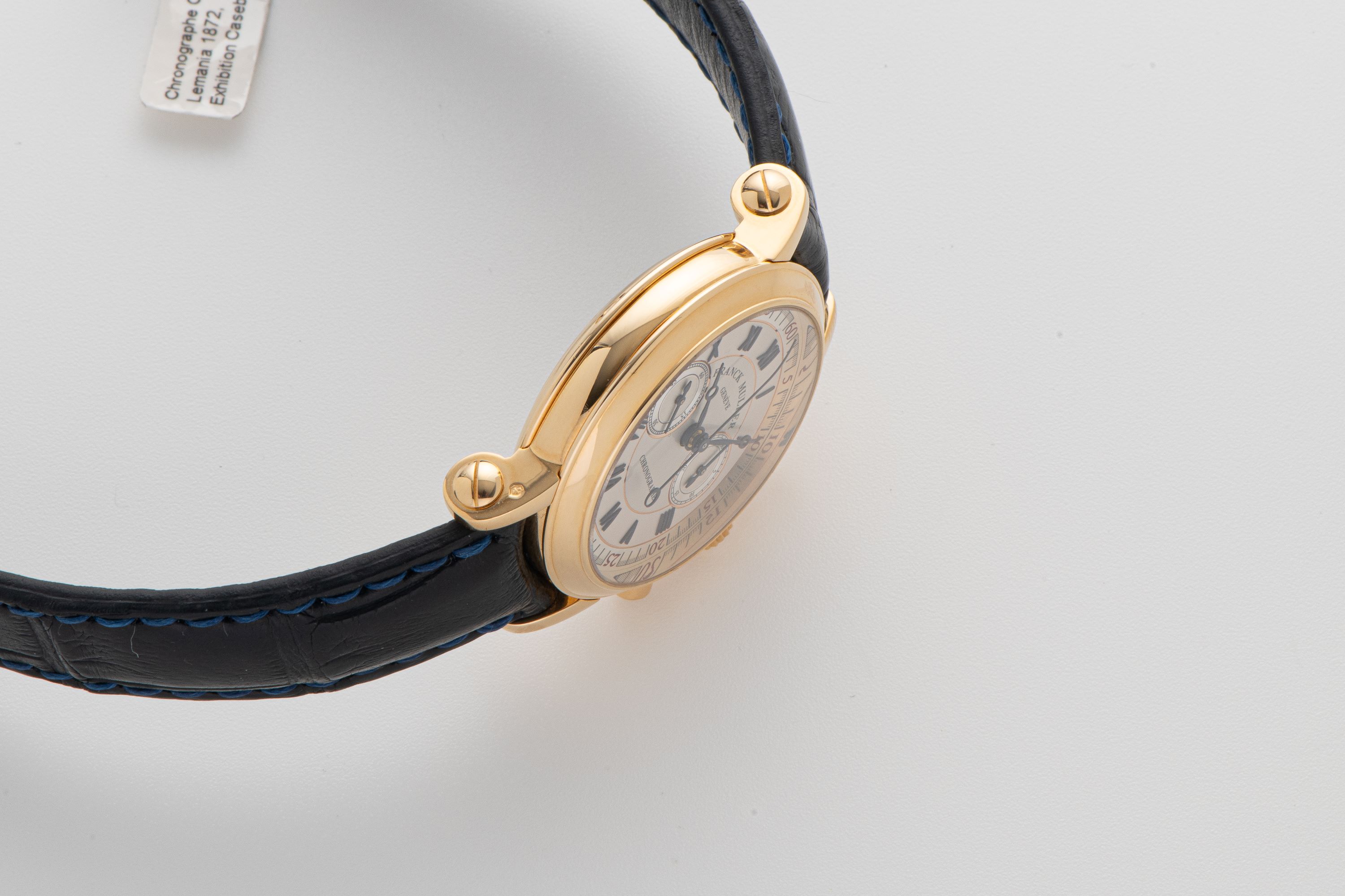 MovementHand-wound mechanical movement, rhodium plated, bridges with cotes de Geneve, mainplate with perlage, cam-actuated lateral clutch chronograph, functions: hours, minutes, small seconds, chronograph with minute counter and central chronograph seconds hand