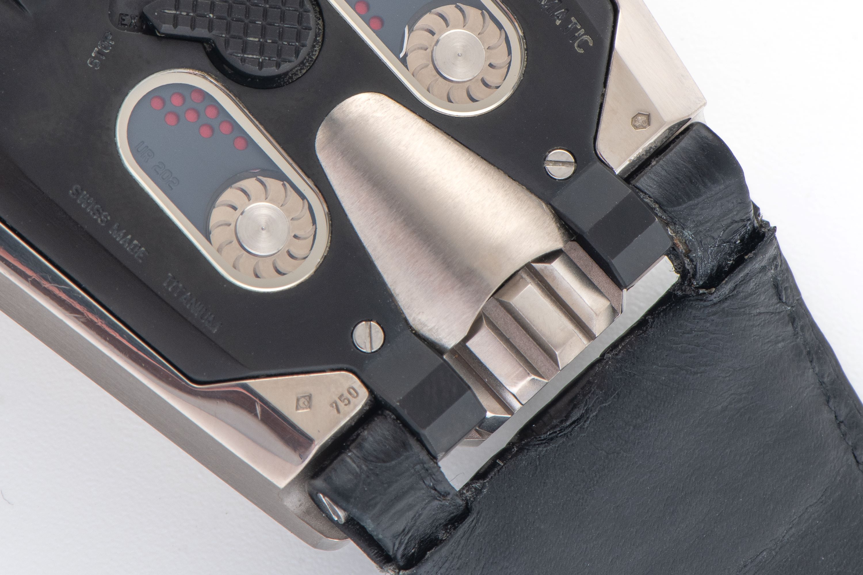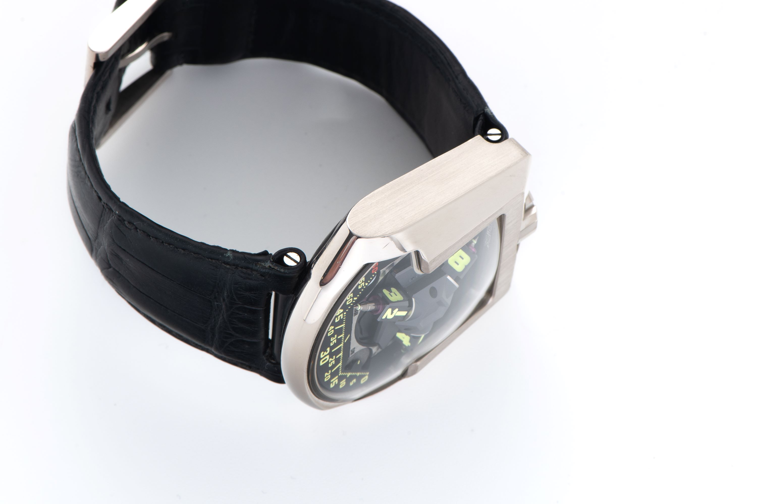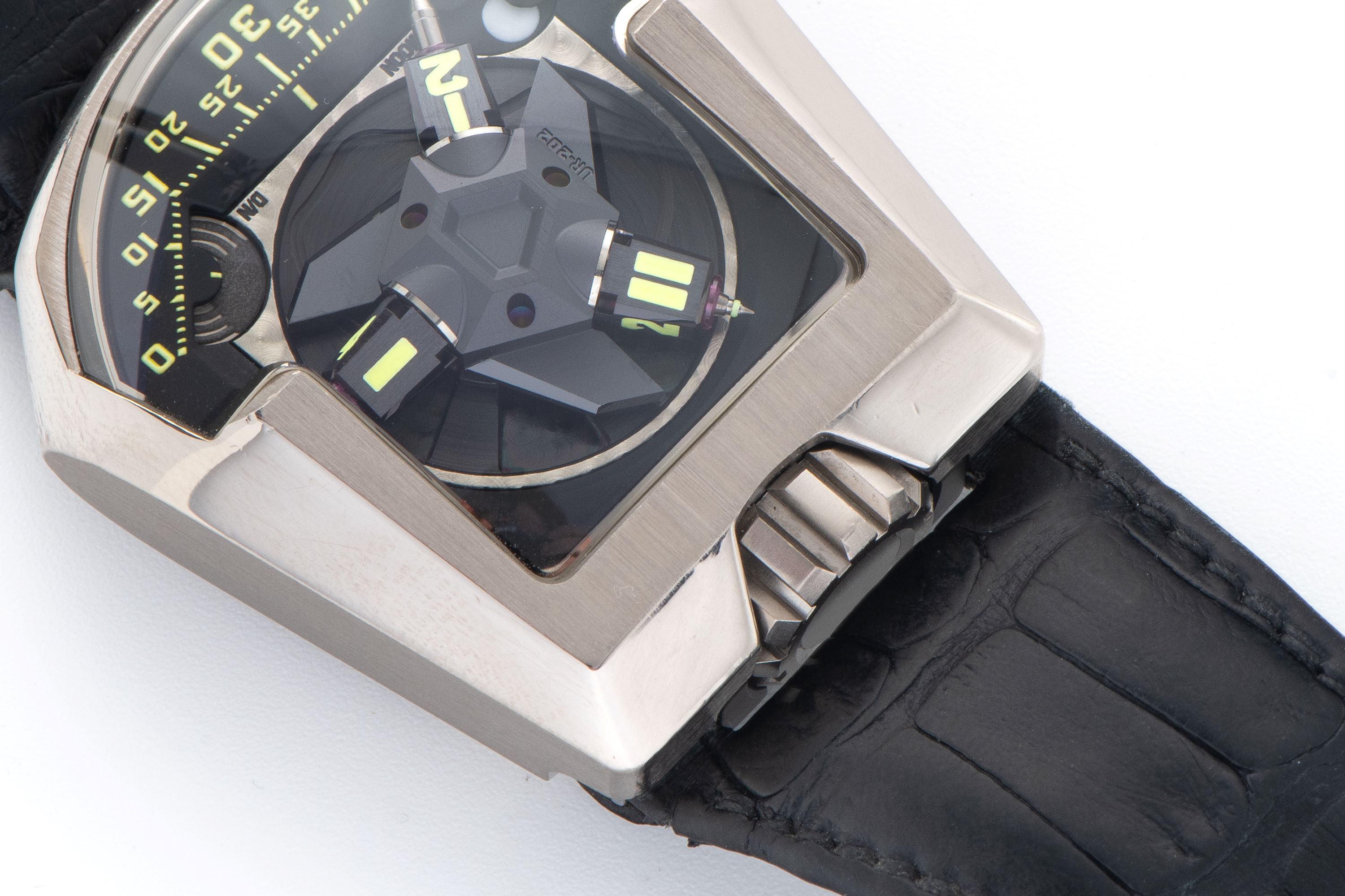 StrapBlack alligator leather strap with Urwerk pin buckle in 18k white gold