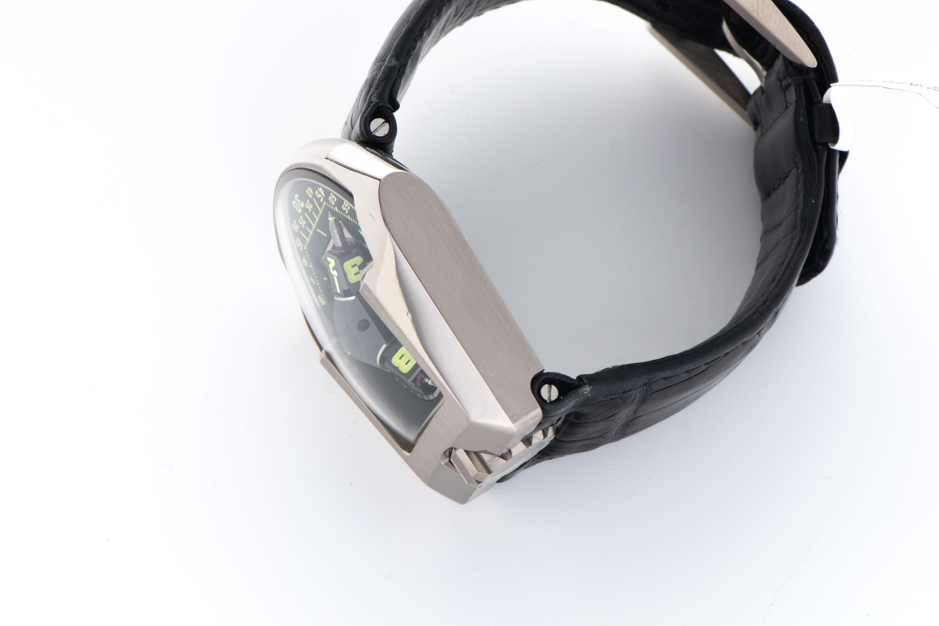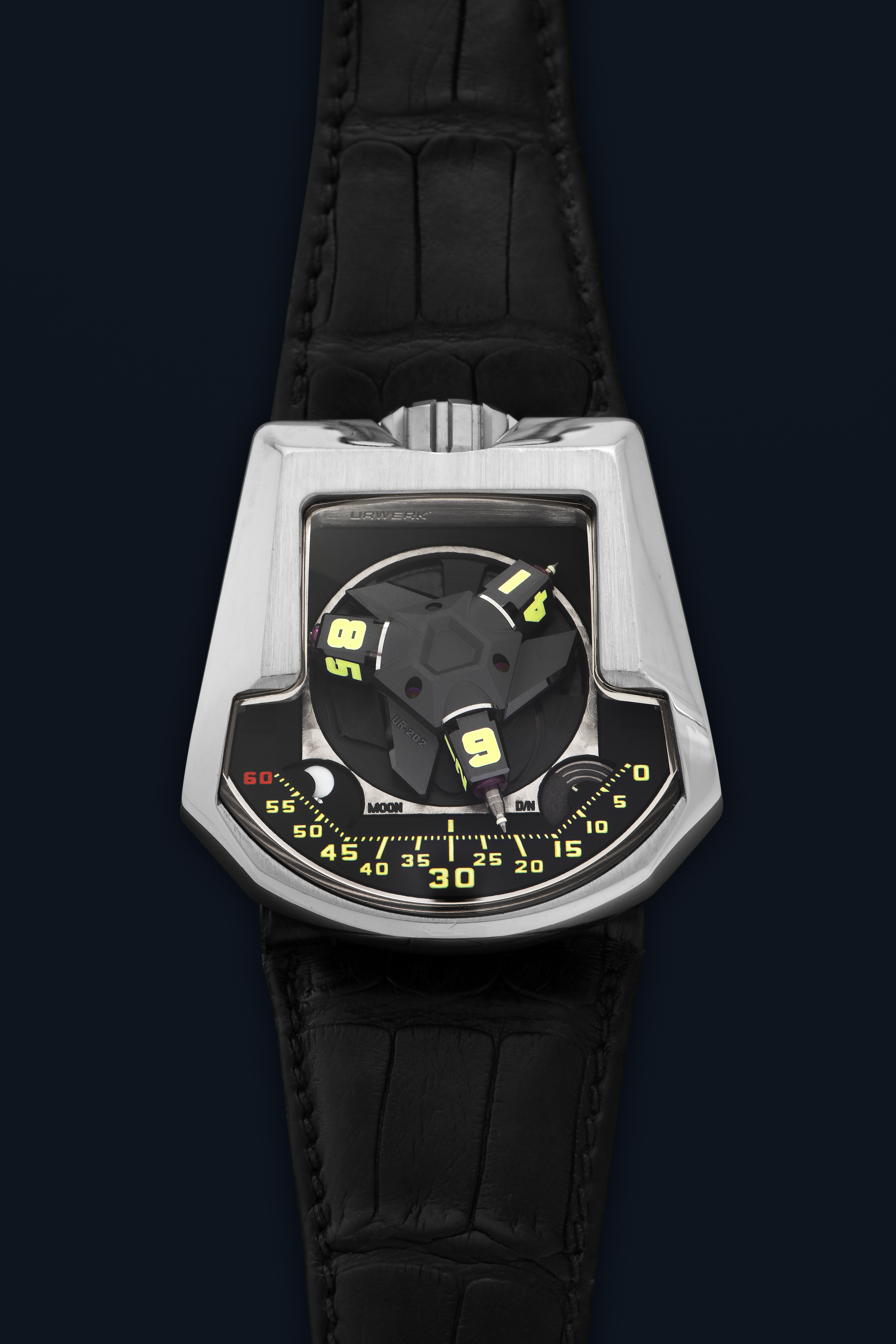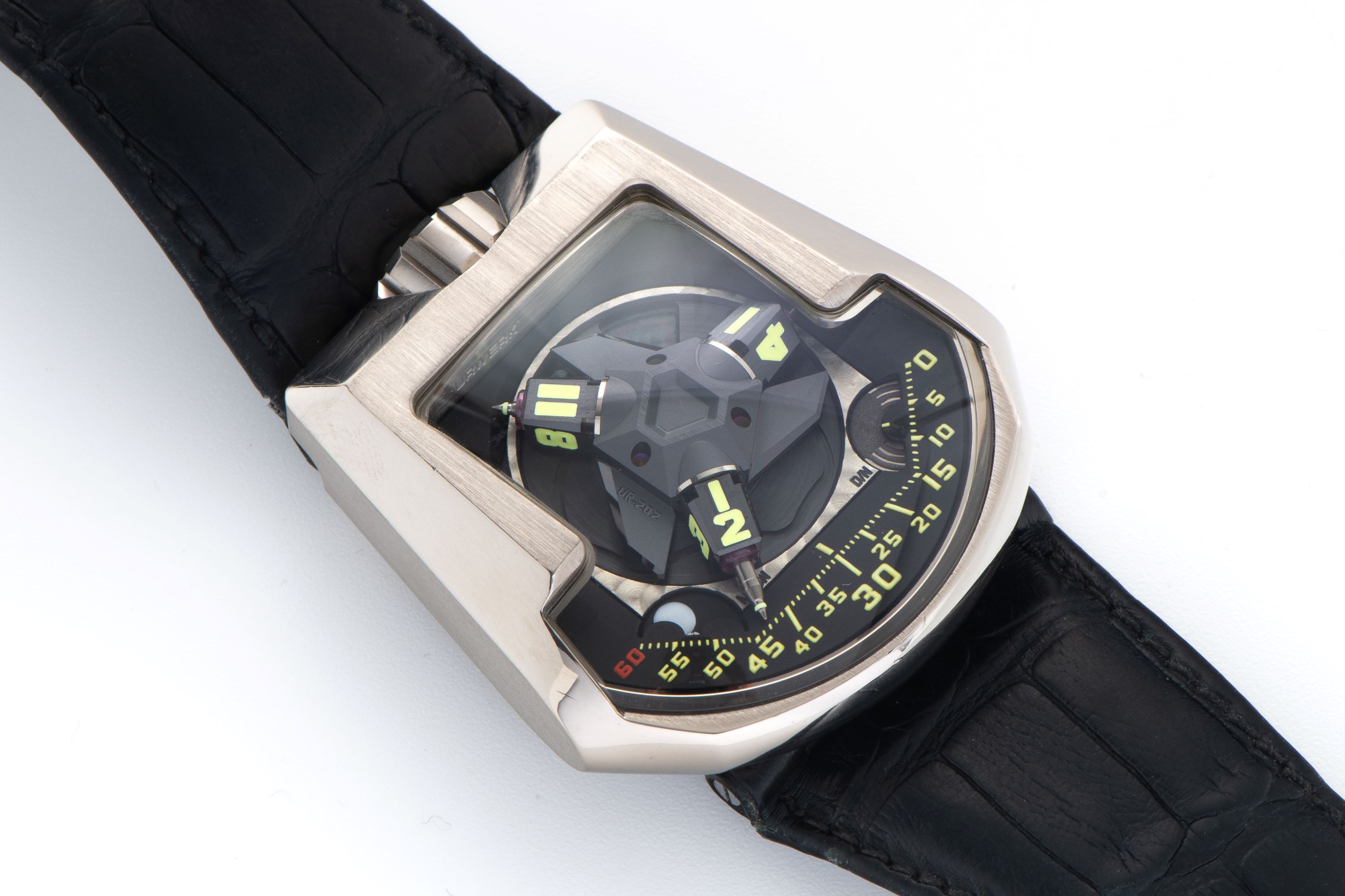 StrapBlack alligator leather strap with Urwerk pin buckle in 18k white gold