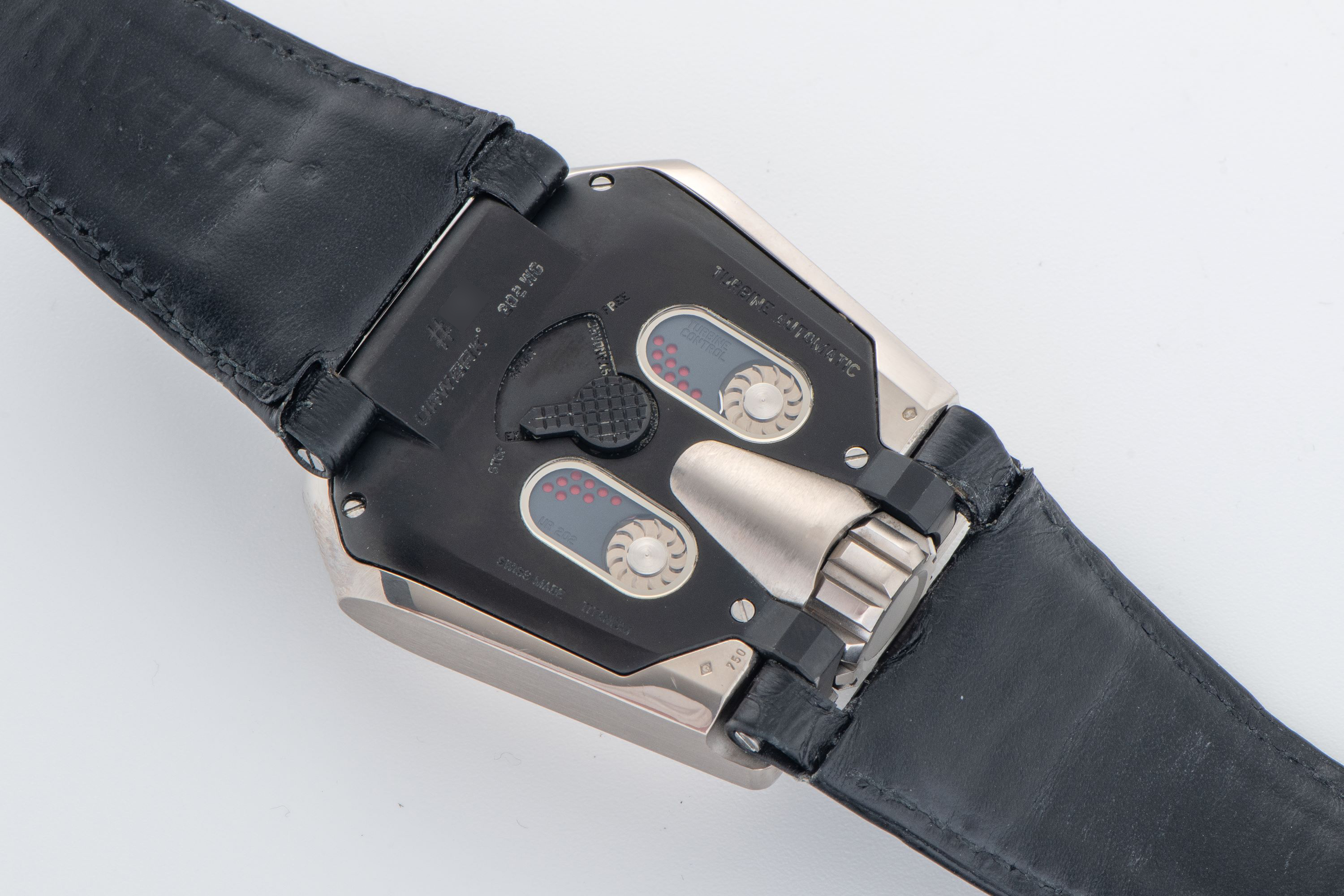 CaseRounded trapezoid case in 18k white gold with custom crystal, crown at 12 o'clock