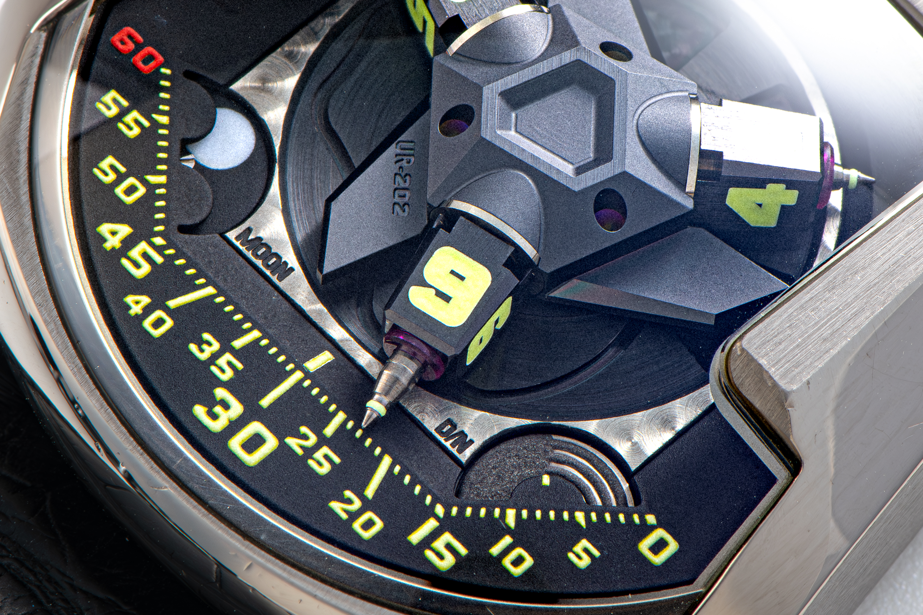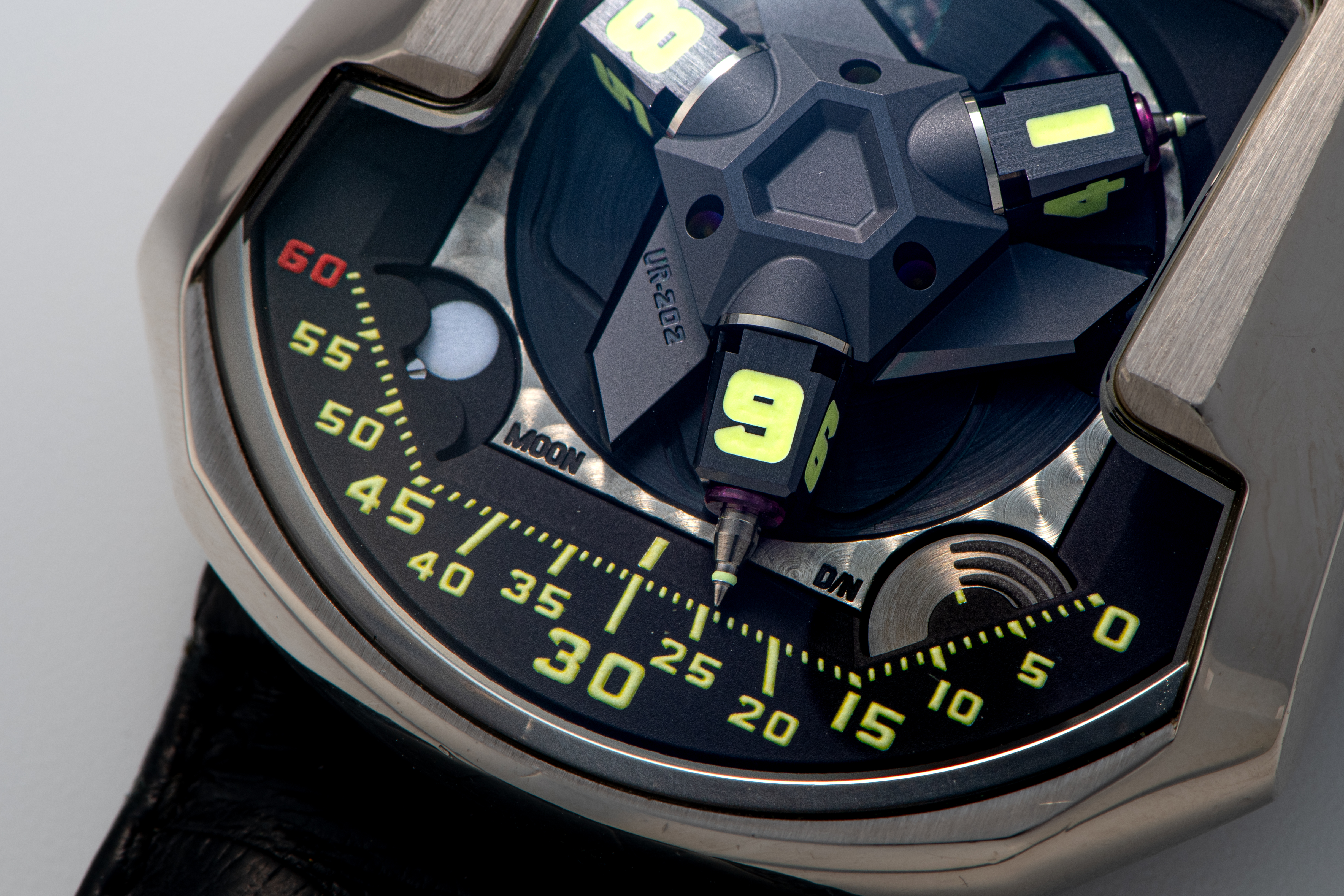 DialOpen dial with 'Satellite' time display, luminous numerals, minute track at 6 o'clock, moonphase on the left, day/night indicator on the right side