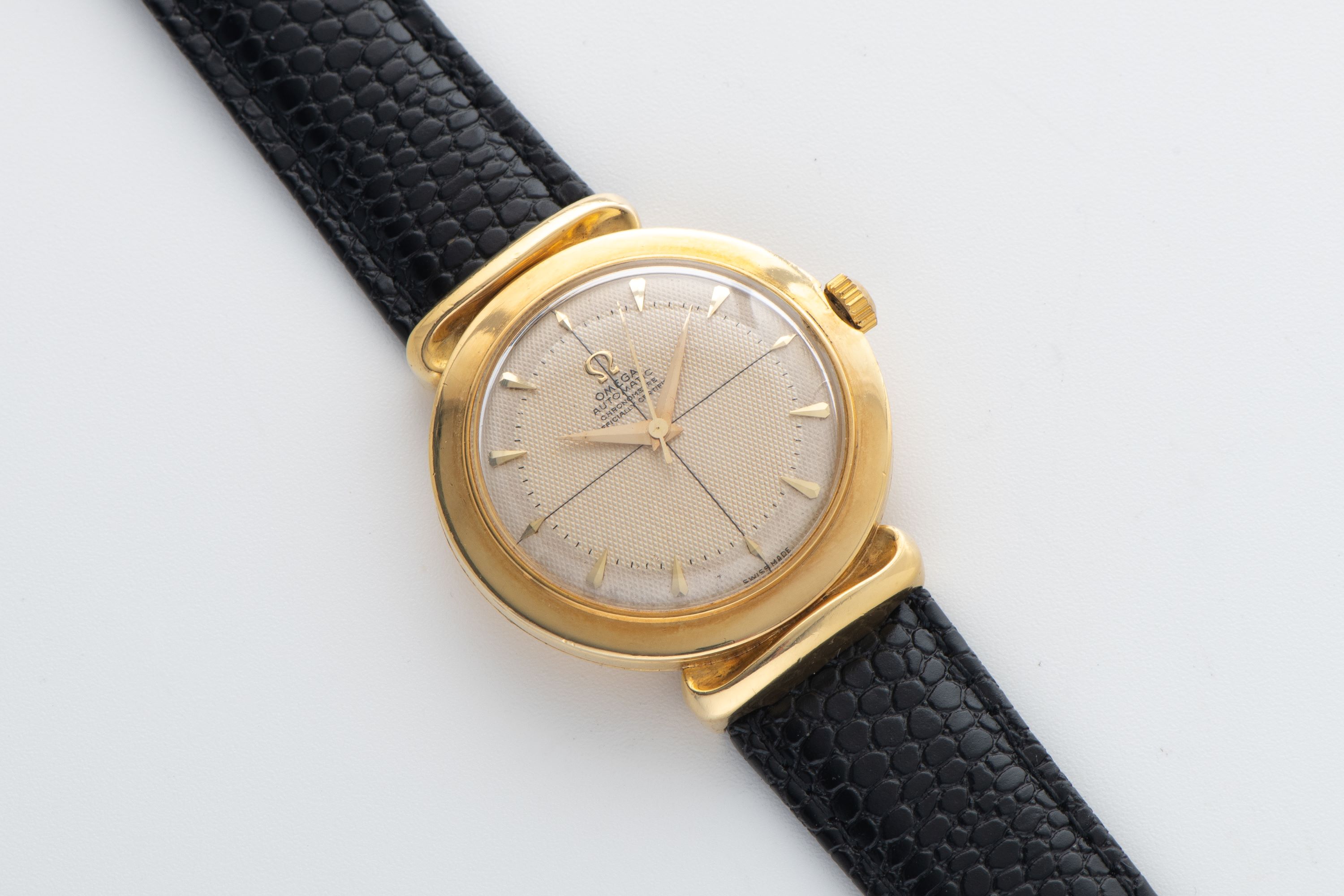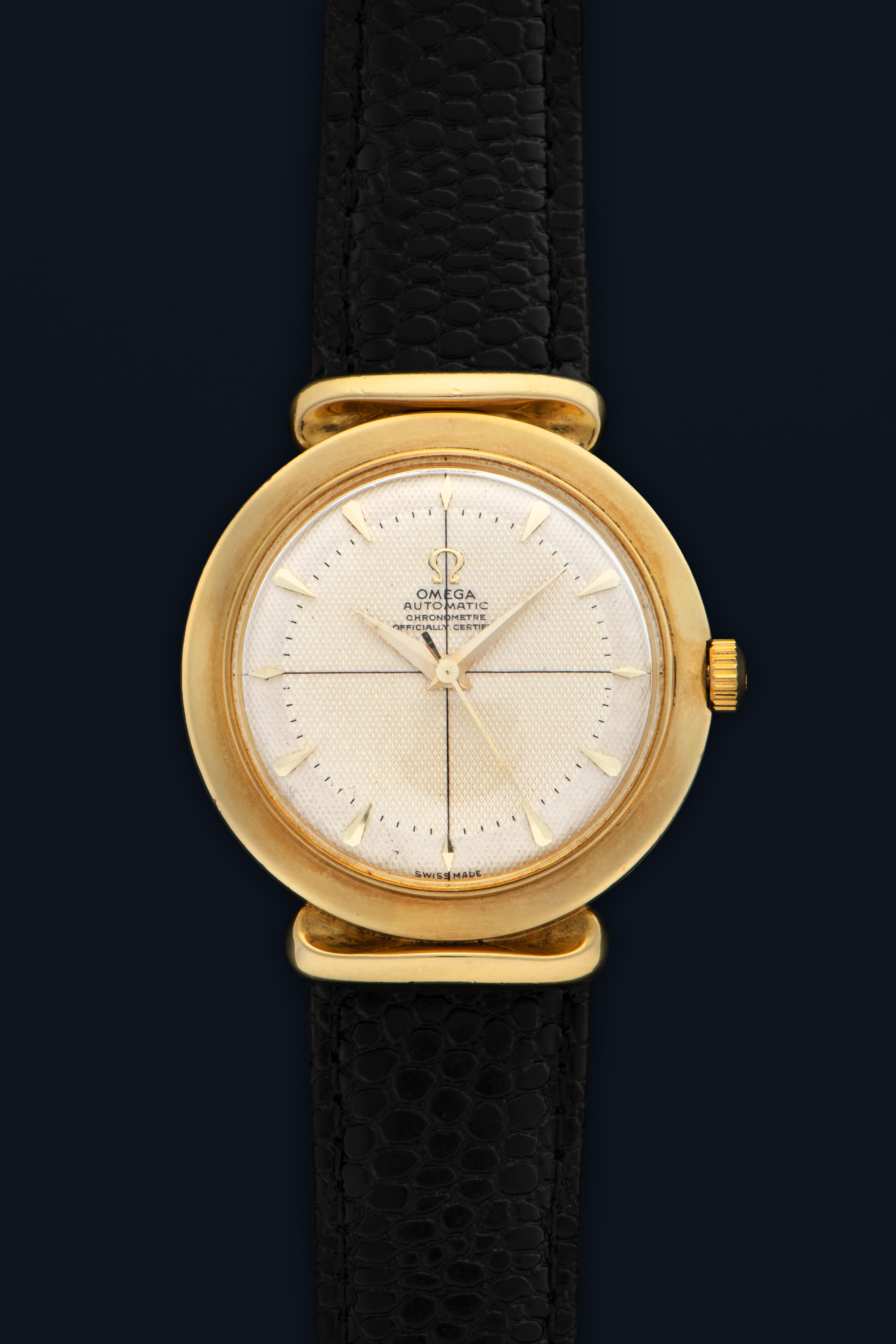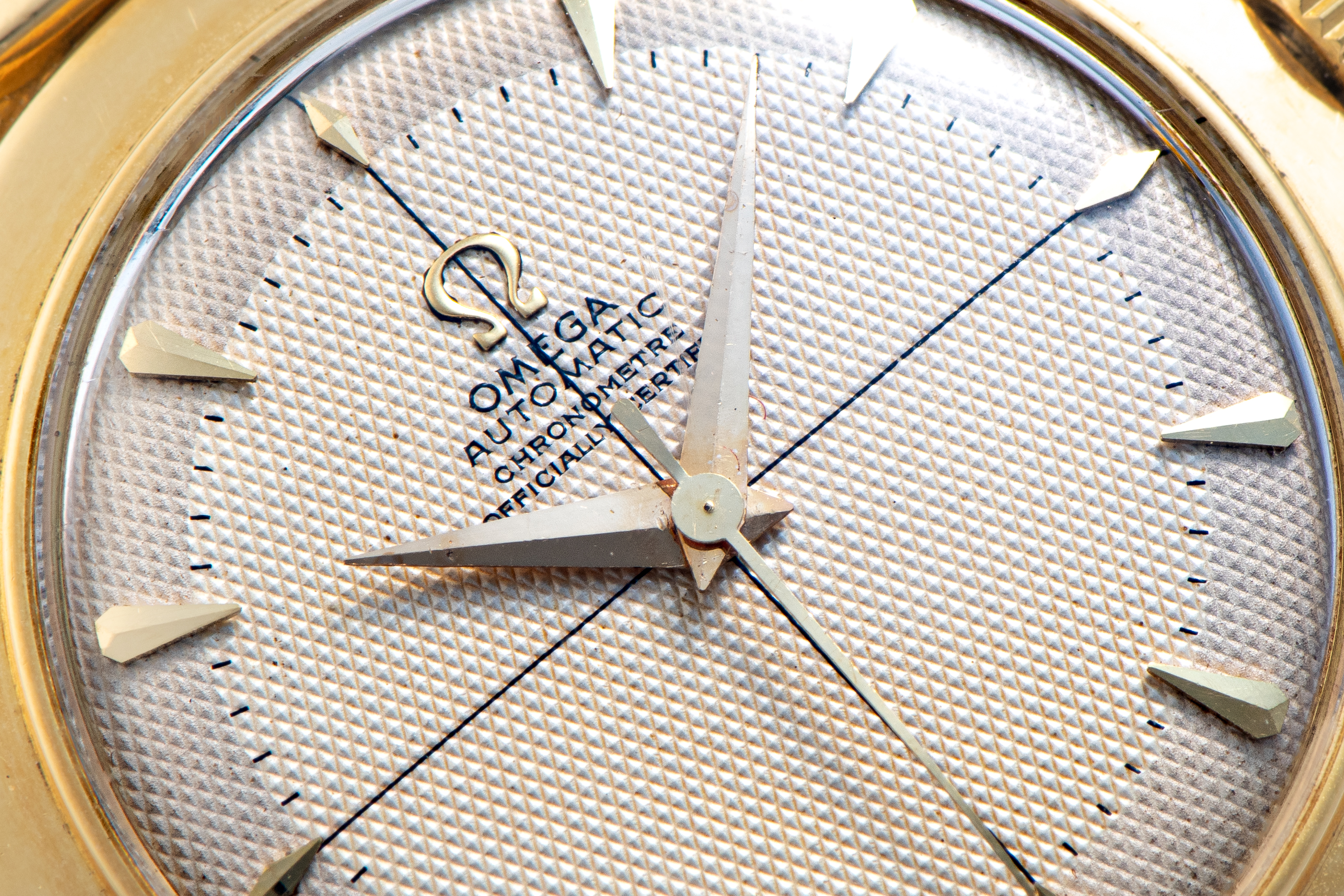DialCream waffle dial with applied indices, dauphine hands, sector dial, signed 'Omega' at 12 o'clock