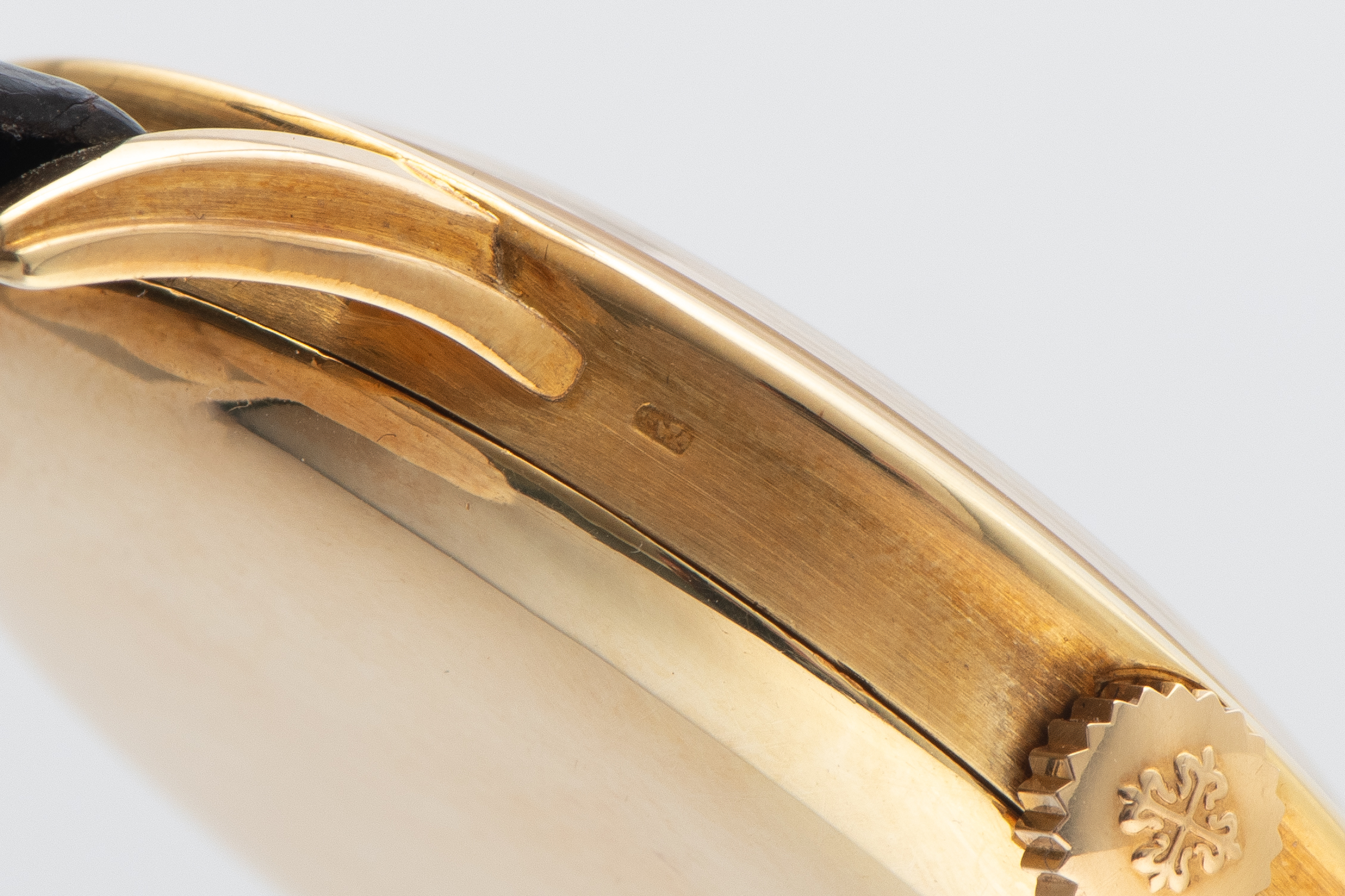 CaseRound case in 18k yellow gold with sculpted flanks and lugs, solid caseback, winding crown at 3 o'clock