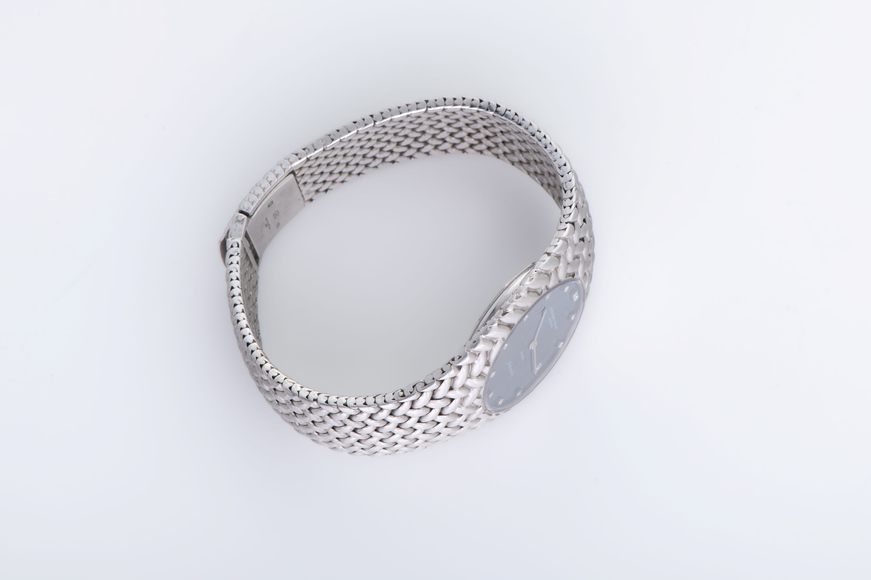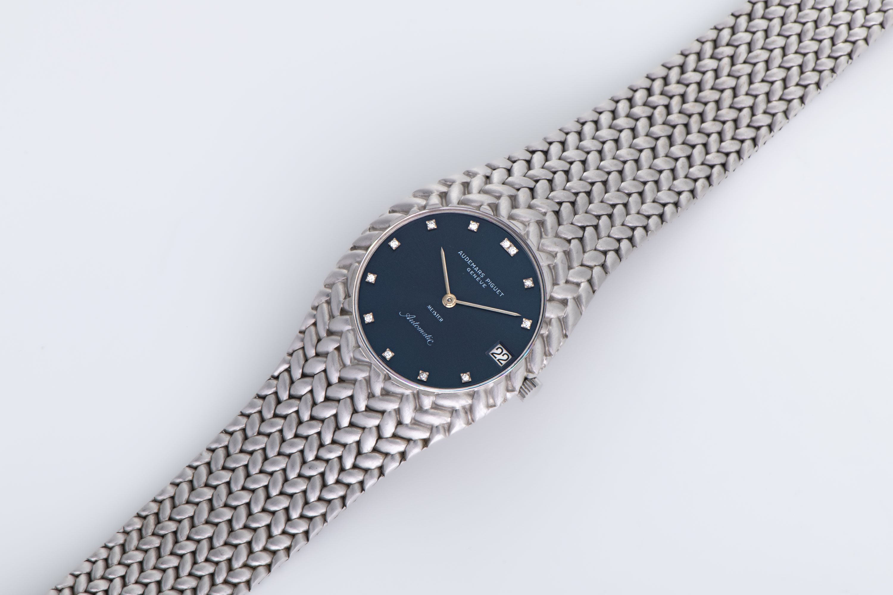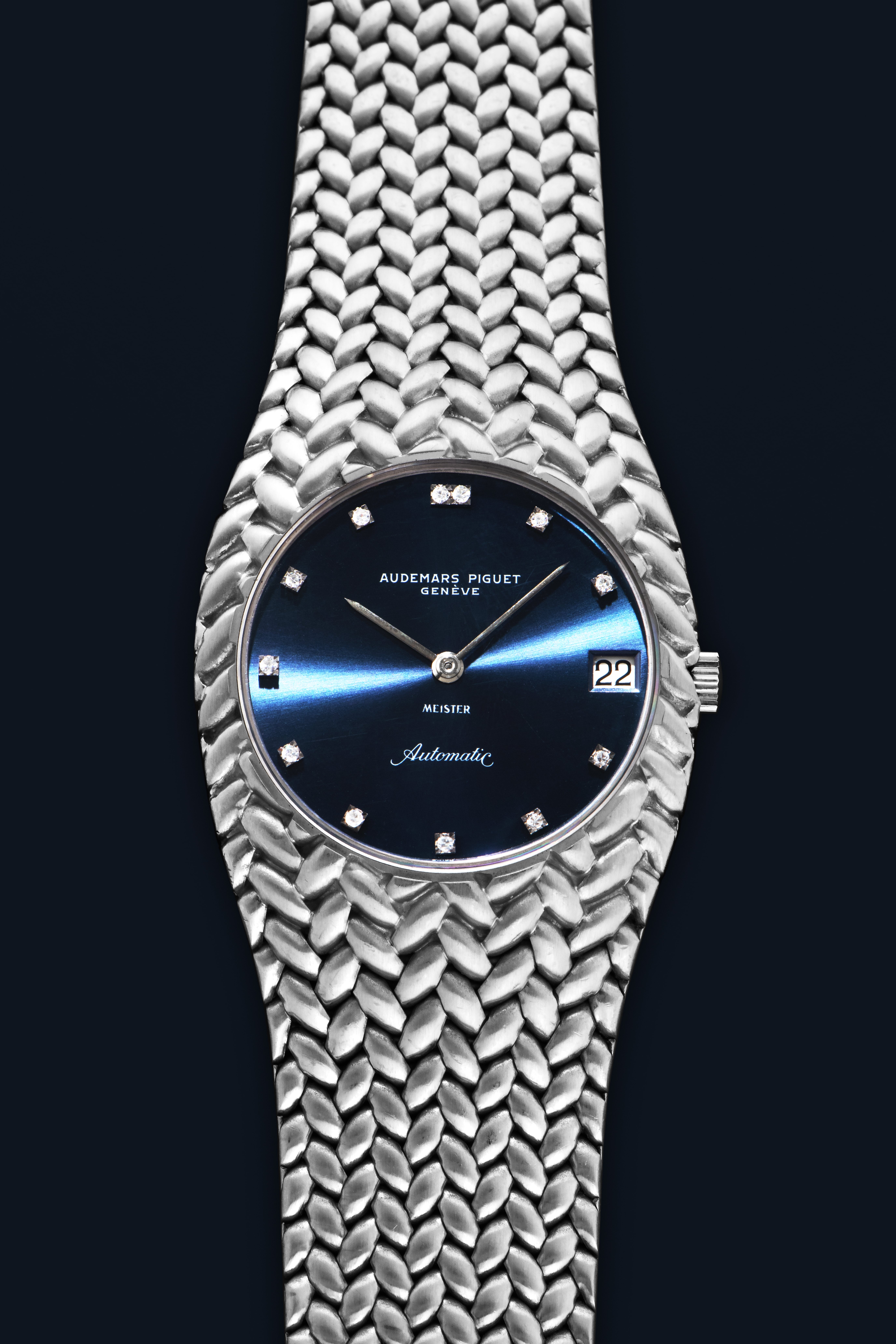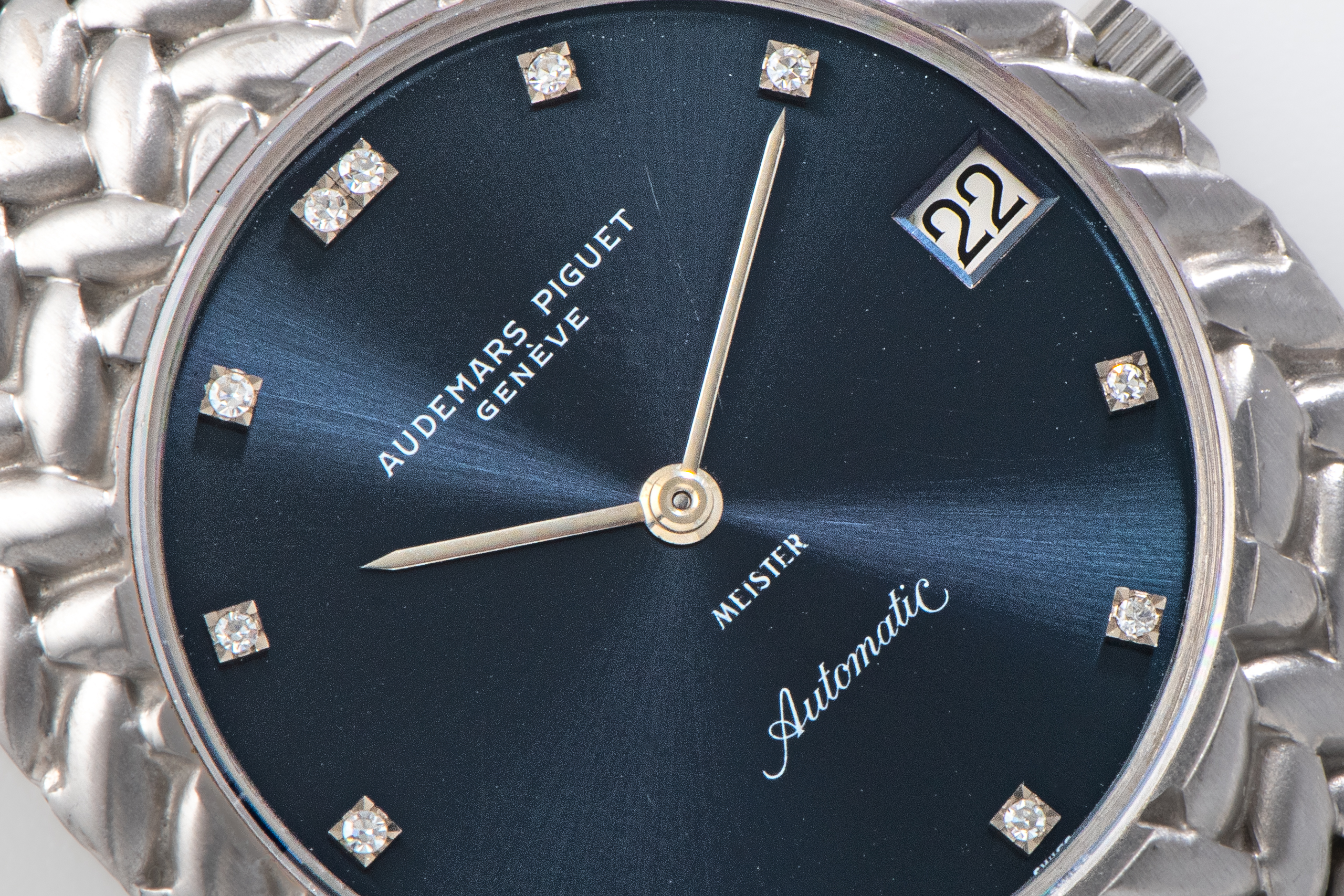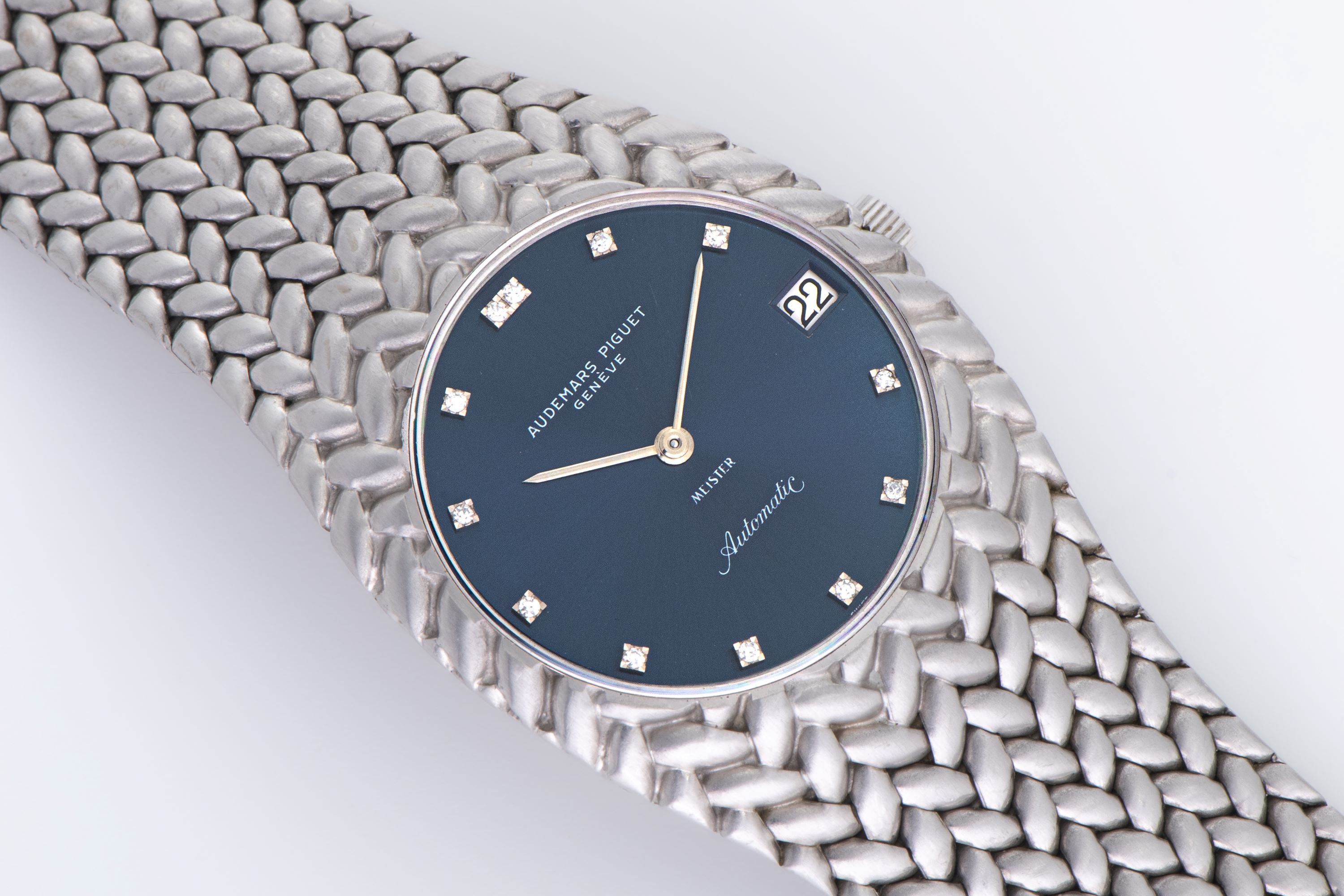 DialBlue sunburst dial with applied diamond indices, white gold hands, date at 3 o'clock, signed 'Audemars Piguet' at 12 o'clock, signed 'Meister' at 6 o'clock