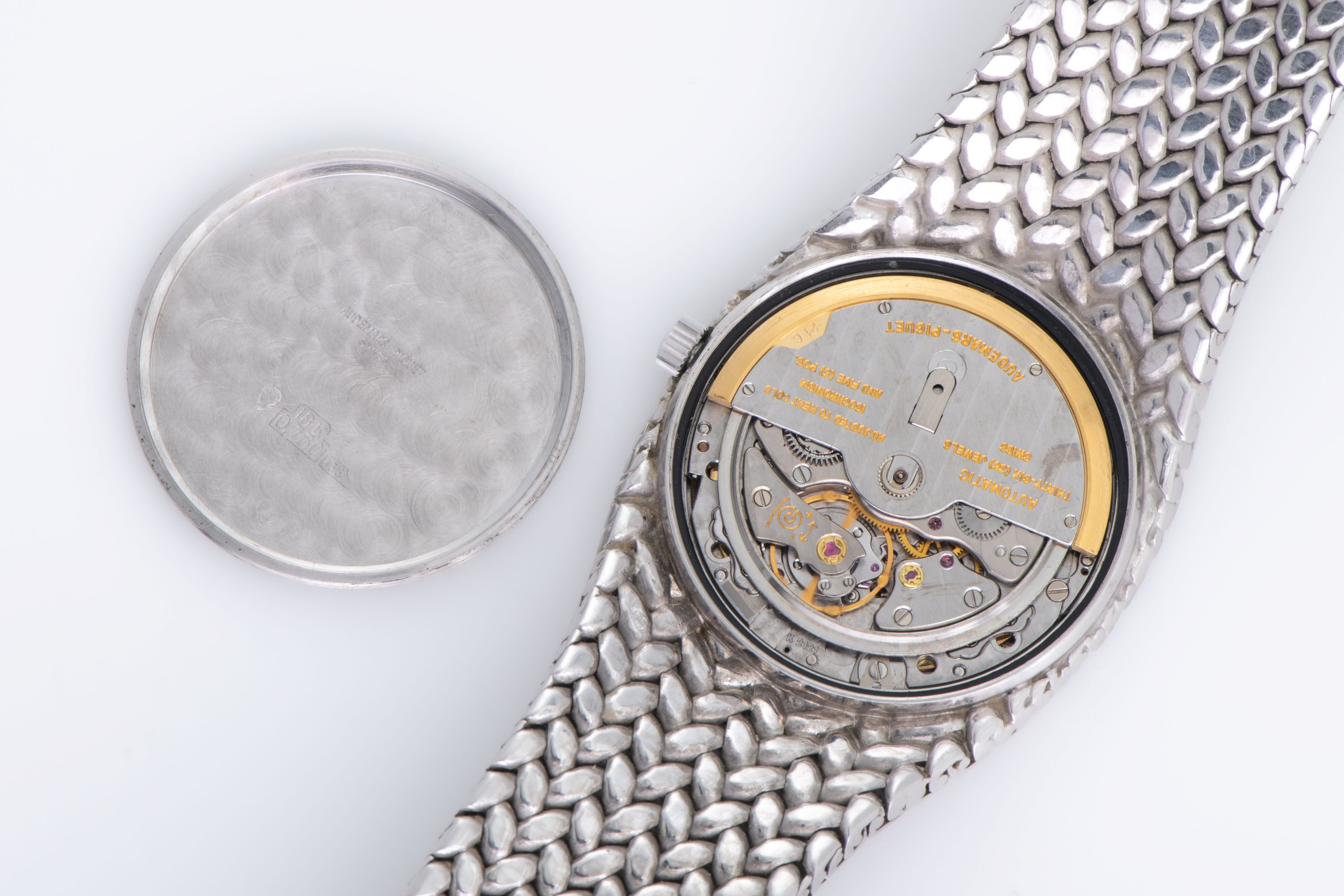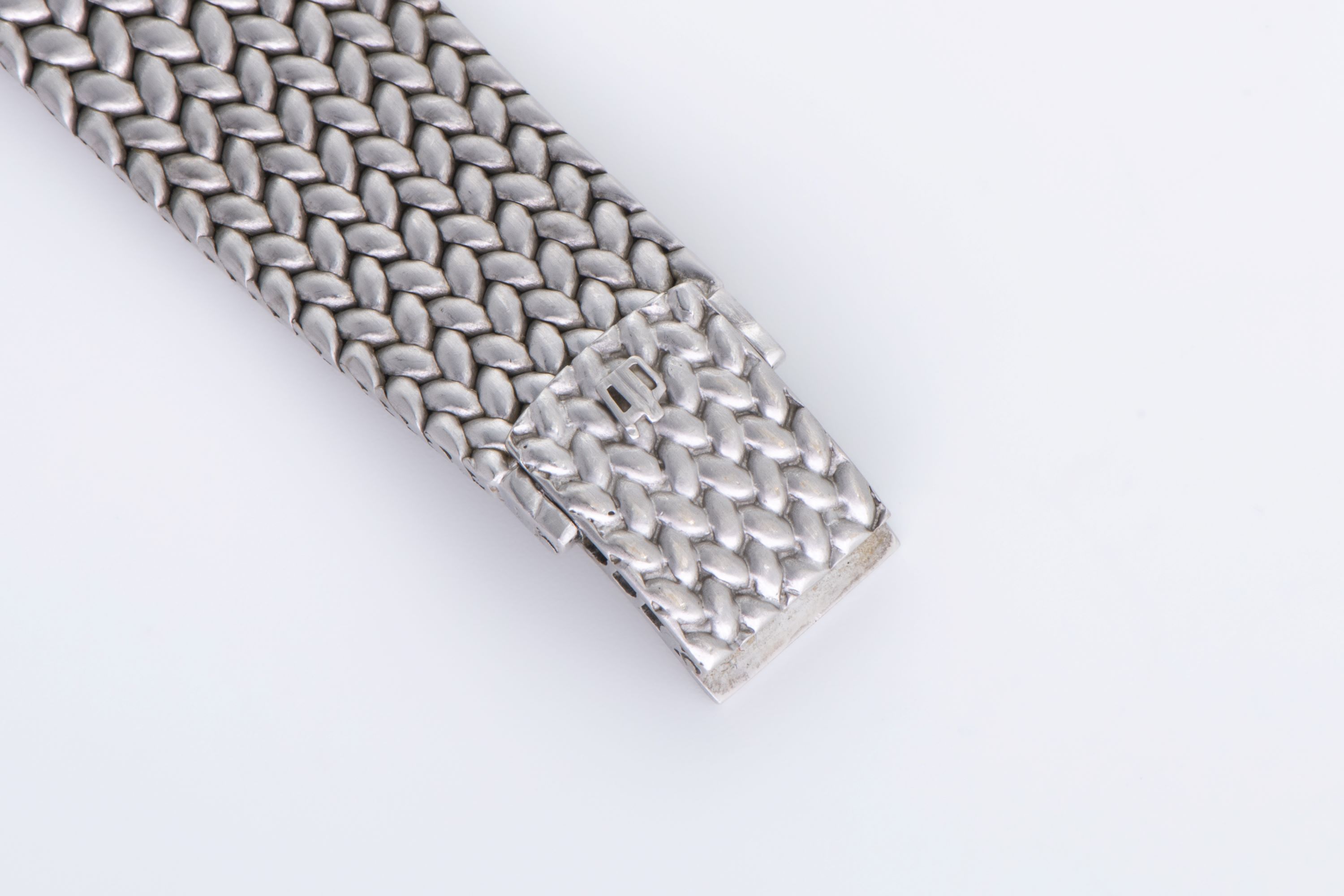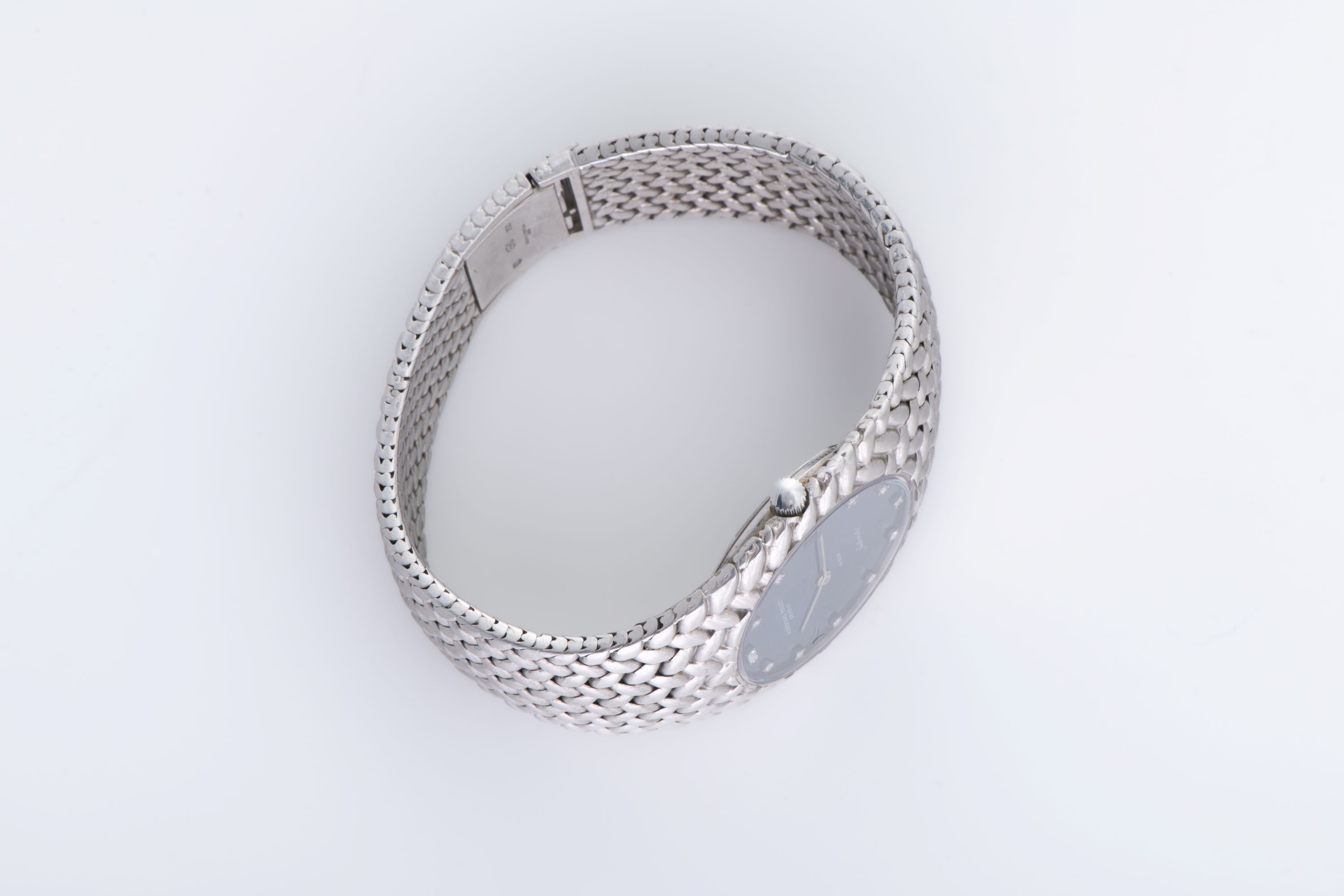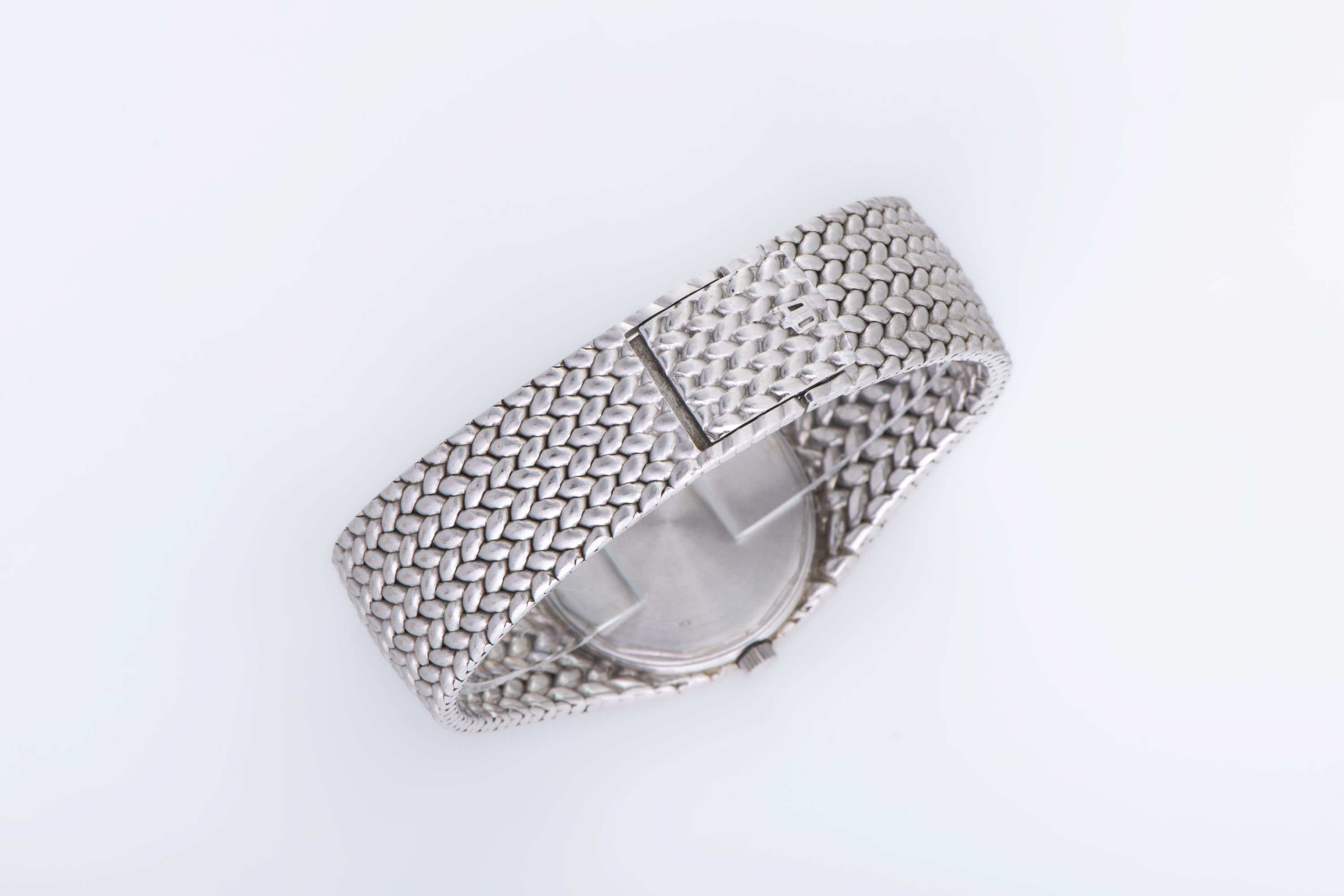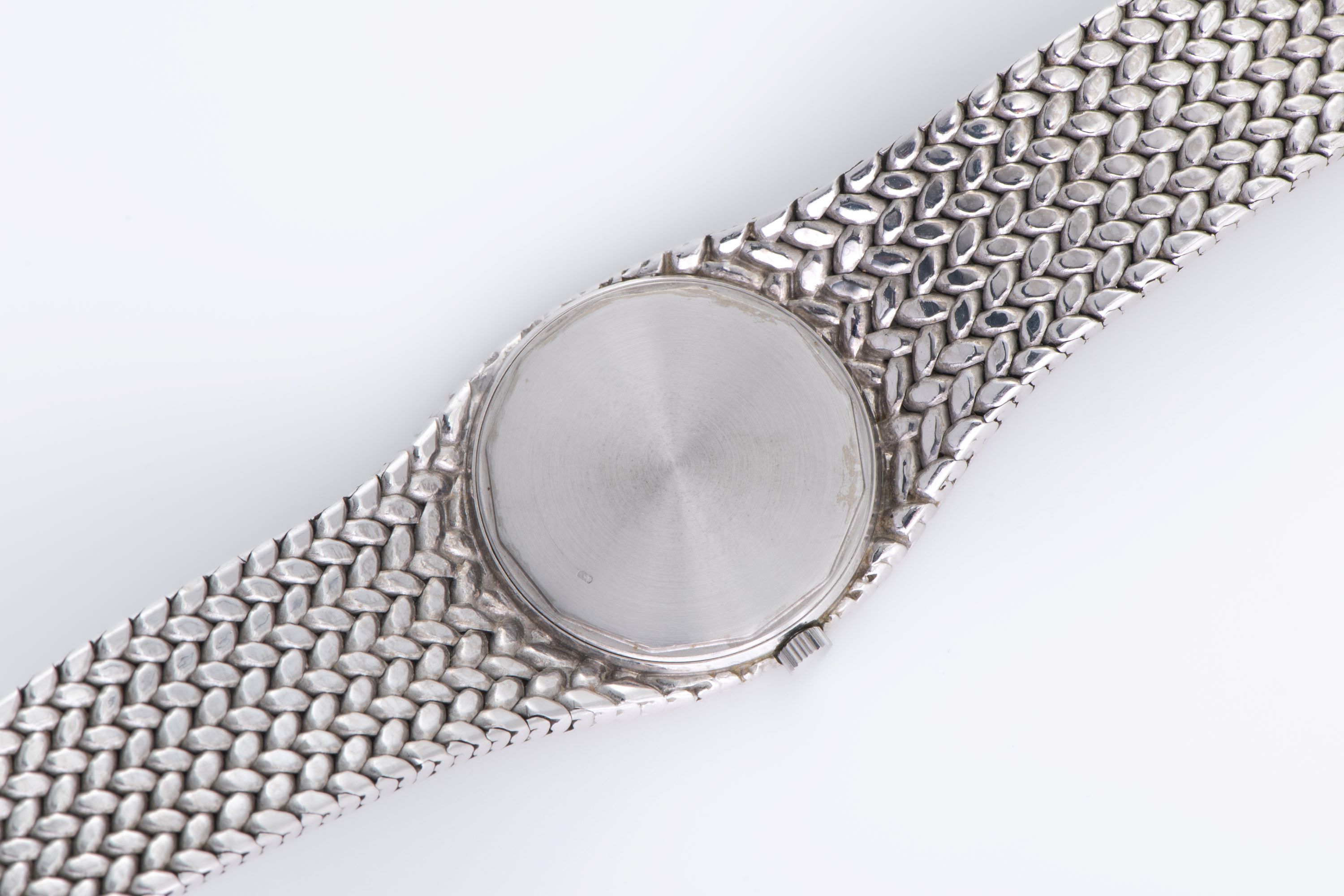 CaseRound case in 18k white gold with woven pattern continuing from the bracelet around the case, solid caseback, crown at 3 o'clock