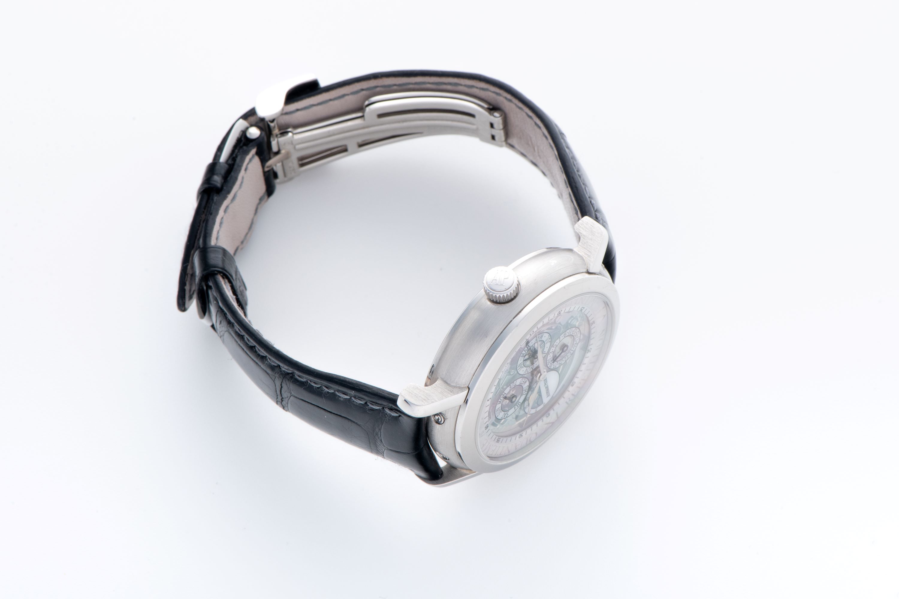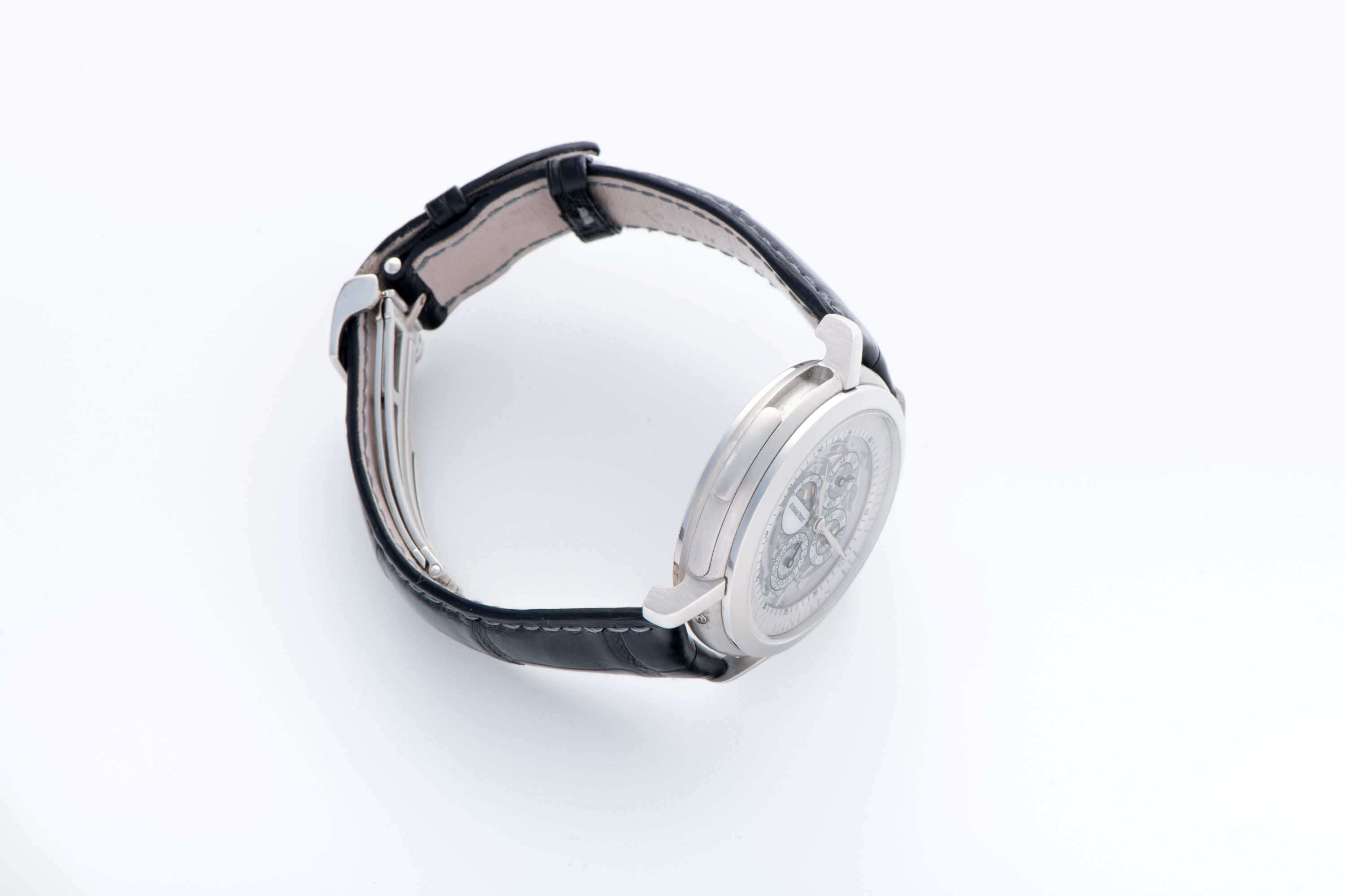 CaseRound case in platinum 950, calendar pushers at 5, 7, 11:30 and 1 o'clock, crown at 3 o'clock