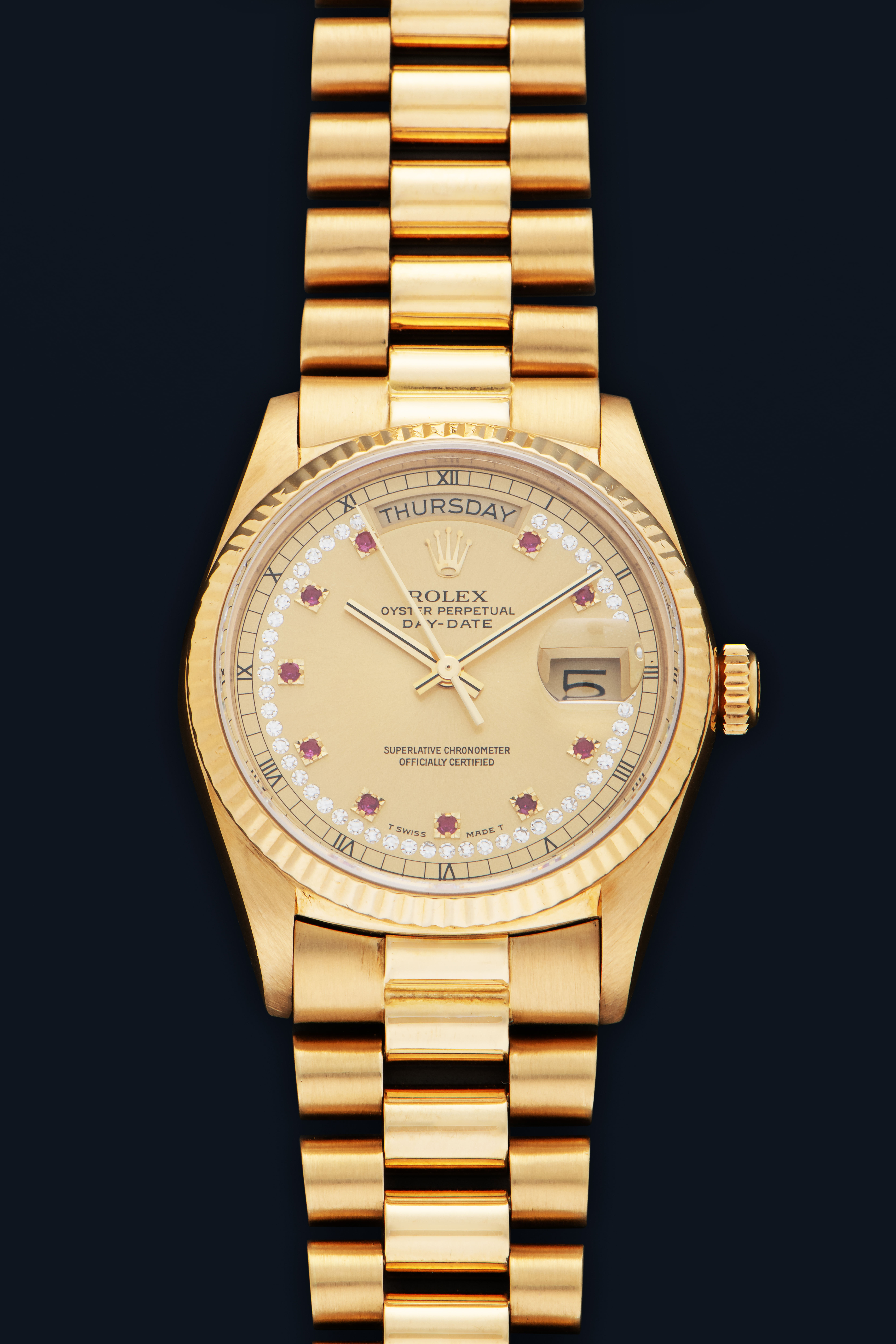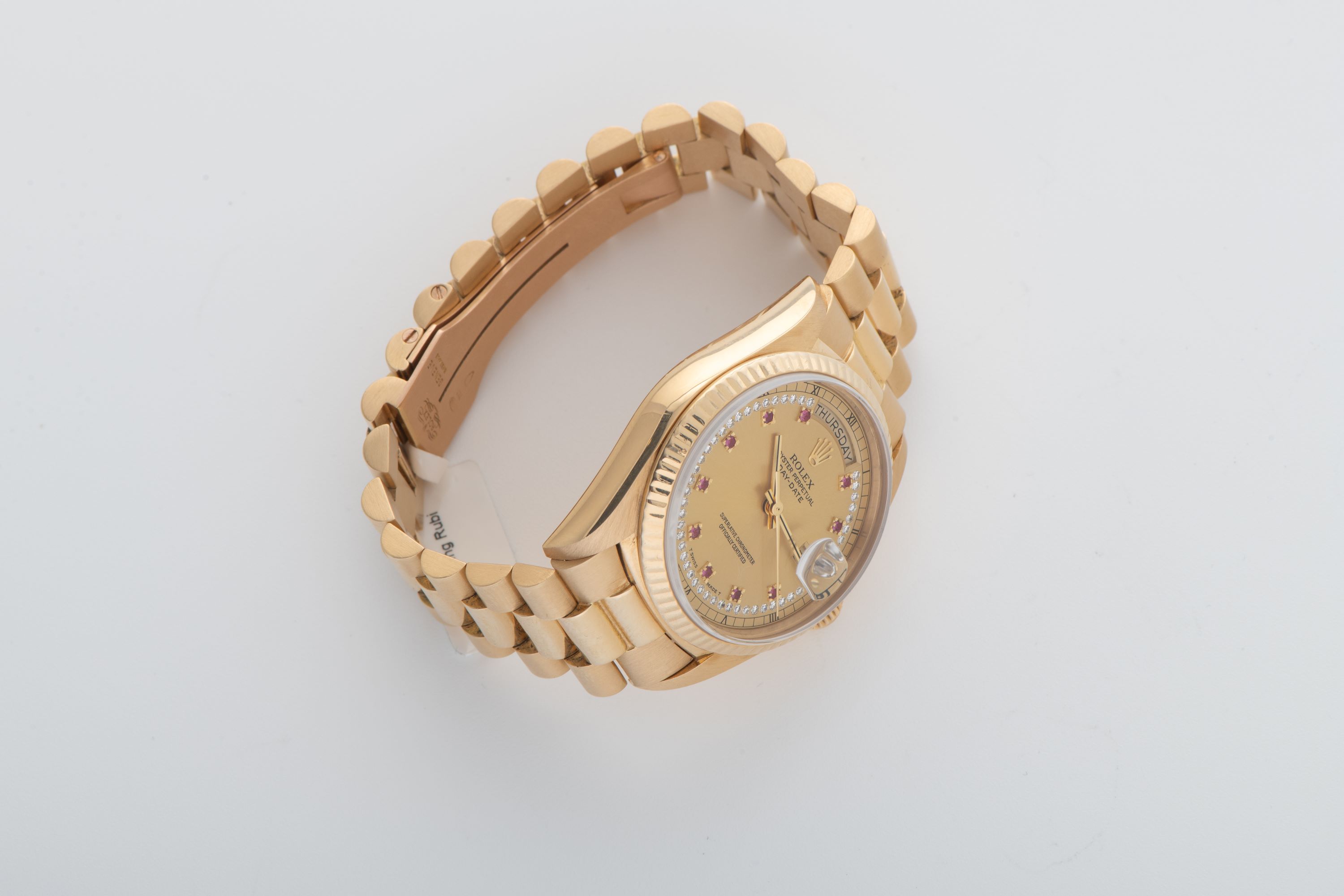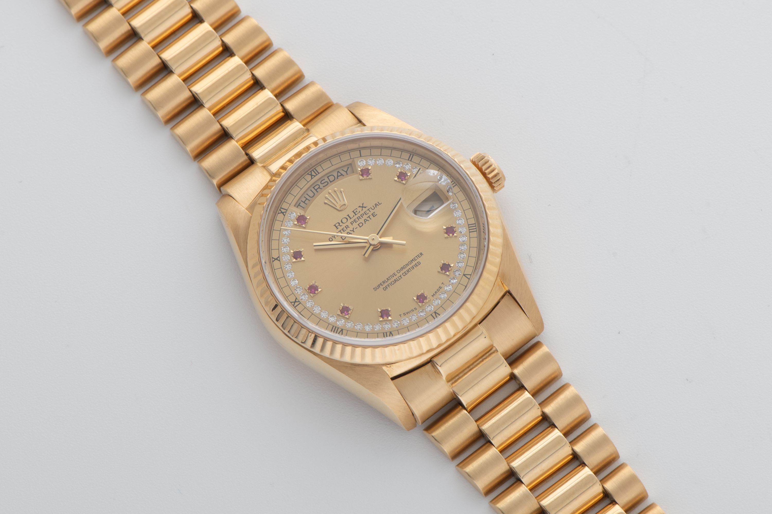 DialChampagne sunburst dial with applied ruby indices, diamond string around the entire dial, gold hands, day window at 12 o'clock, date window with magnifier at 3 o'clock, signed 'Rolex' at 12 o'clock
