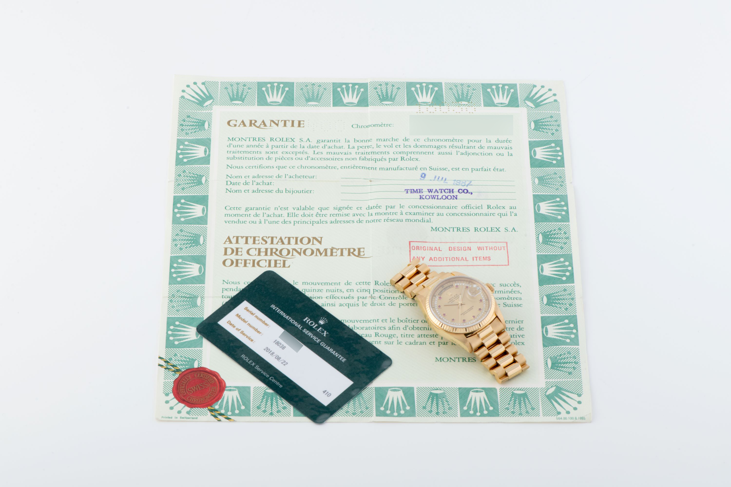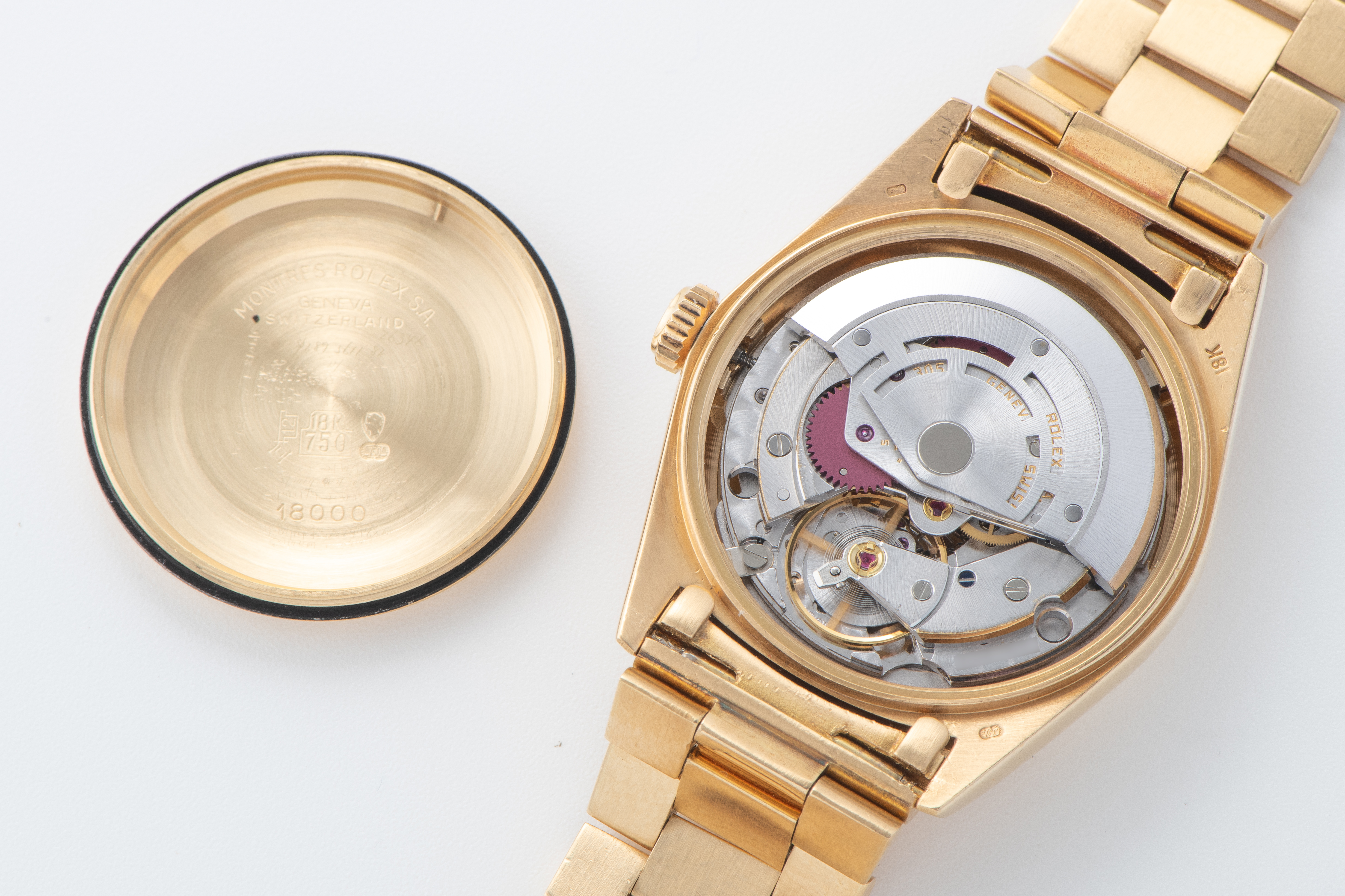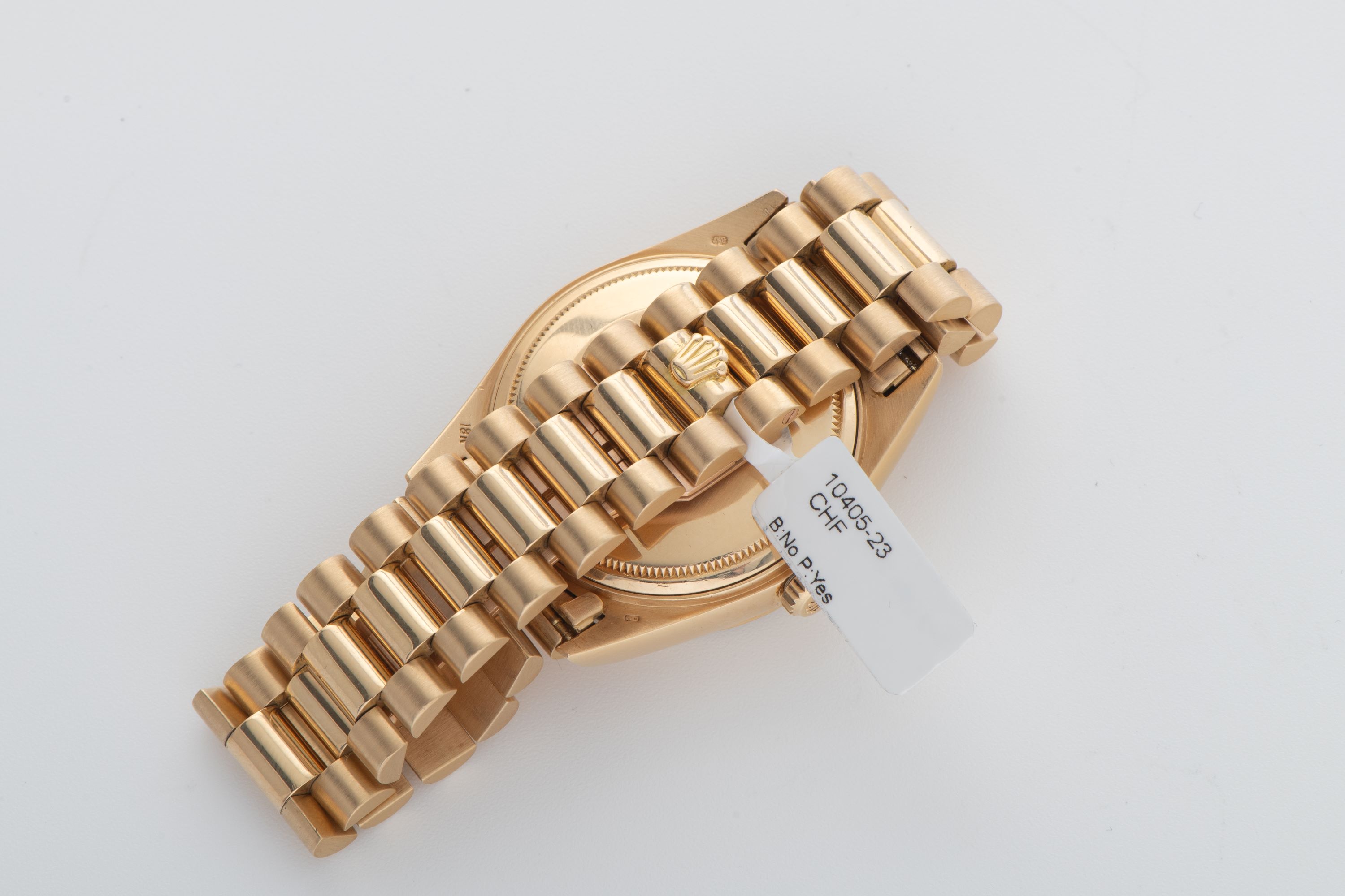DialChampagne sunburst dial with applied ruby indices, diamond string around the entire dial, gold hands, day window at 12 o'clock, date window with magnifier at 3 o'clock, signed 'Rolex' at 12 o'clock