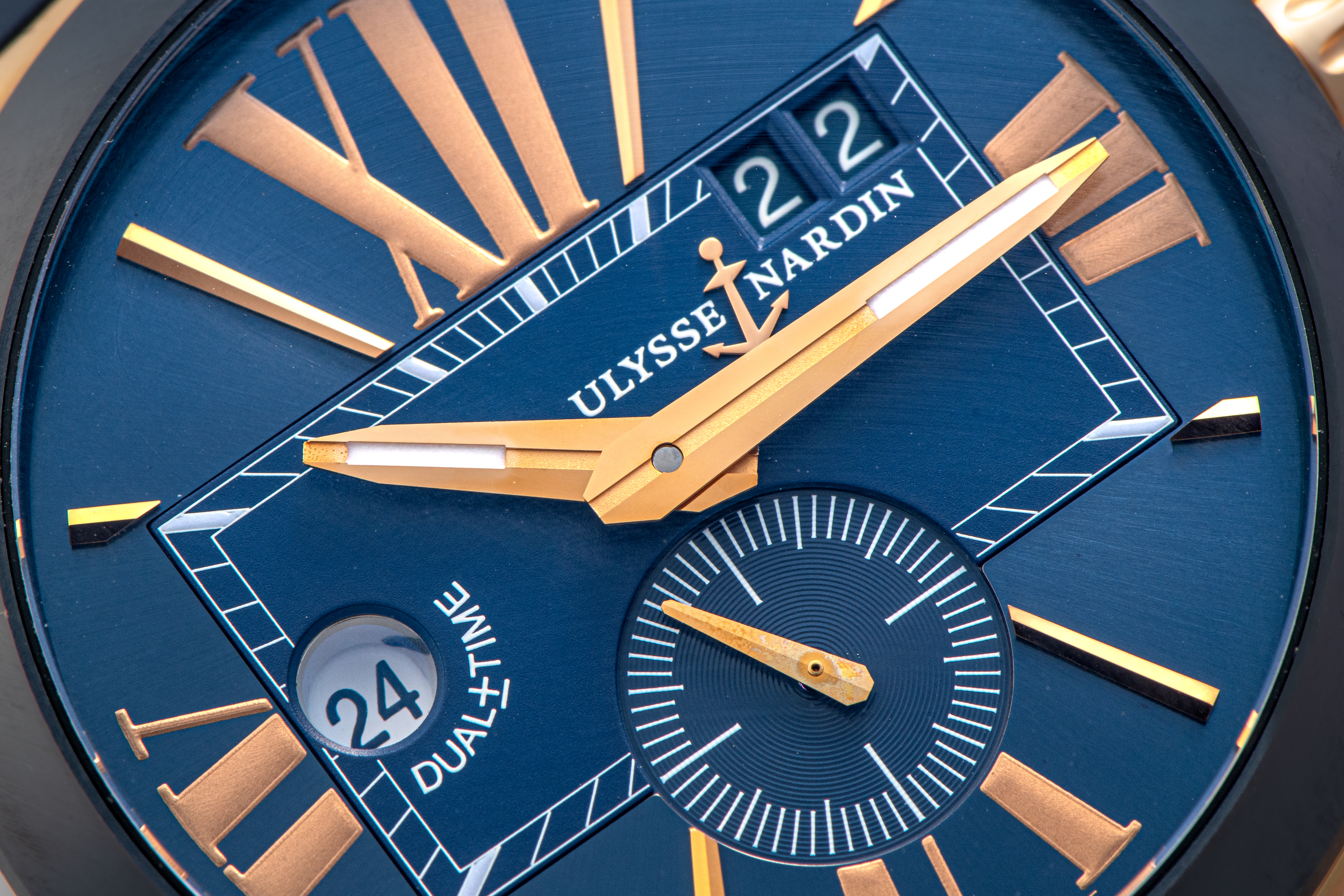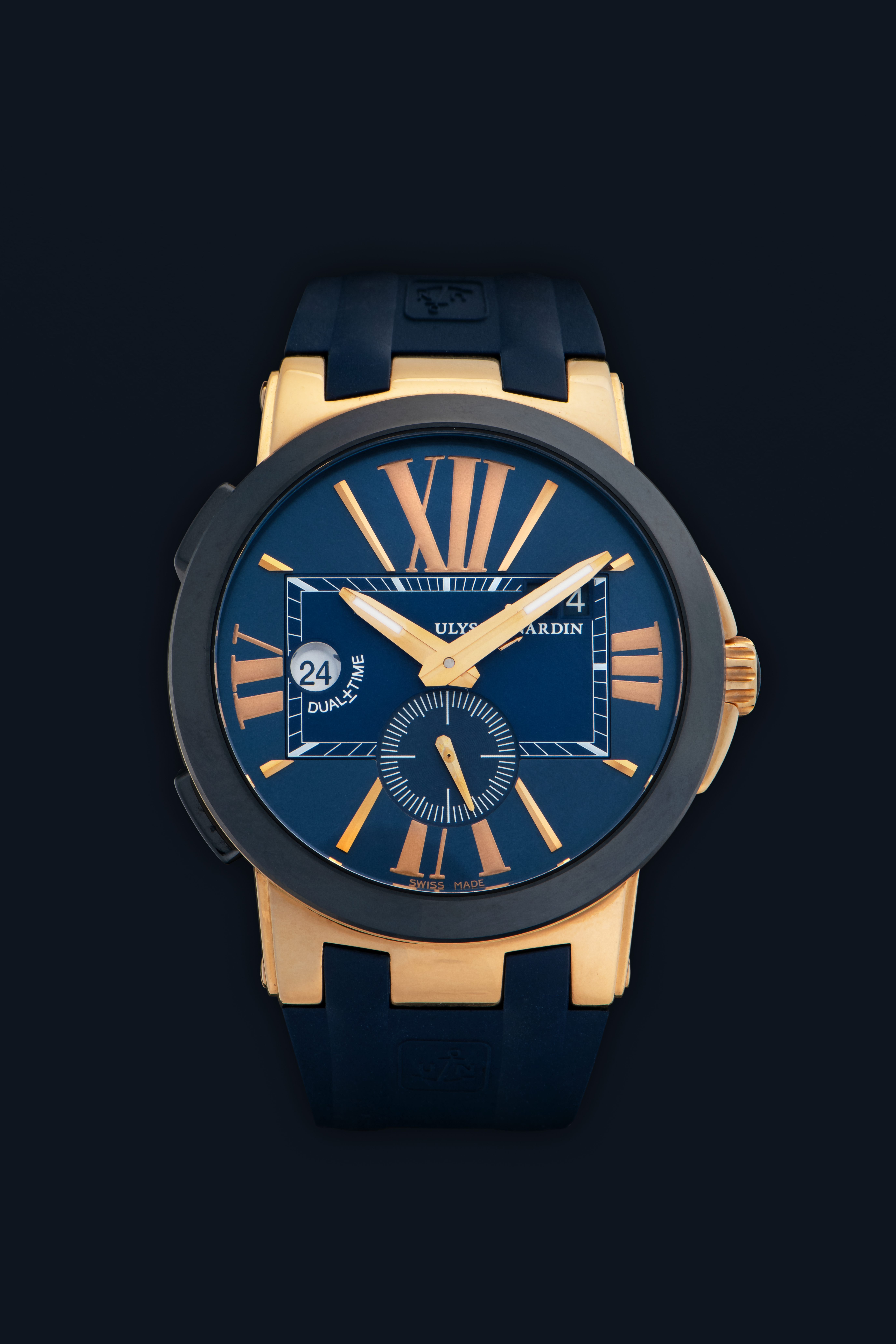 DialDark blue sunburst dial with rectangular central part, rose gold hands and indices, digital second timezone at 9 o'clock, small seconds at 6 o'clock, signed 'Ulysse Nardin' and big date display at 2 o'clock