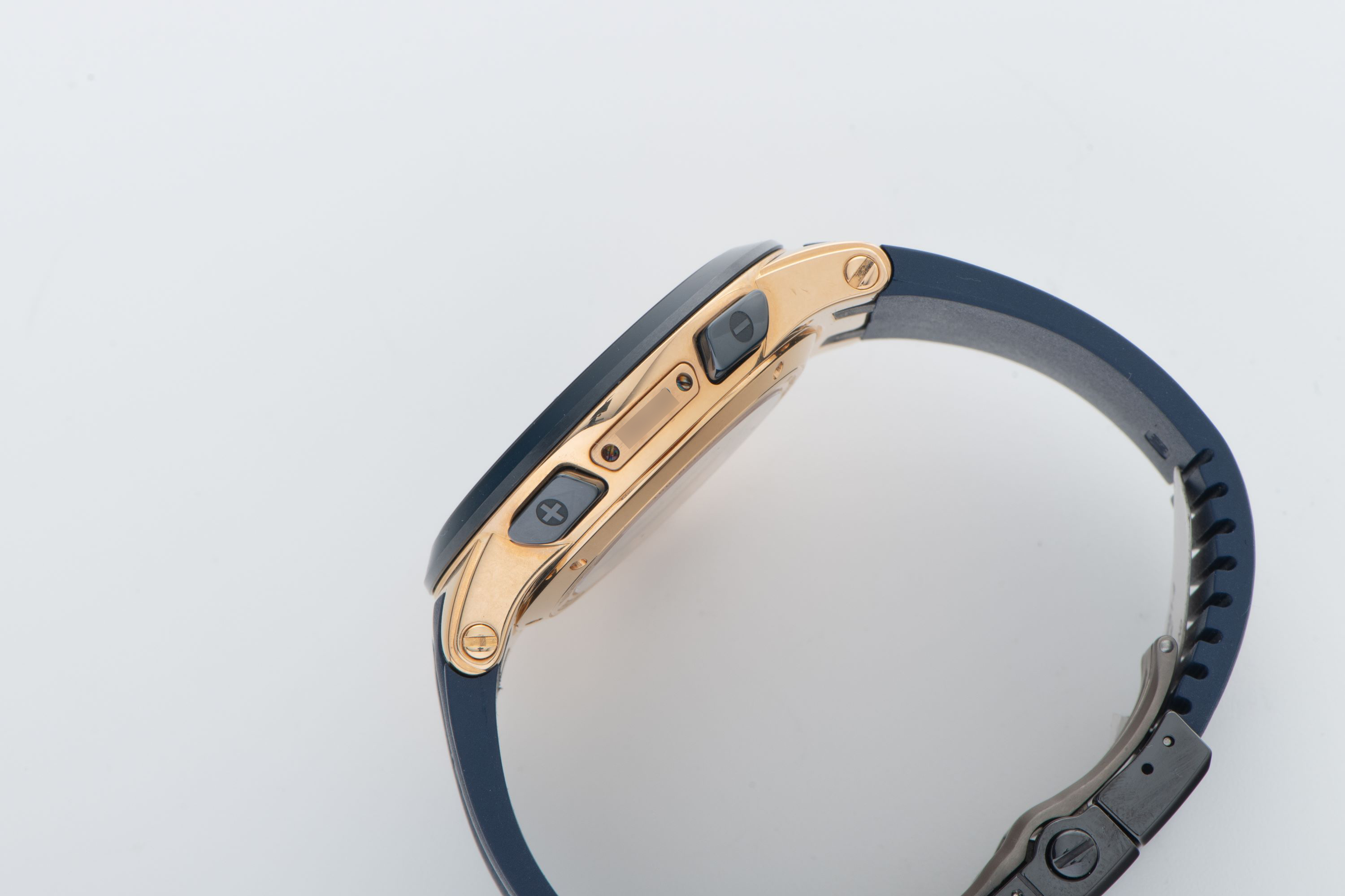 CaseRound case in 18k rose gold with dark blue ceramic bezel, pushers for second timezone setting at 8 and 10 o'clock, crown at 3 o'clock