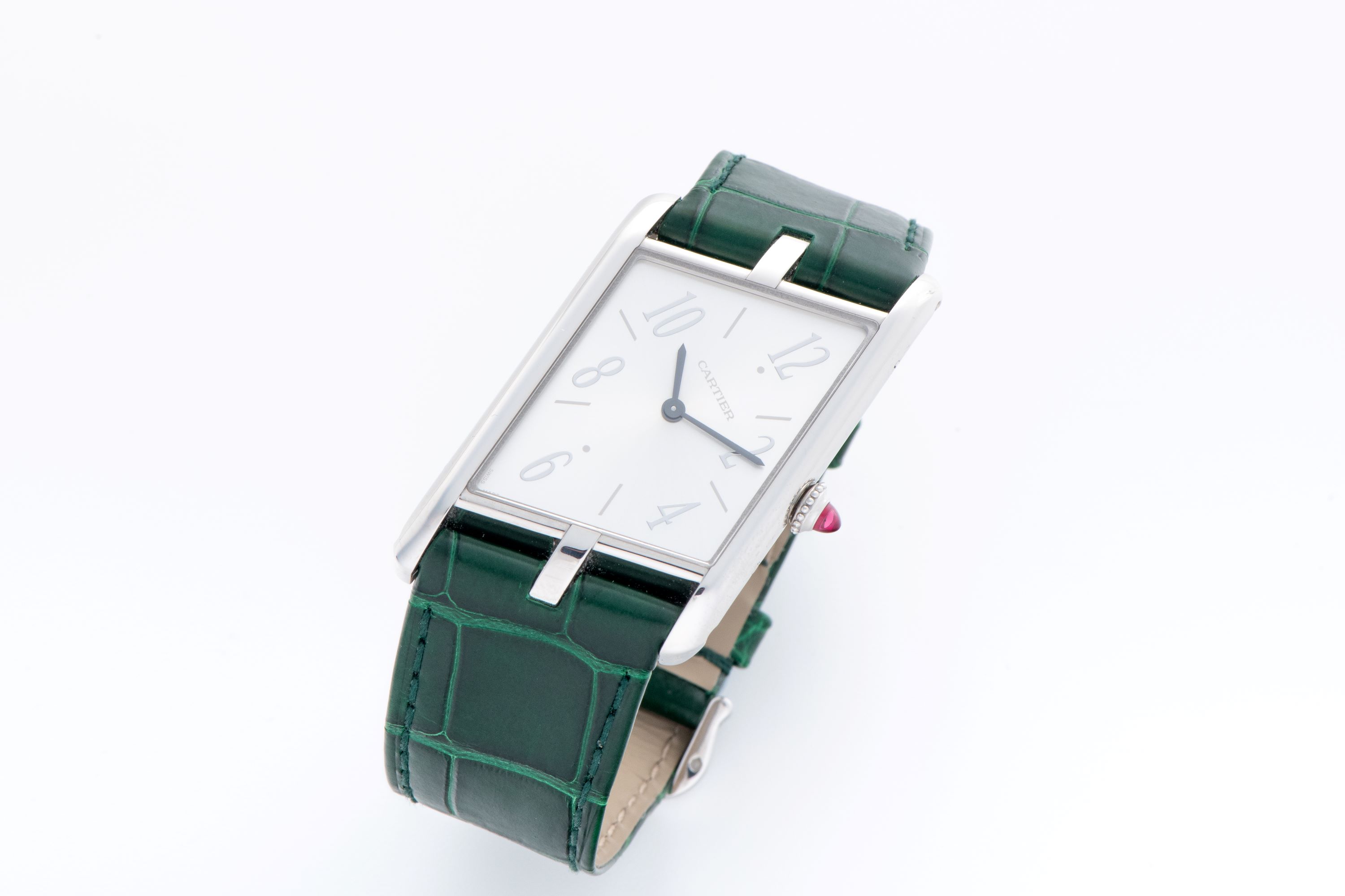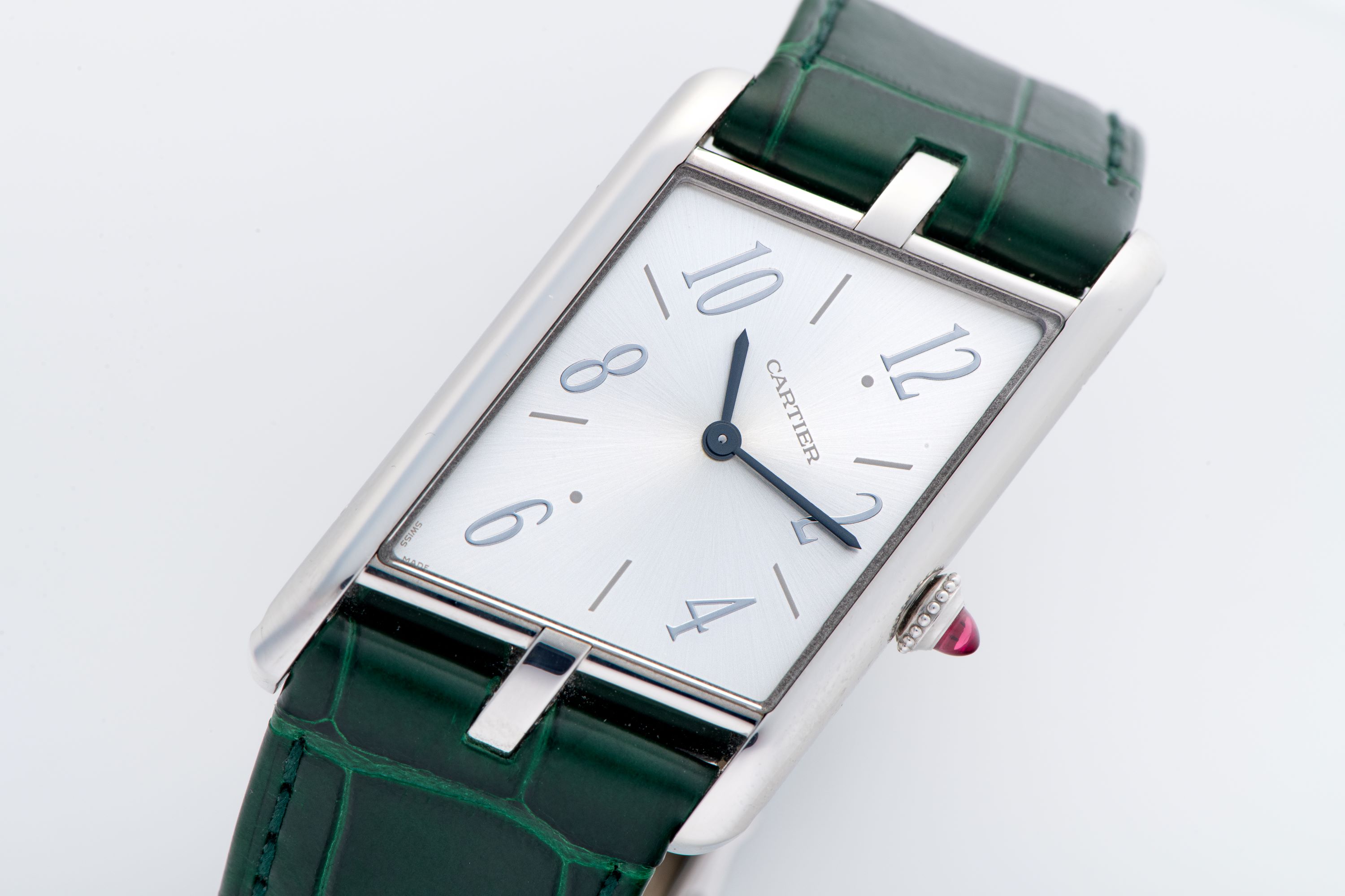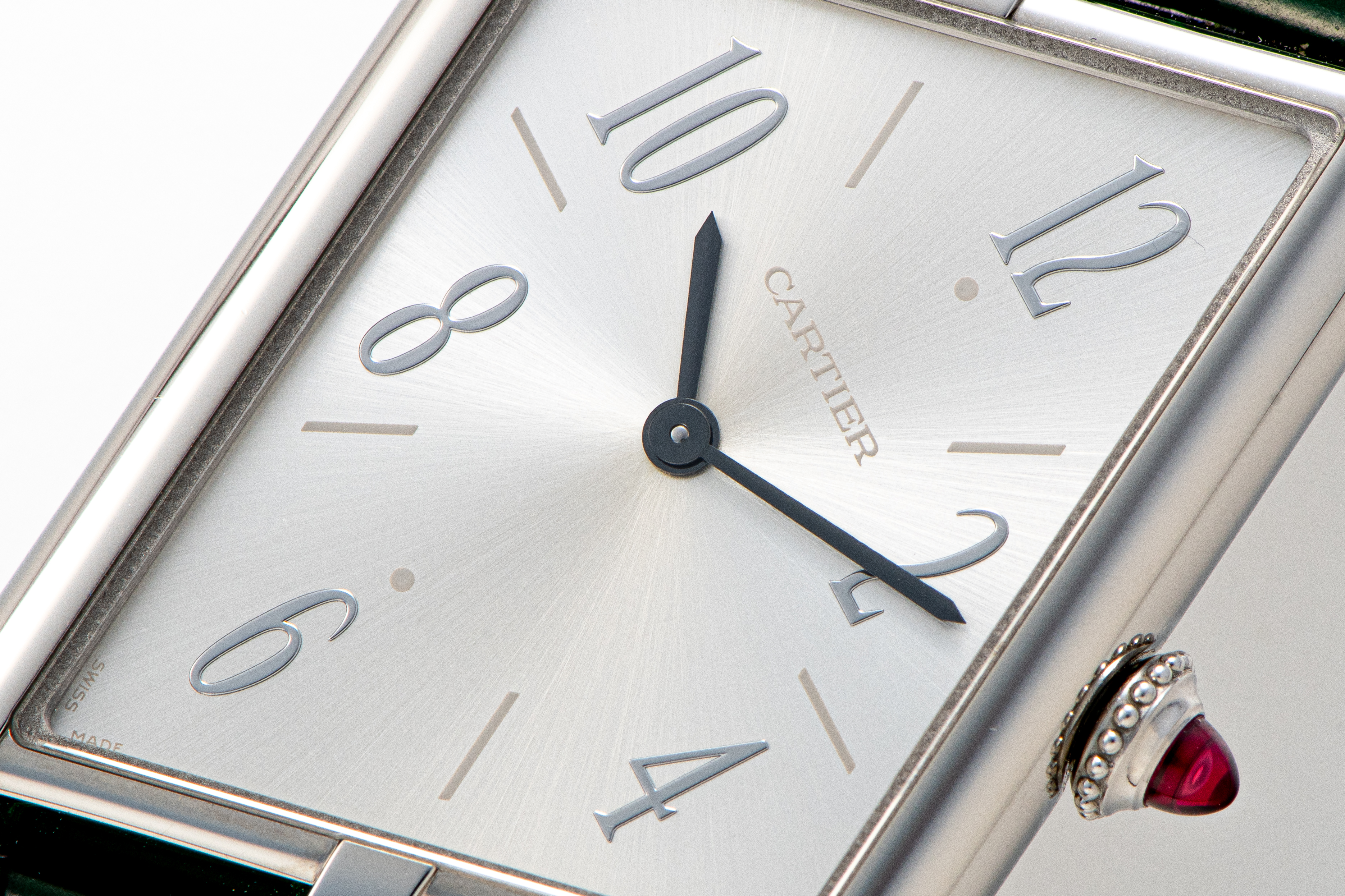 DialSilver sunburst dial, rotated to the right, applied numerals for 12, 2, 4, 6, 8, and 10 o'clock, signed 'Cartier' at 12 o'clock