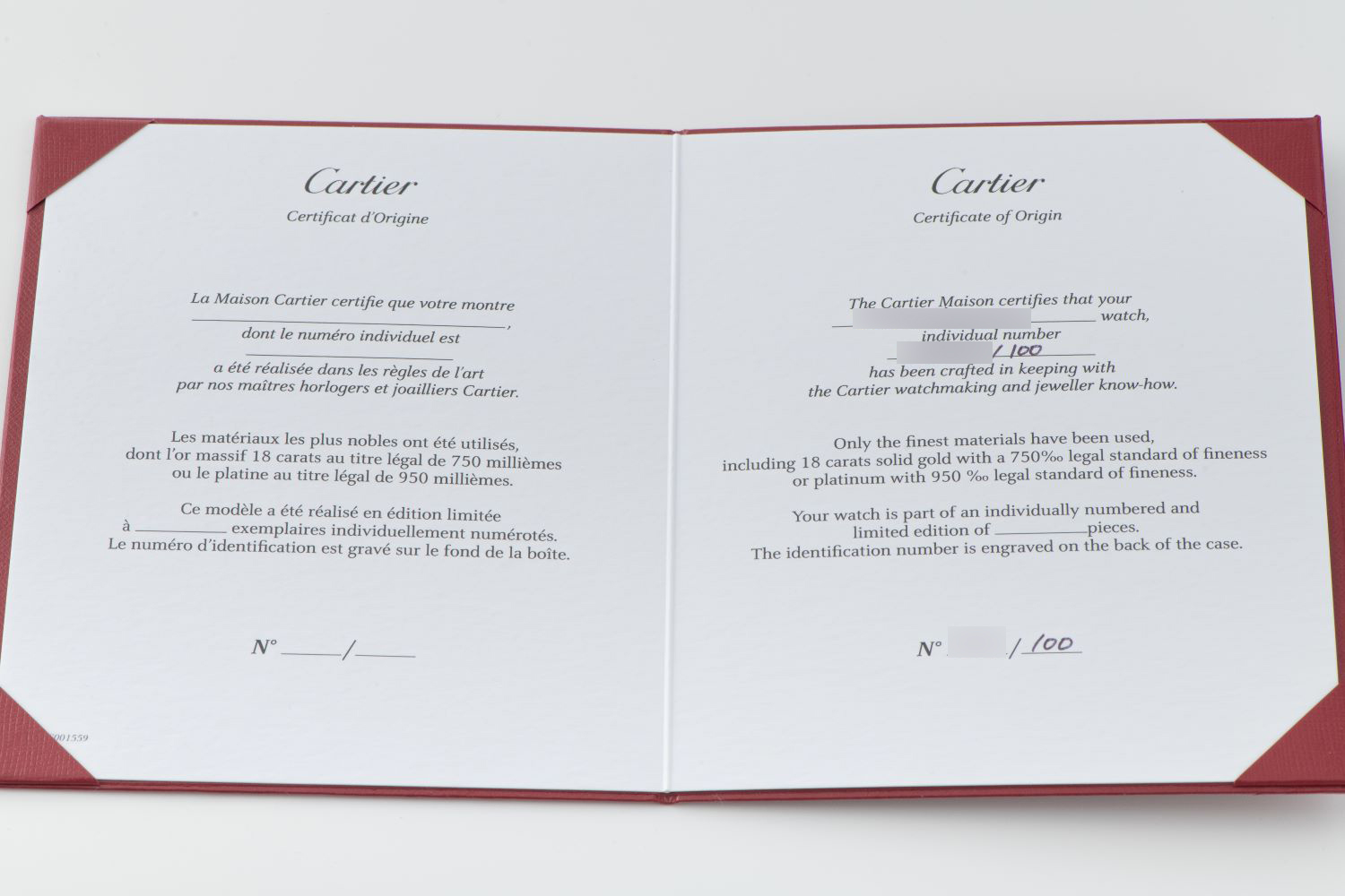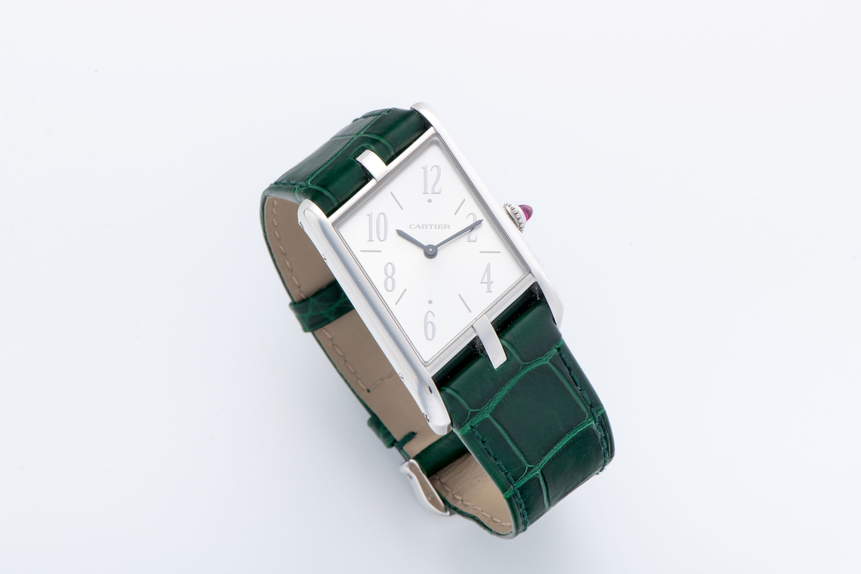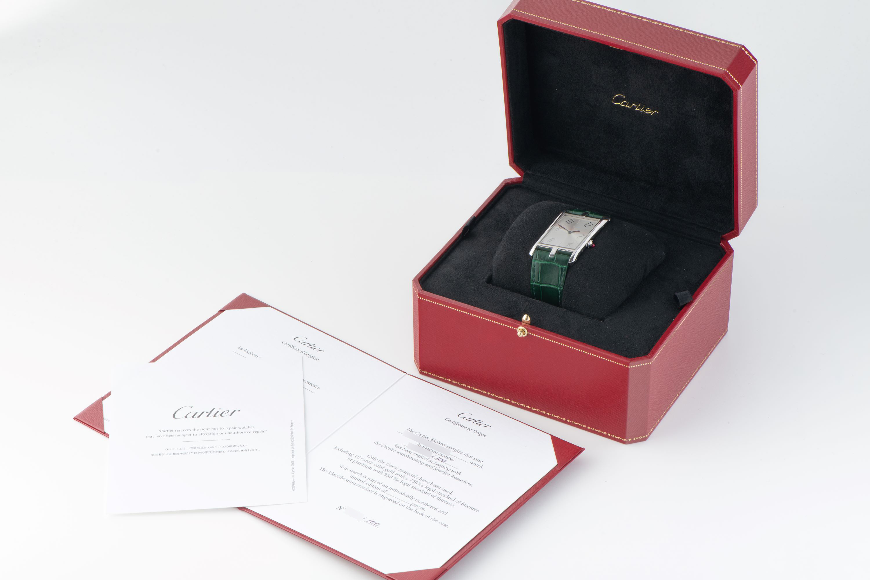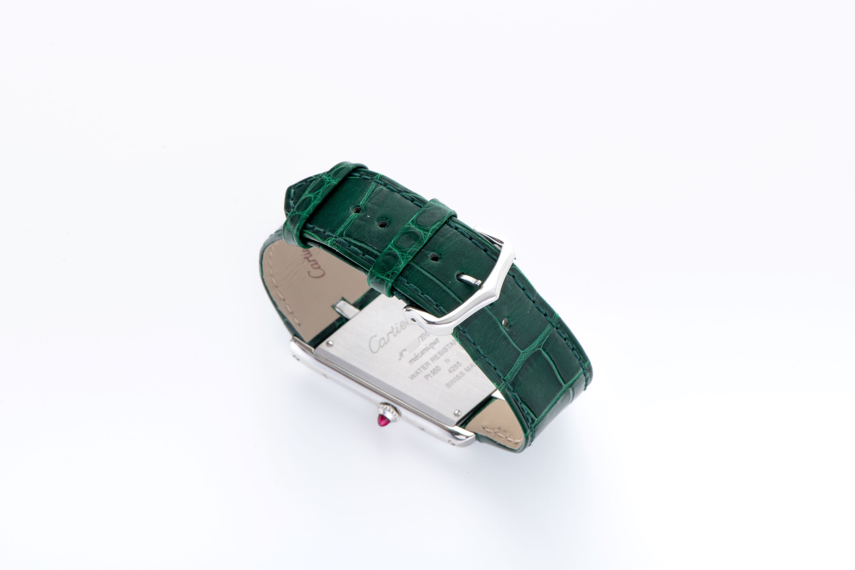 DialSilver sunburst dial, rotated to the right, applied numerals for 12, 2, 4, 6, 8, and 10 o'clock, signed 'Cartier' at 12 o'clock