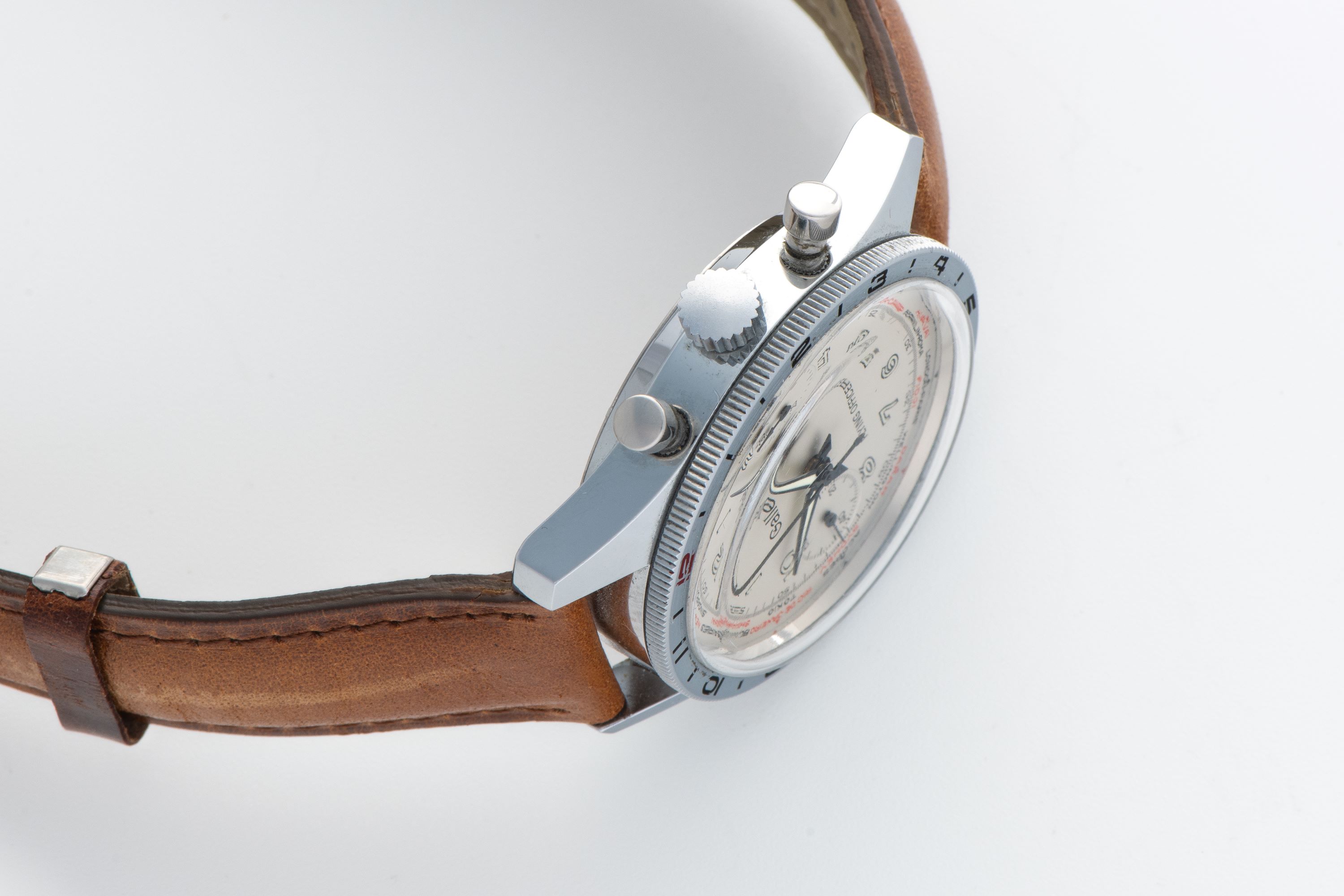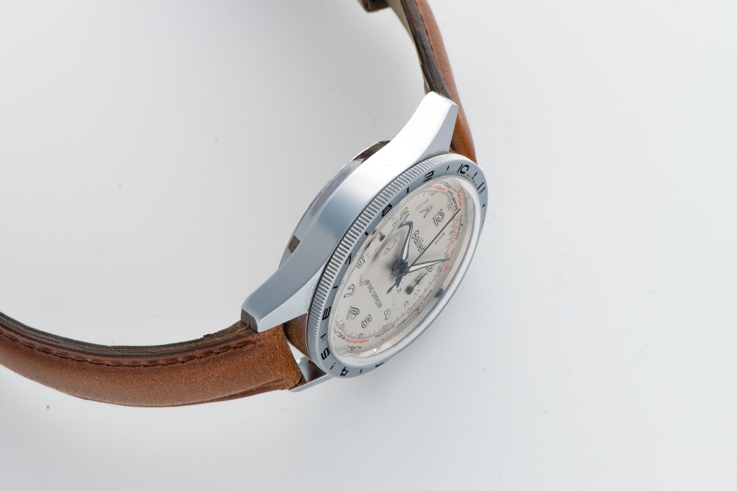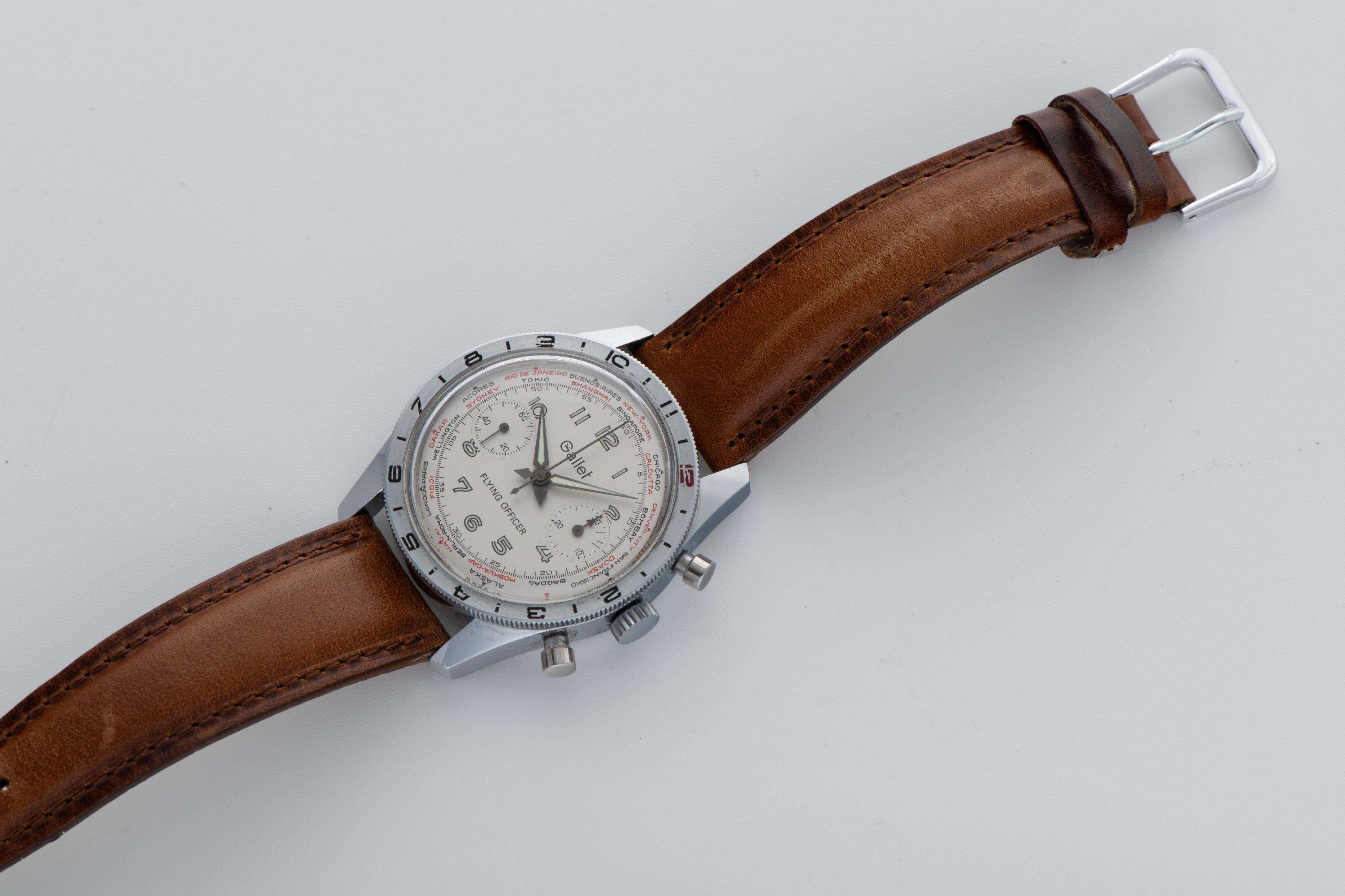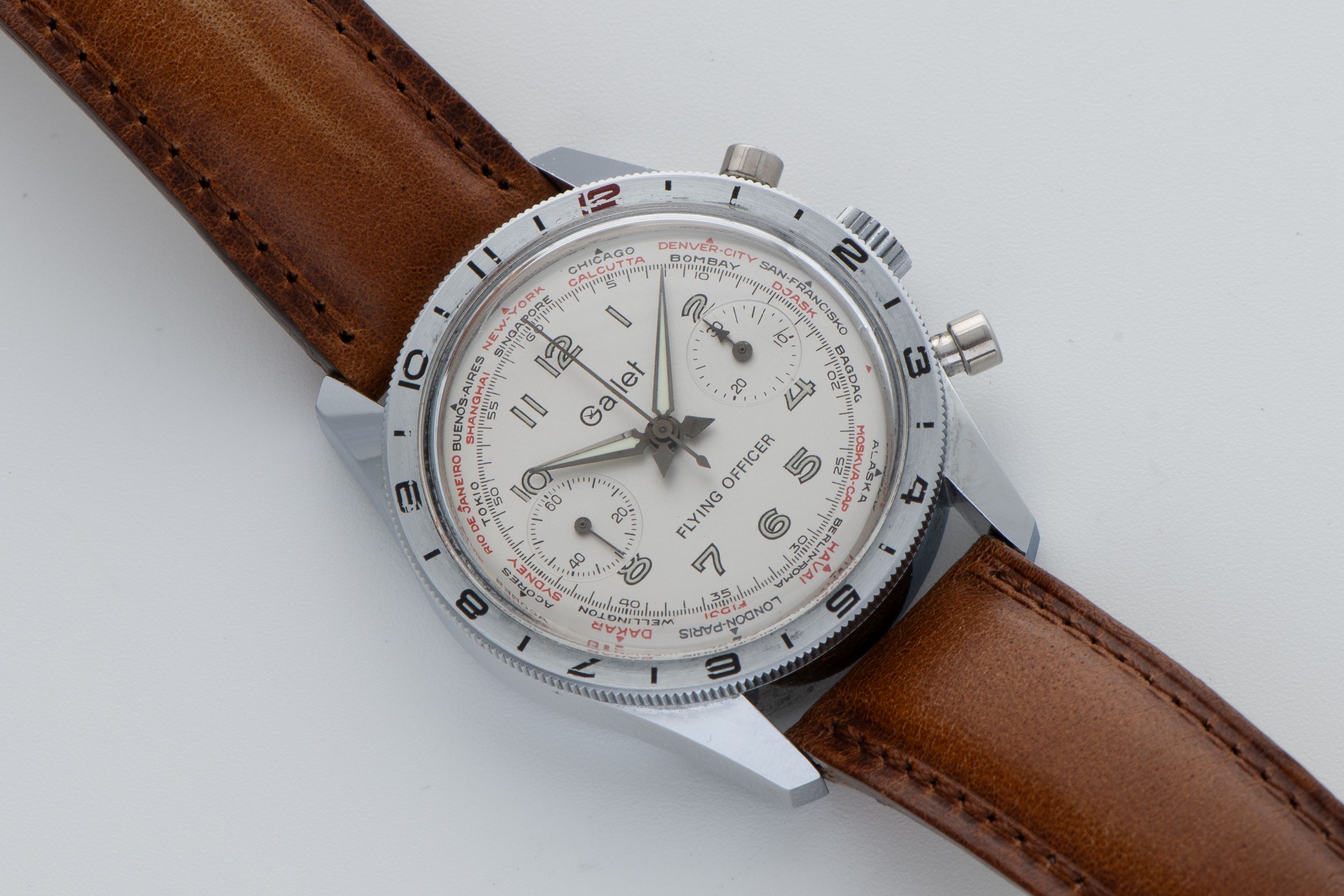 DialSilver dial with luminous numerals and luminous hands, central chronograph seconds hand, small seconds at 9 o'clock, 30 minute chronograph counter at 3 o'clock, signed 'Gallet' at 12 o'clock, 'Flying Officer' at 6 o'clock