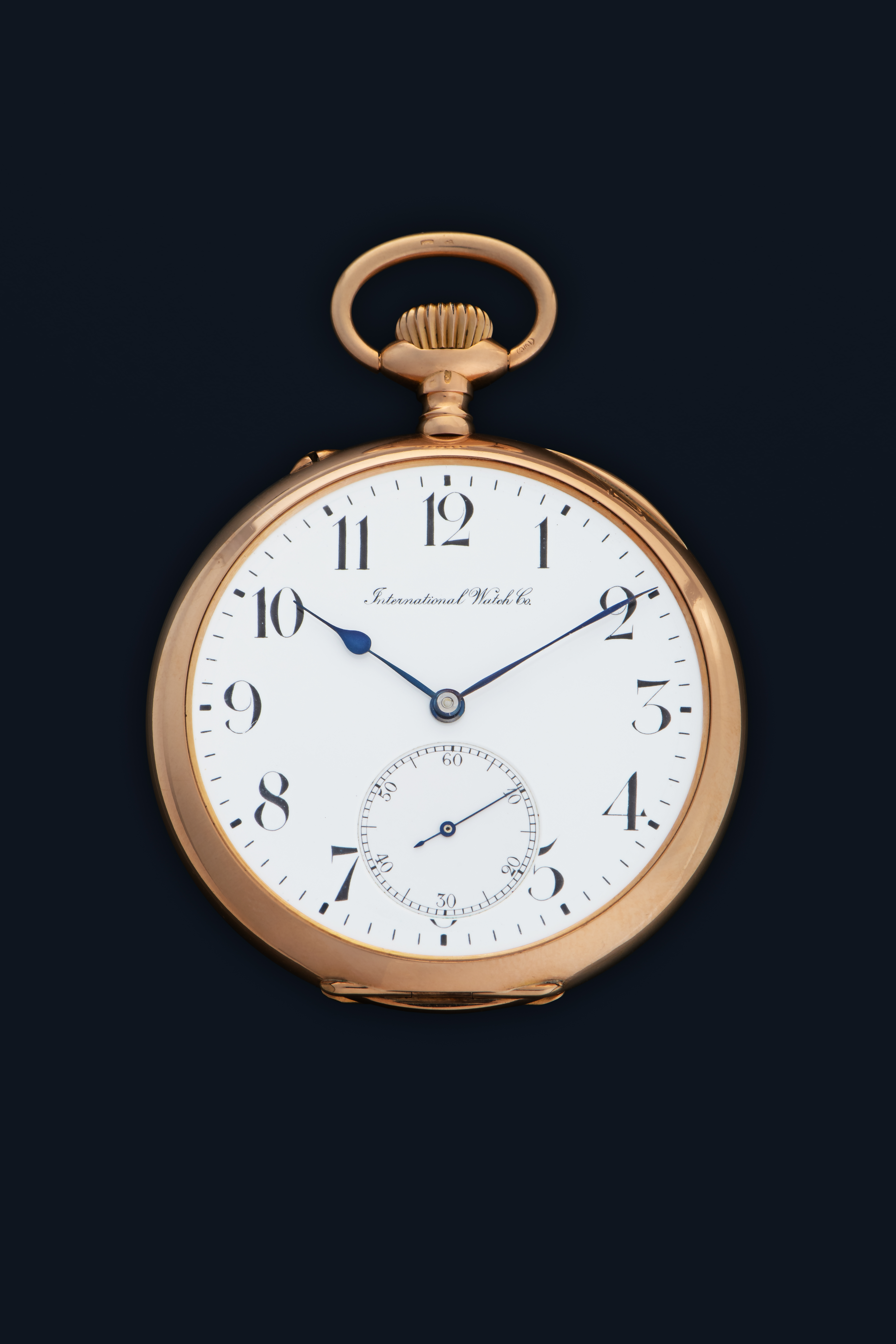 DialWhite enamel dial with large arabic numerals, heat-blued spade hands, small seconds at 6 o'clock, signed 'International Watch Co.' at 12 o'clock