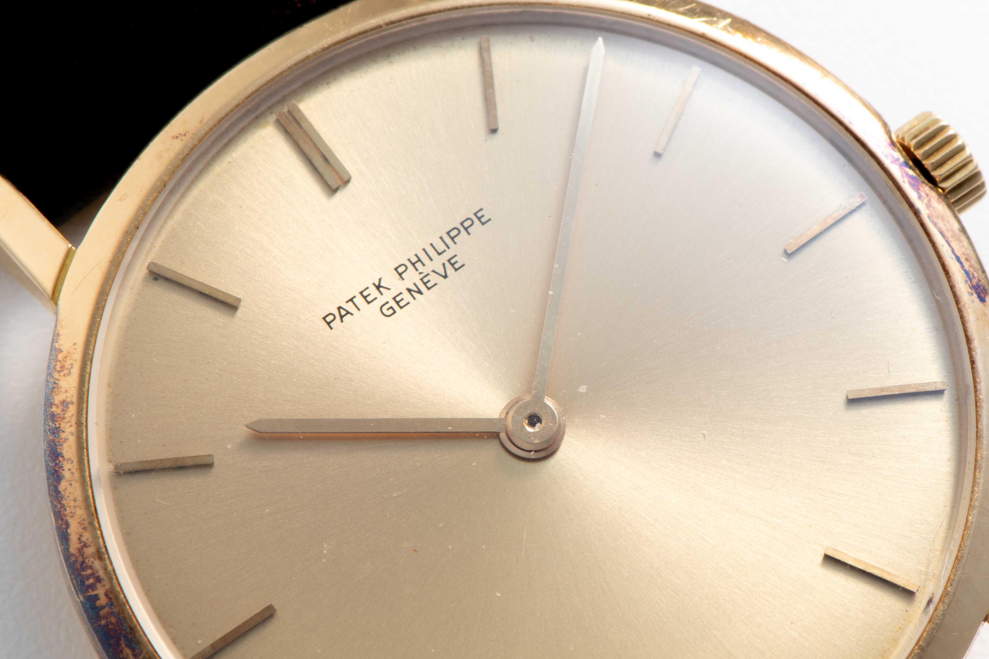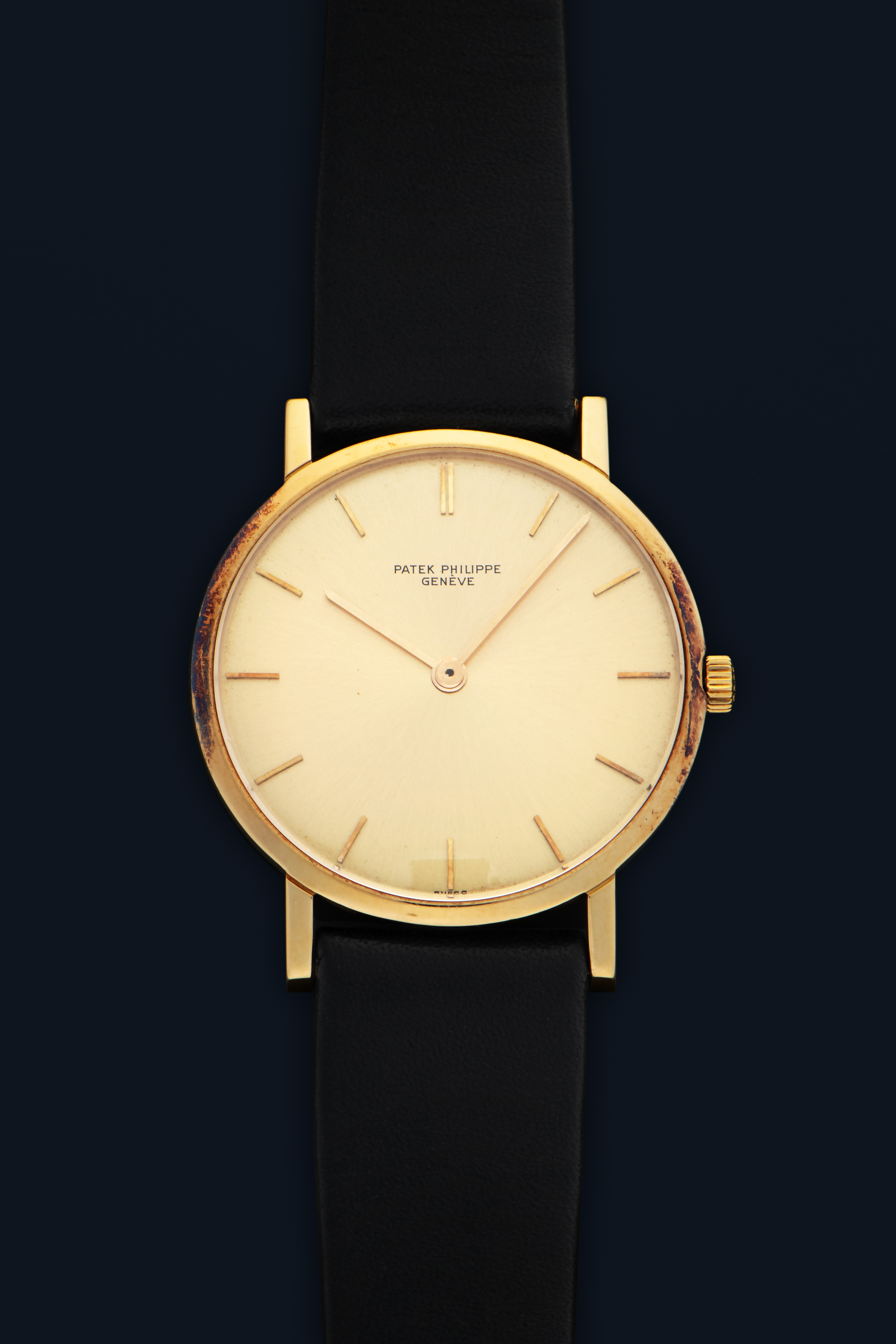 DialChampagne sunburst dial with applied iindices and hands in yellow gold, signed 'Patek Philippe Genève' at 12 o'clock