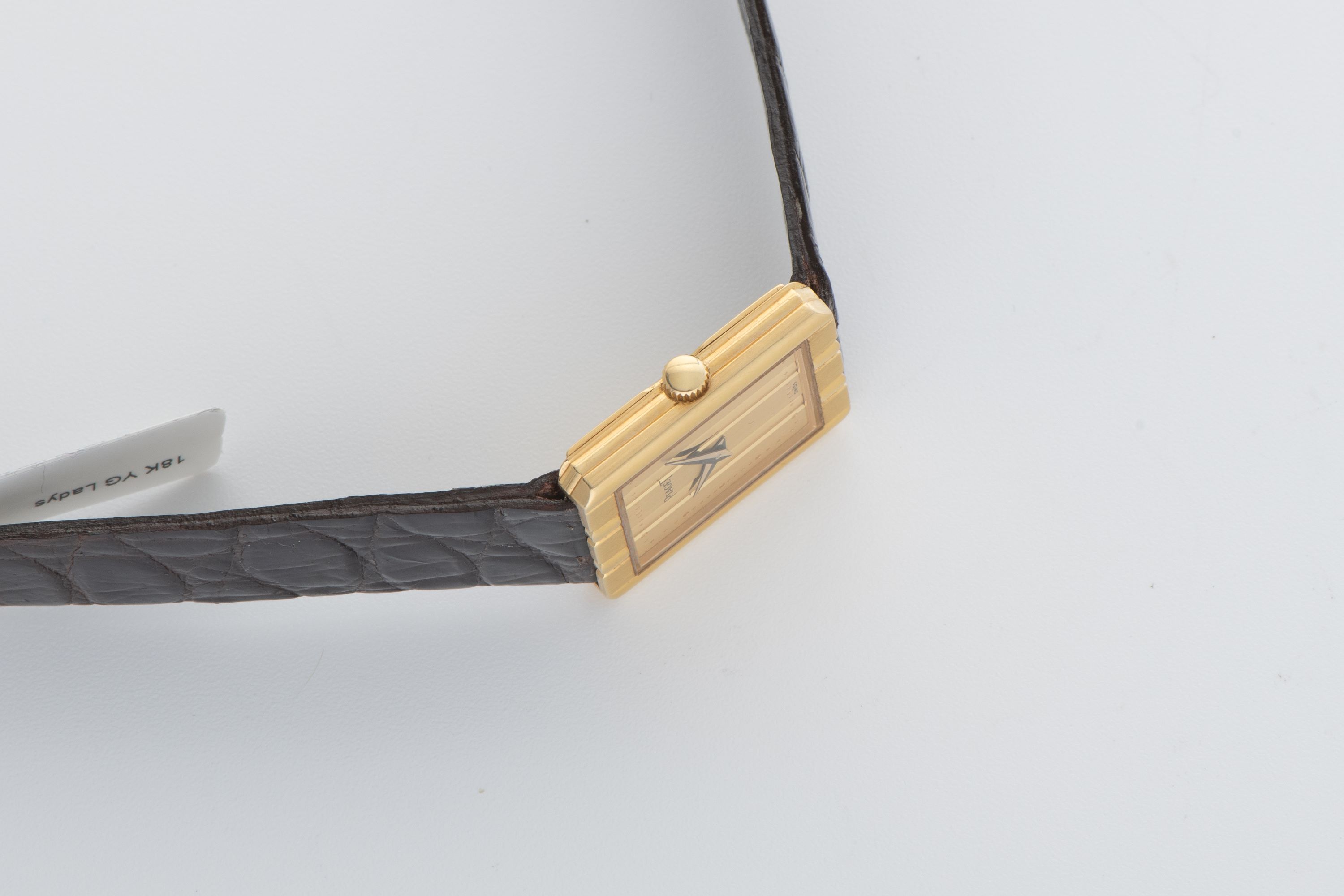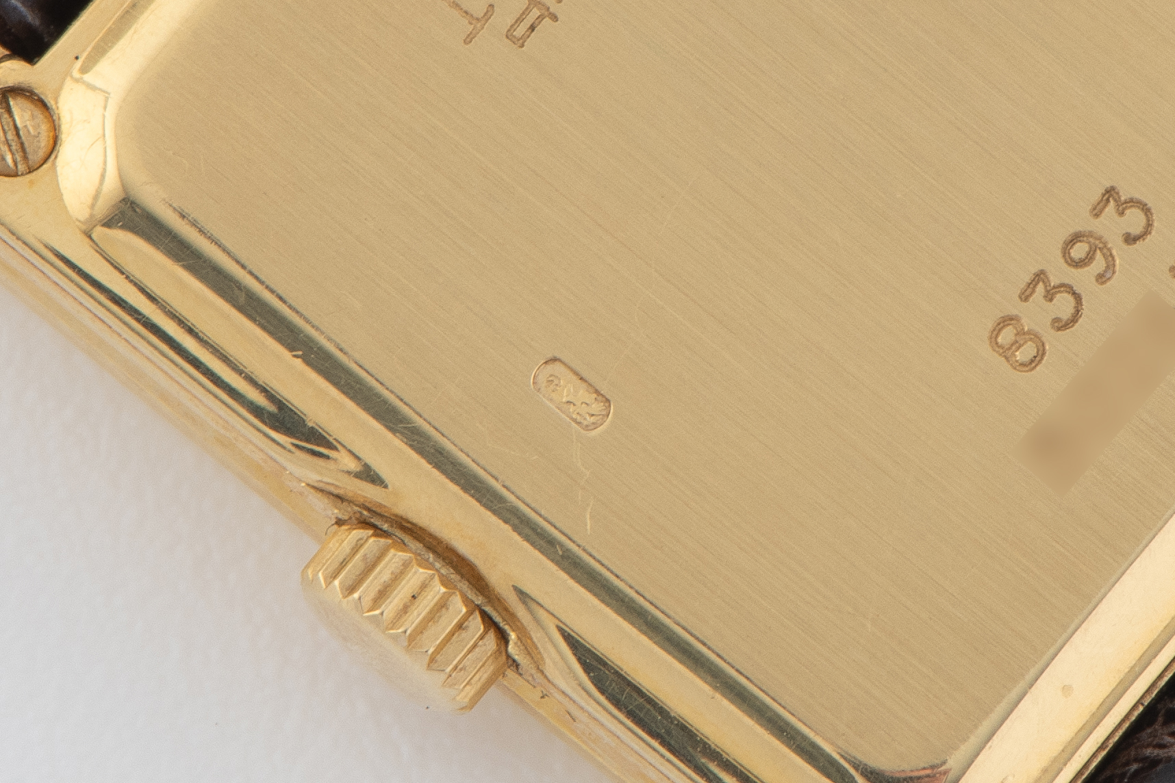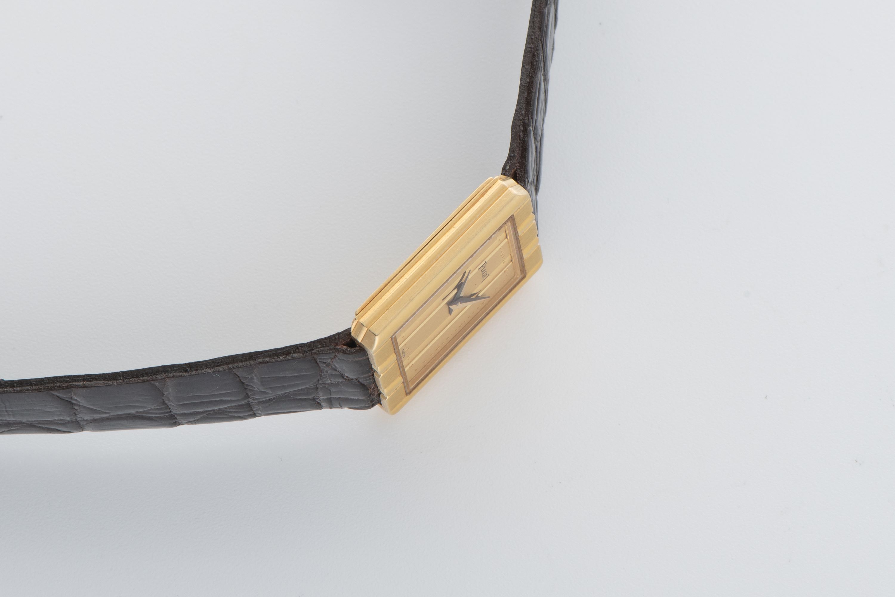CaseRectangular case in 18k yellow gold with alternating brushed and polished stripes, crown at 3 o'clock