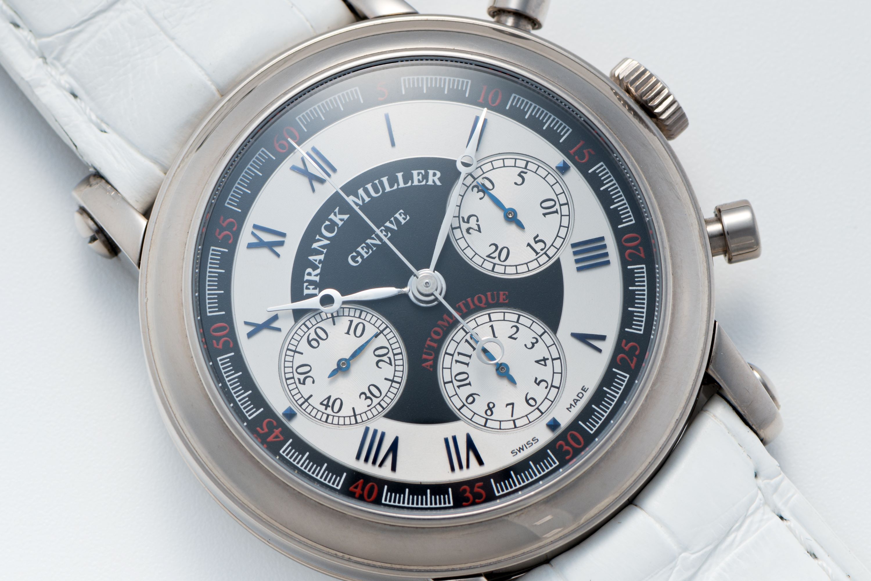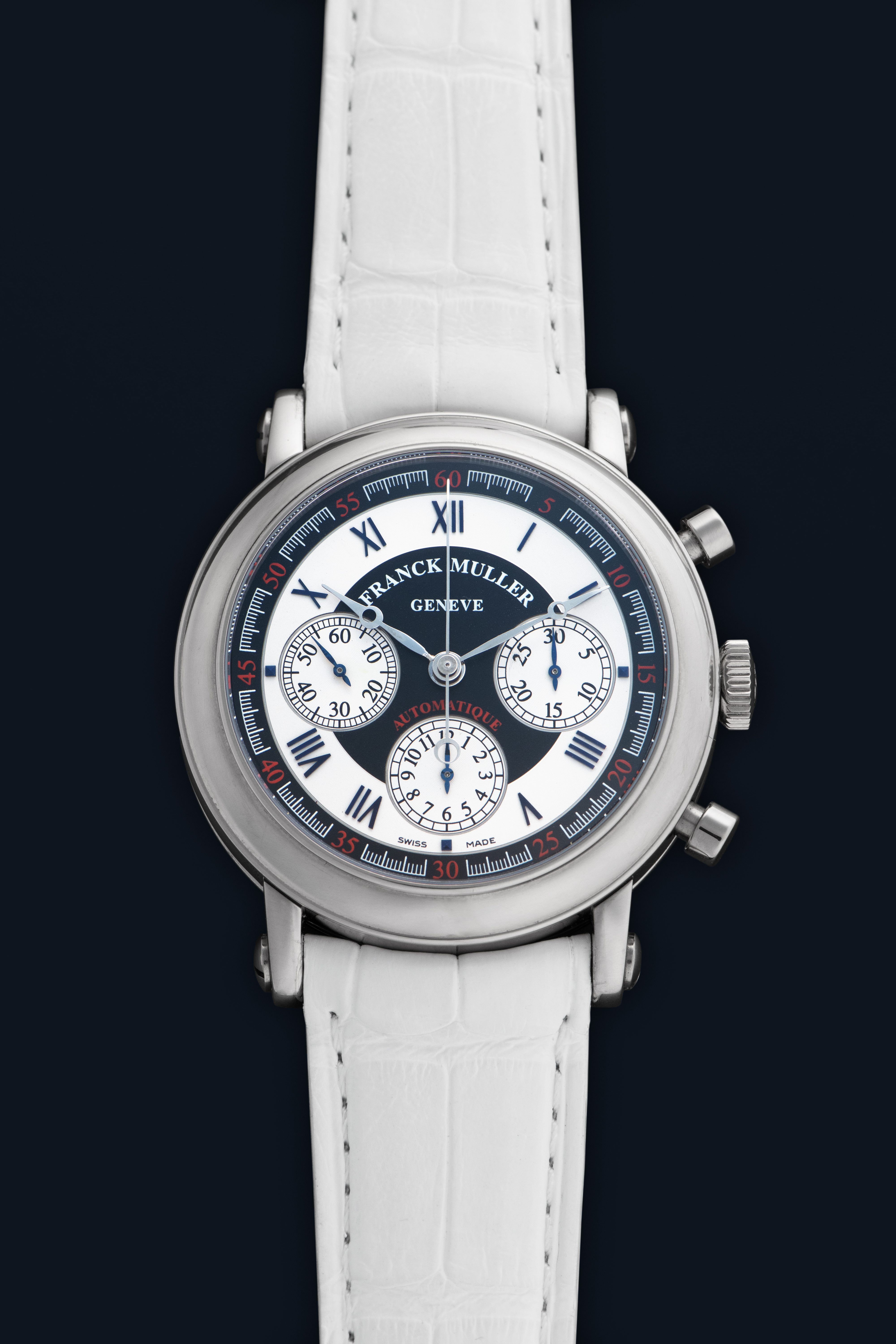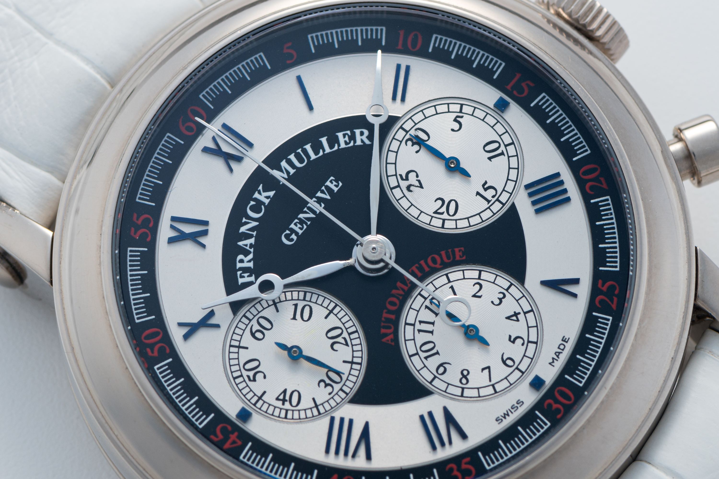 DialMatte black dial with red and white accents, white gold breguet hands, applied roman numerals, small seconds at 9 o'clock, 12 hour chronograph counter at 6 o'clock, 30 minute chronograph counter at 3 o'clock, signed 'Franck Muller' at 12 o'clock