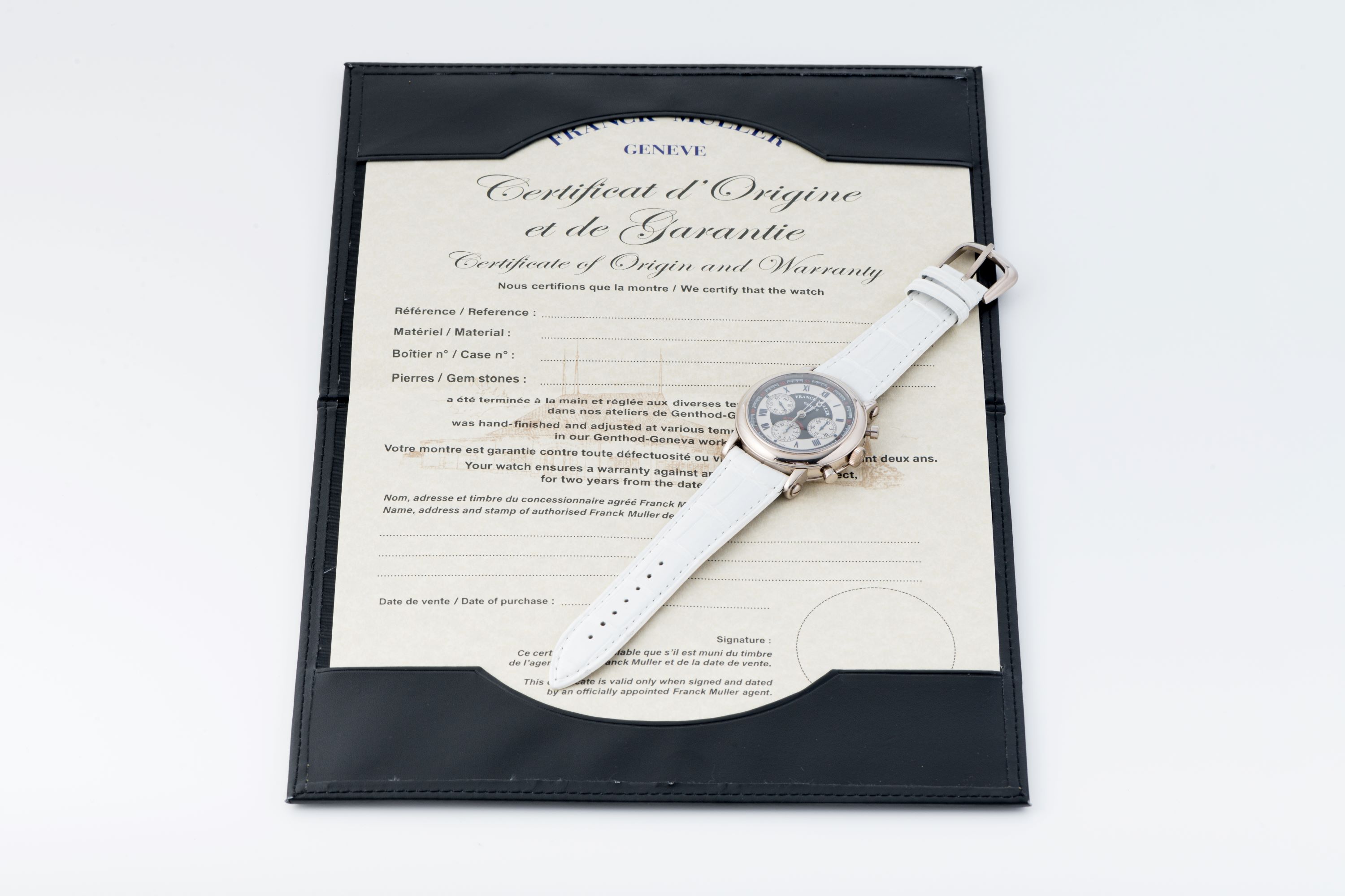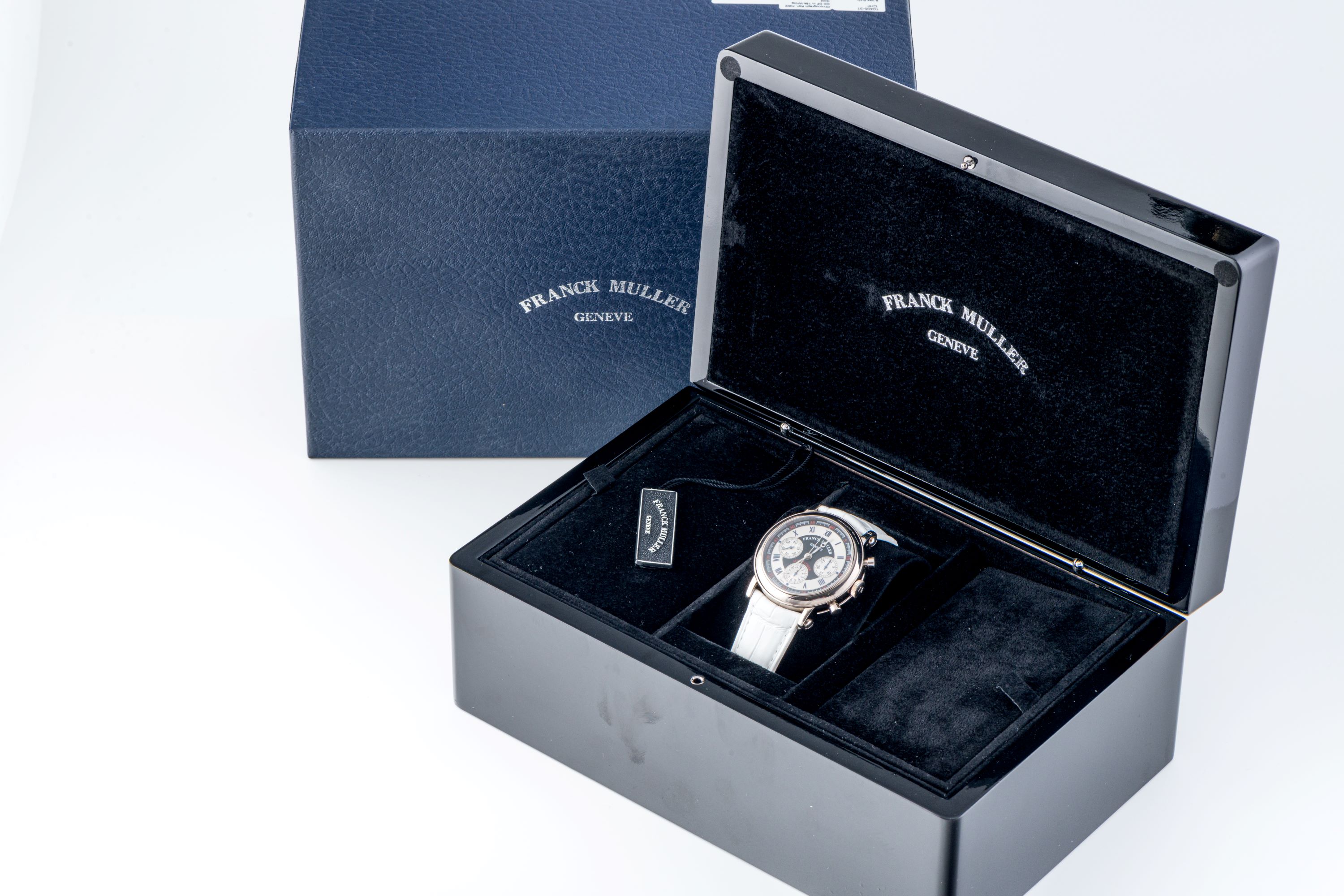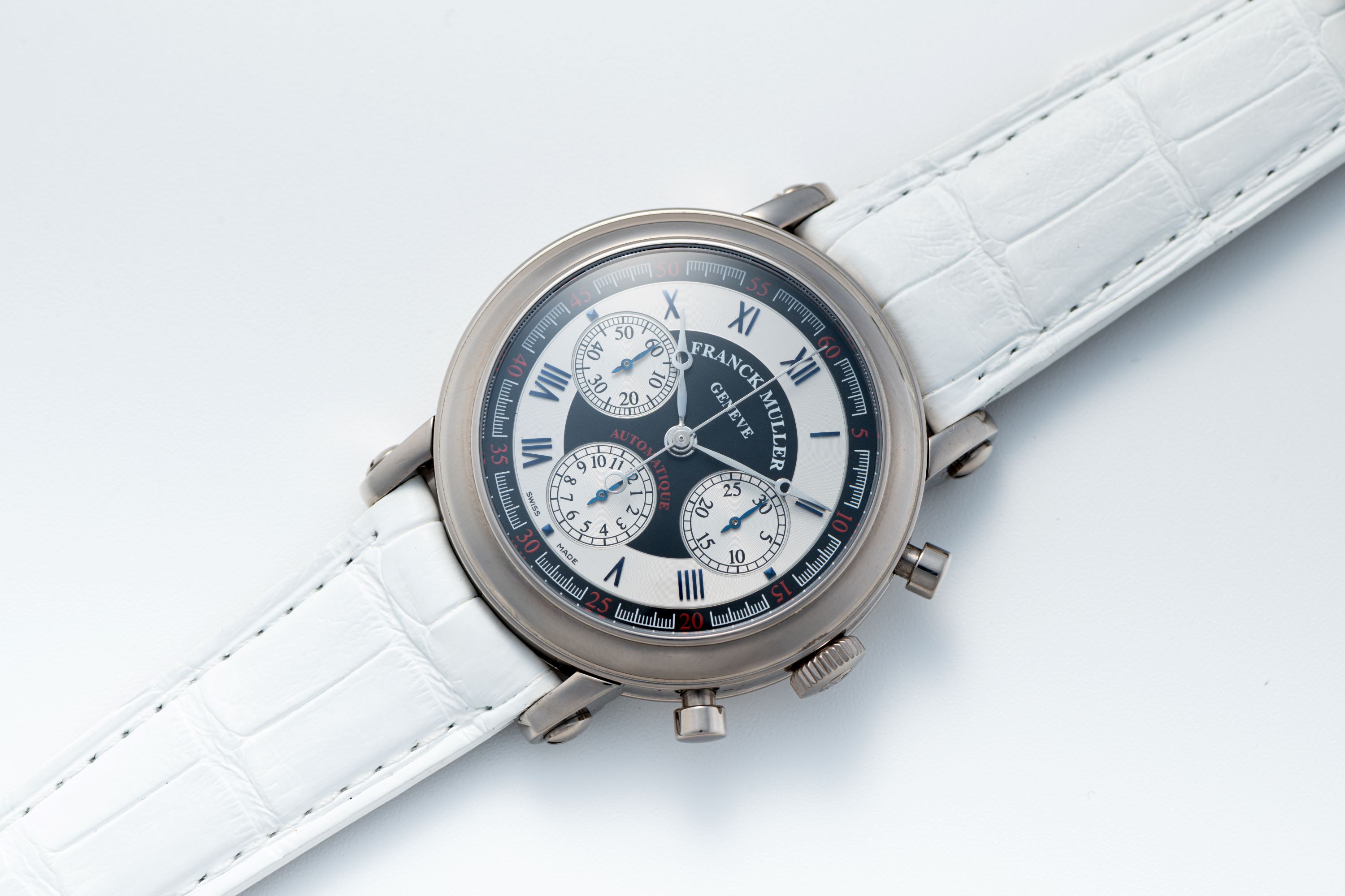 DialMatte black dial with red and white accents, white gold breguet hands, applied roman numerals, small seconds at 9 o'clock, 12 hour chronograph counter at 6 o'clock, 30 minute chronograph counter at 3 o'clock, signed 'Franck Muller' at 12 o'clock