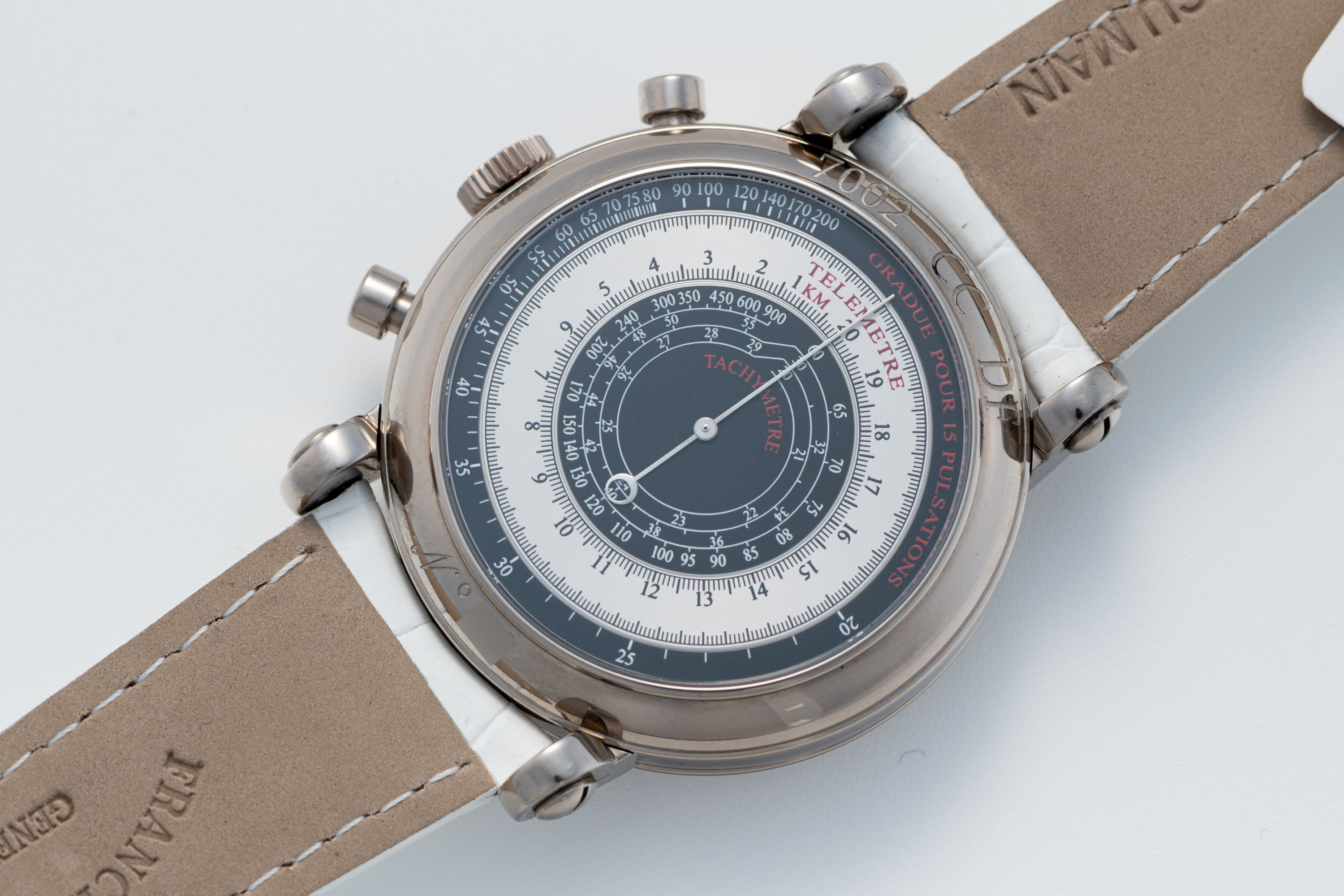 CaseRound case in 18k white gold with chronograph pushers at 2 and 4 o'clock, crown at 3 o'clock, telemeter complication on the caseback