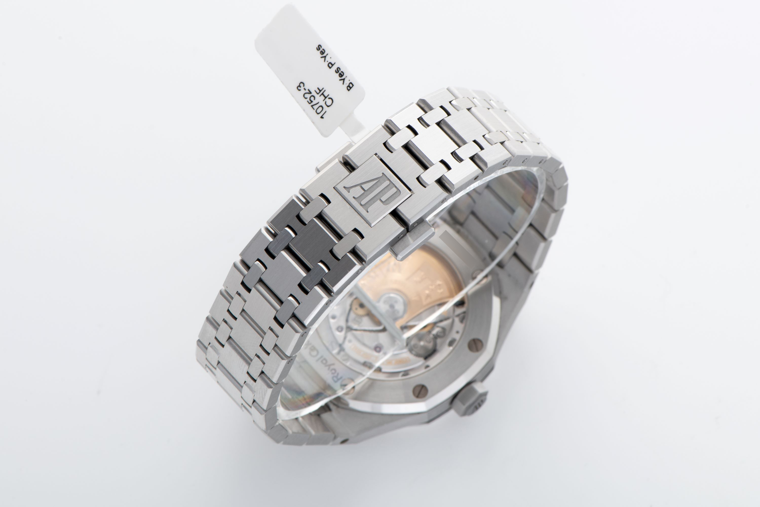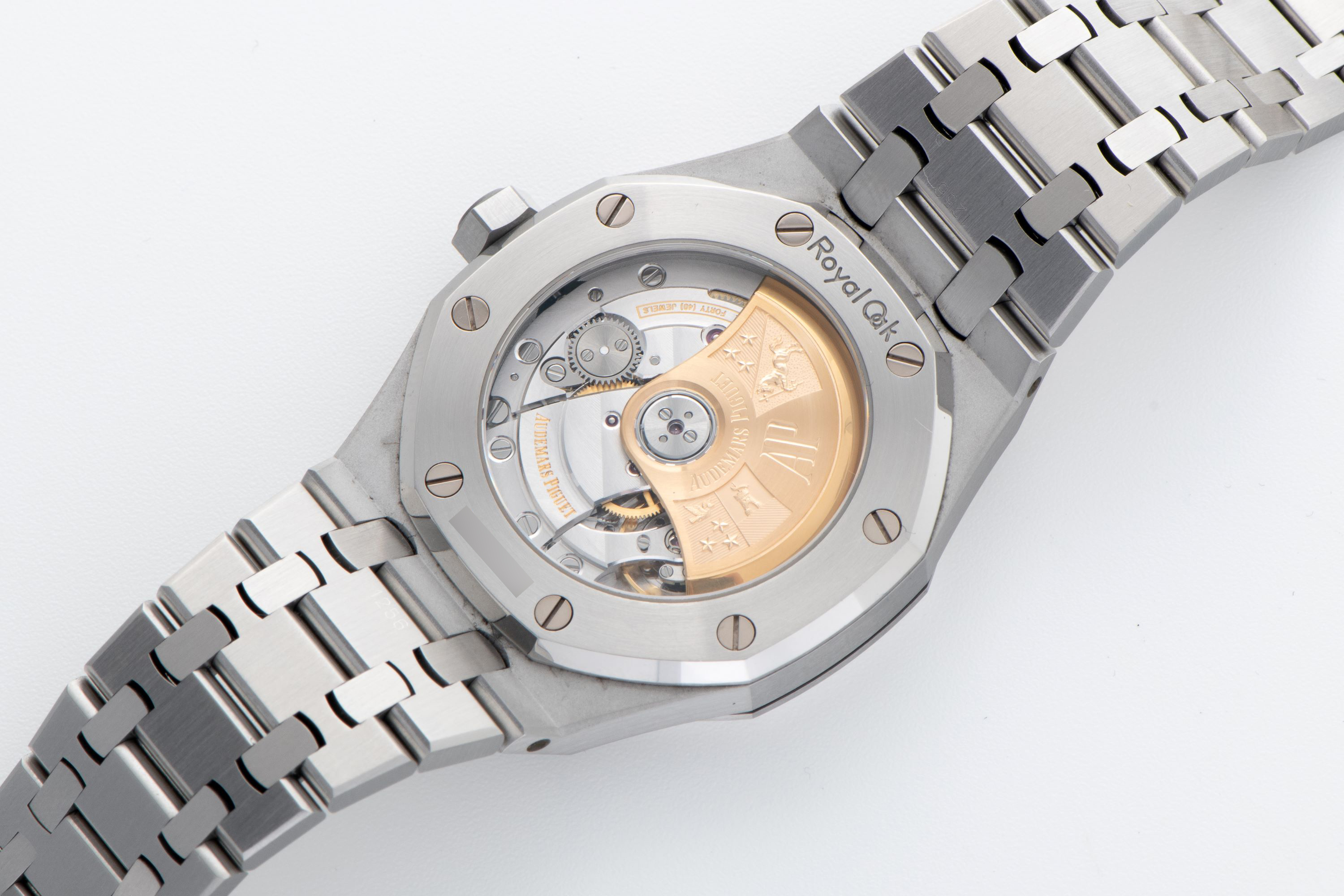 CaseOctagonal Royal Oak case in stainless steel with fixed octagonal bezel, crown at 3 o'clock, display caseback