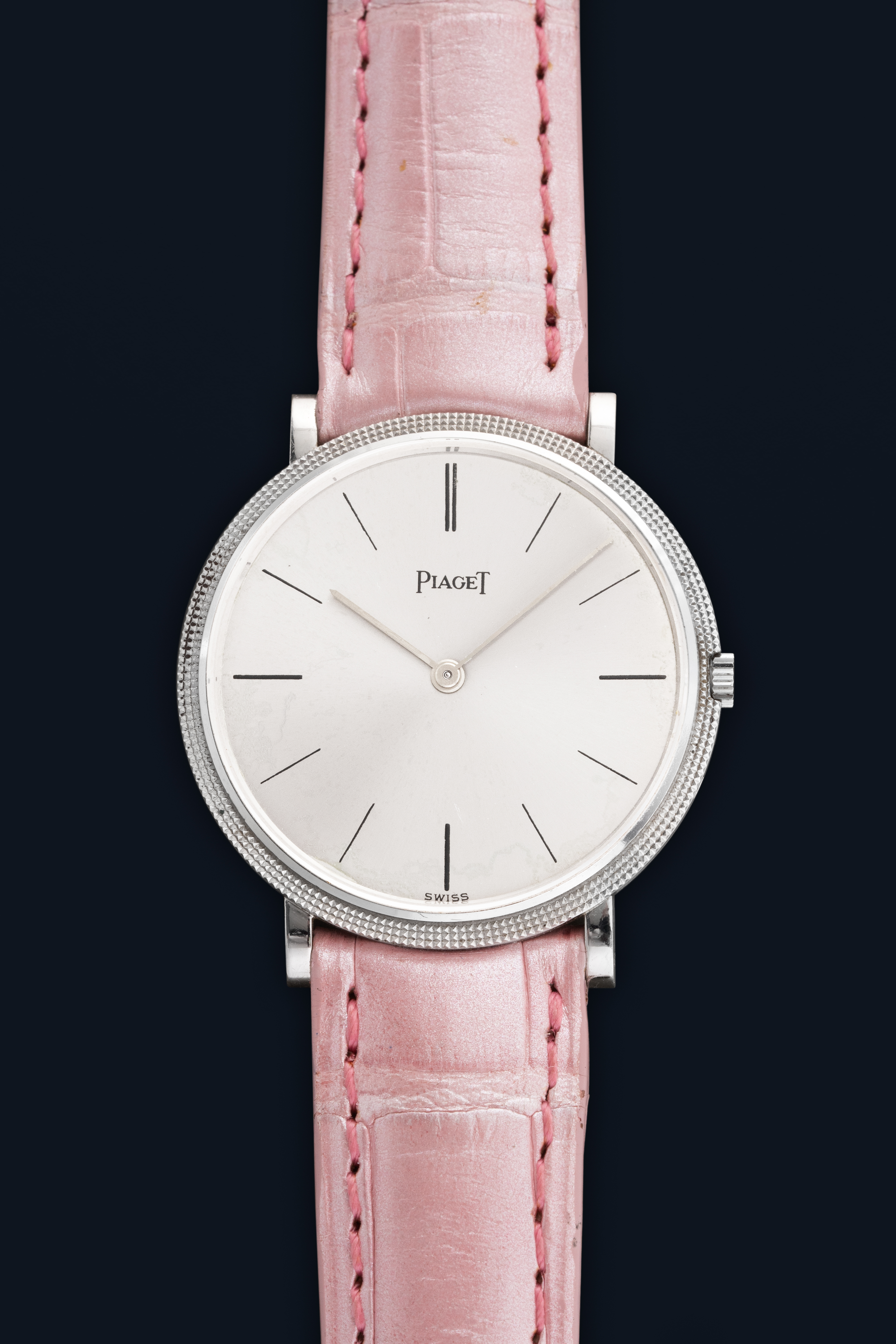 DialSilver dunburst dial with stick indices, white gold hands, signed 'Piaget' at 12 o'clock