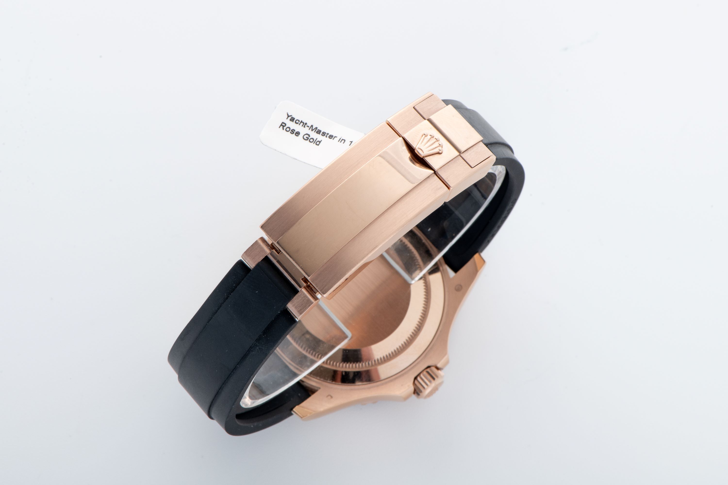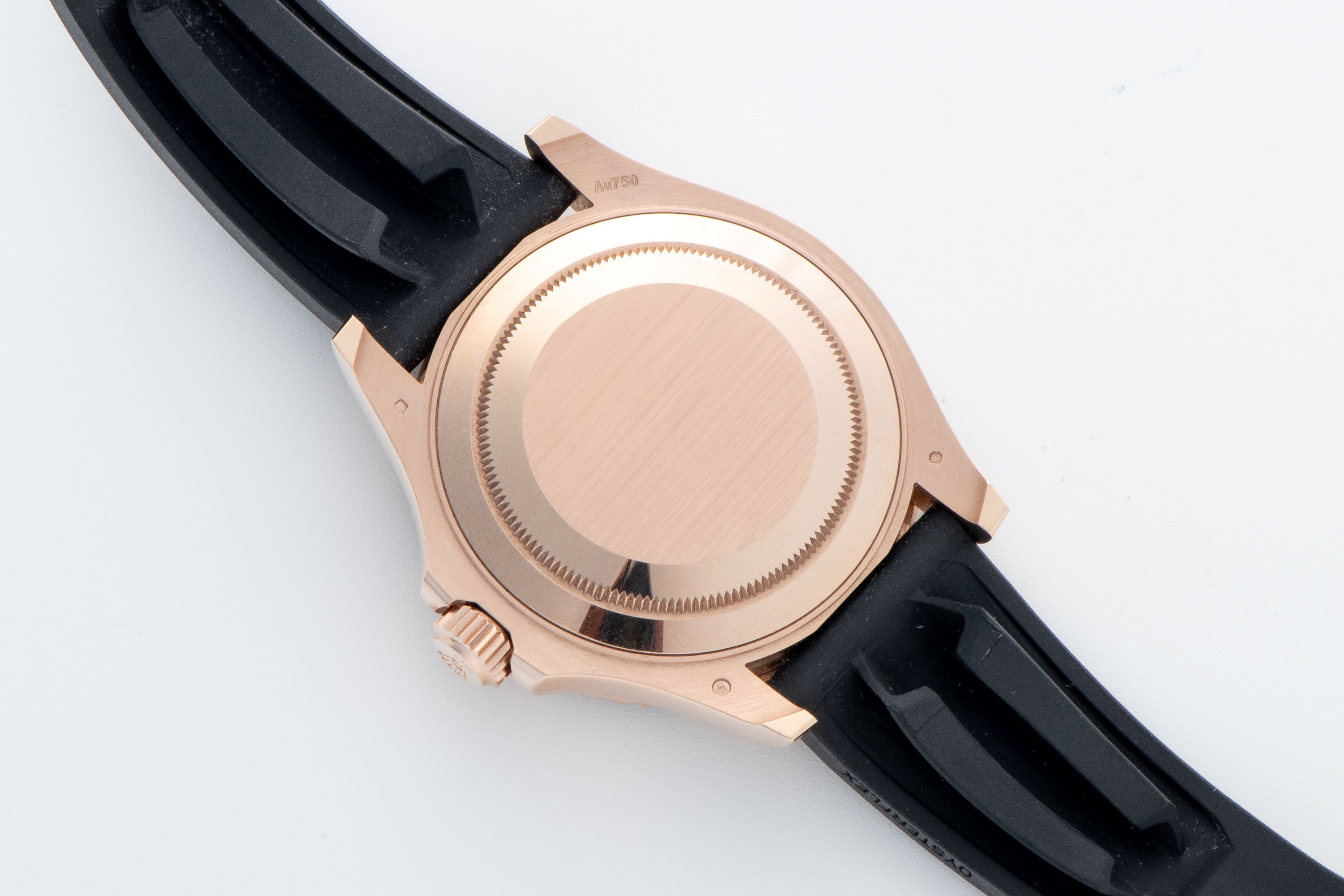 StrapBlack Oysterflex rubber band (size E at 6 o'clock, F at 12 o'clock), Rolex folding clasp in 18k rose gold with glidelock