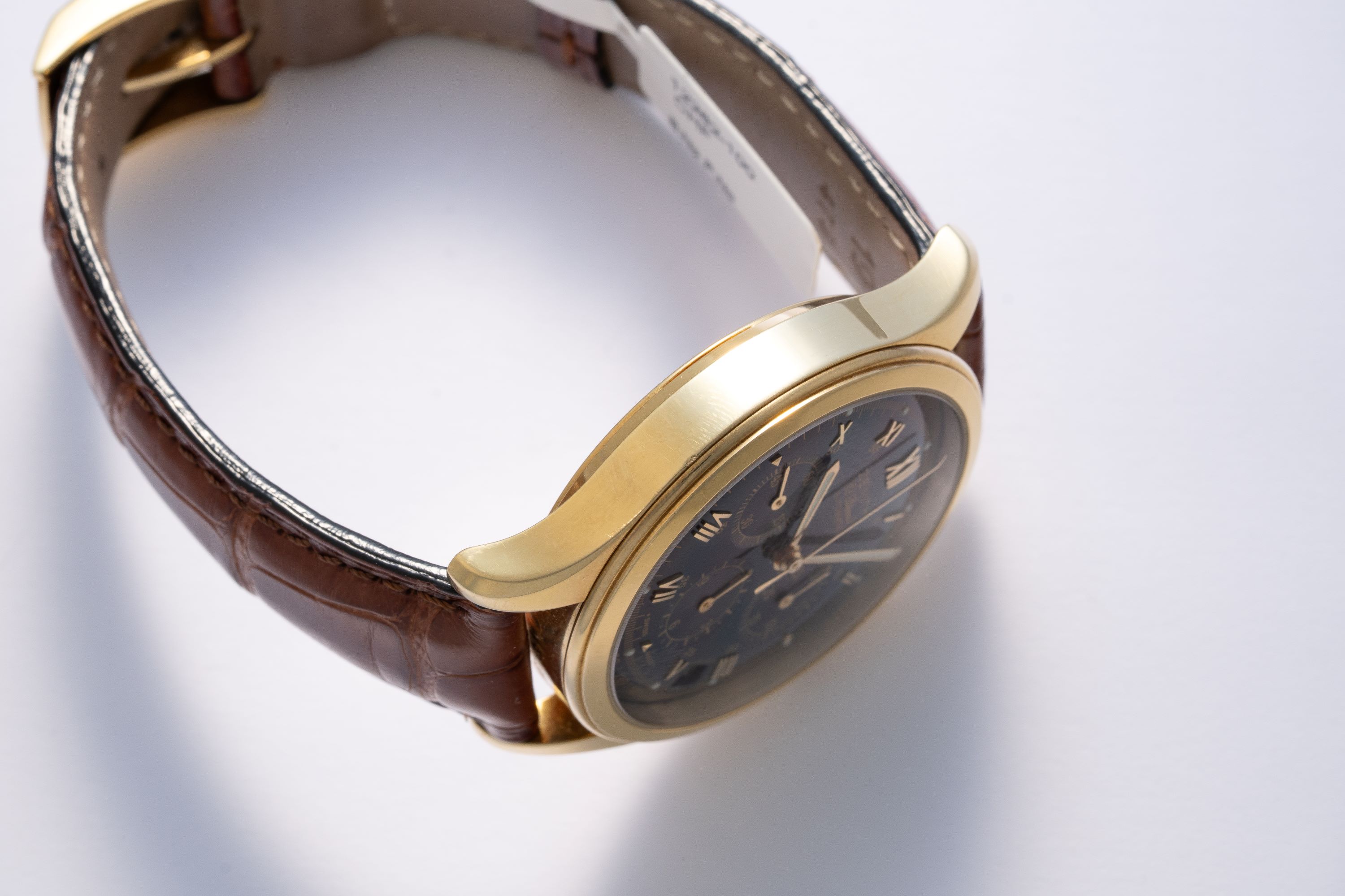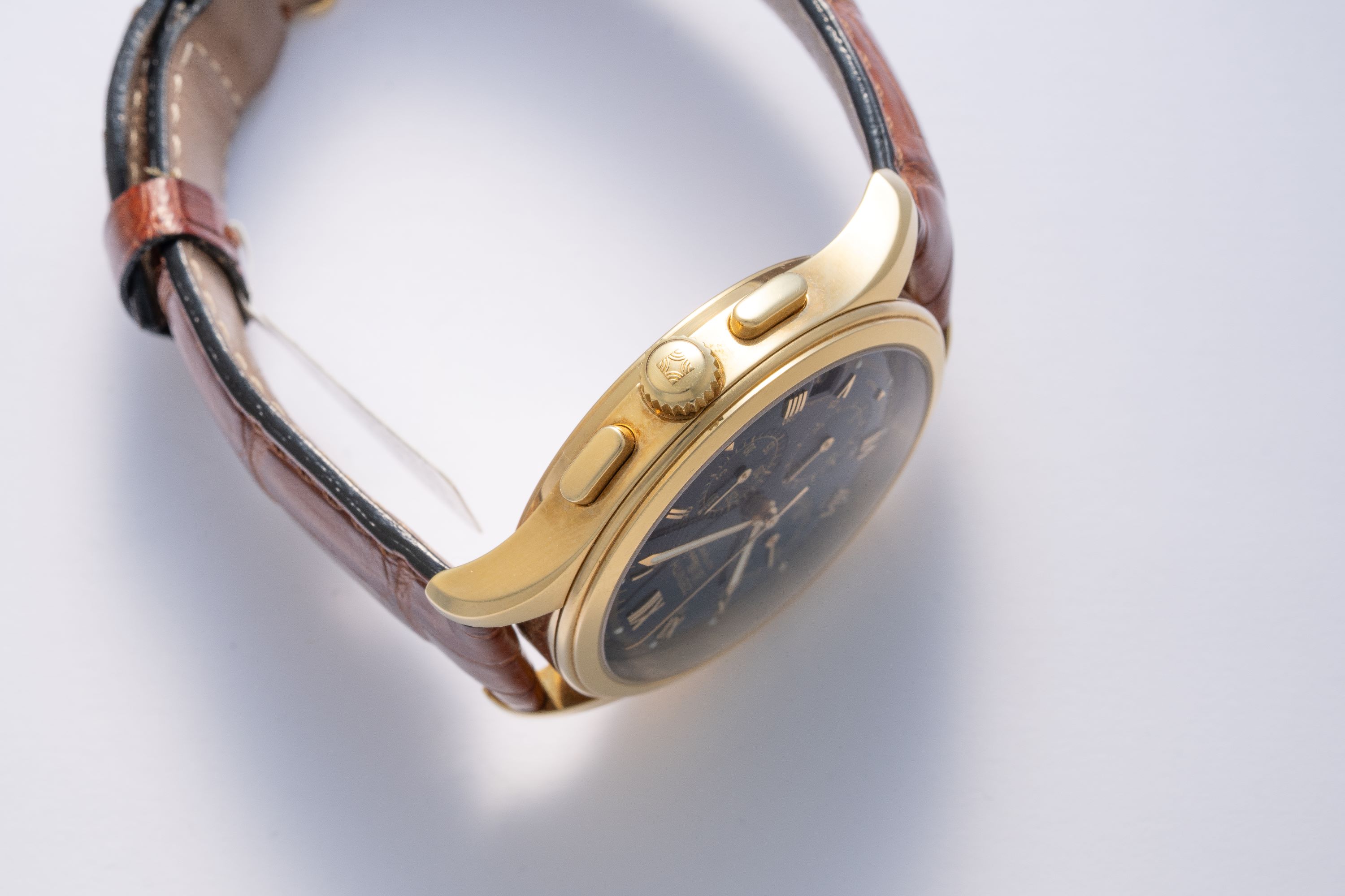CaseRound case in 18k yellow gold with chronograph pushers at 2 and 4 o'clock, crown at 3 o'clock, display caseback