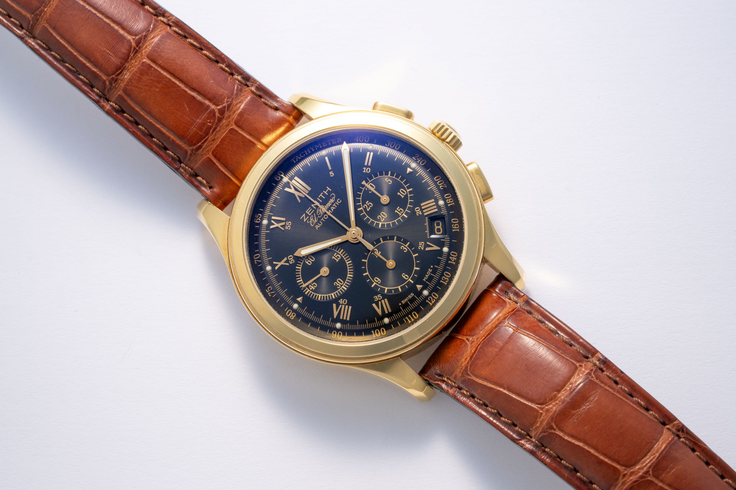 DialBlack domed dial with applied roman numerals, gold luminous hands, date window at 4:30, 30 minute chronograph counter at 3 o'clock, 12 hour chronograph counter at 6 o'clock, small seconds at 9 o'clock, signed 'Zenith' at 12 o'clock