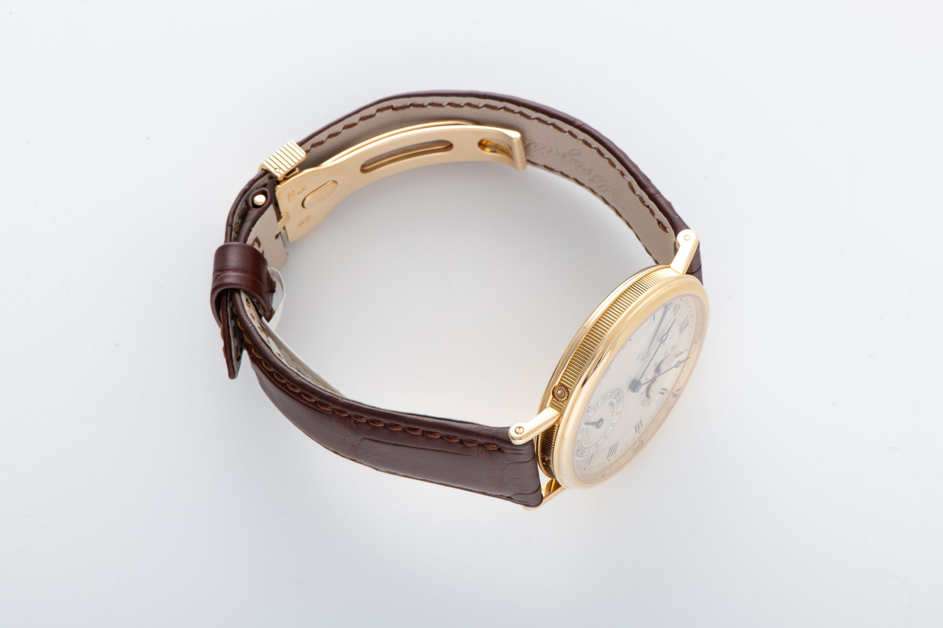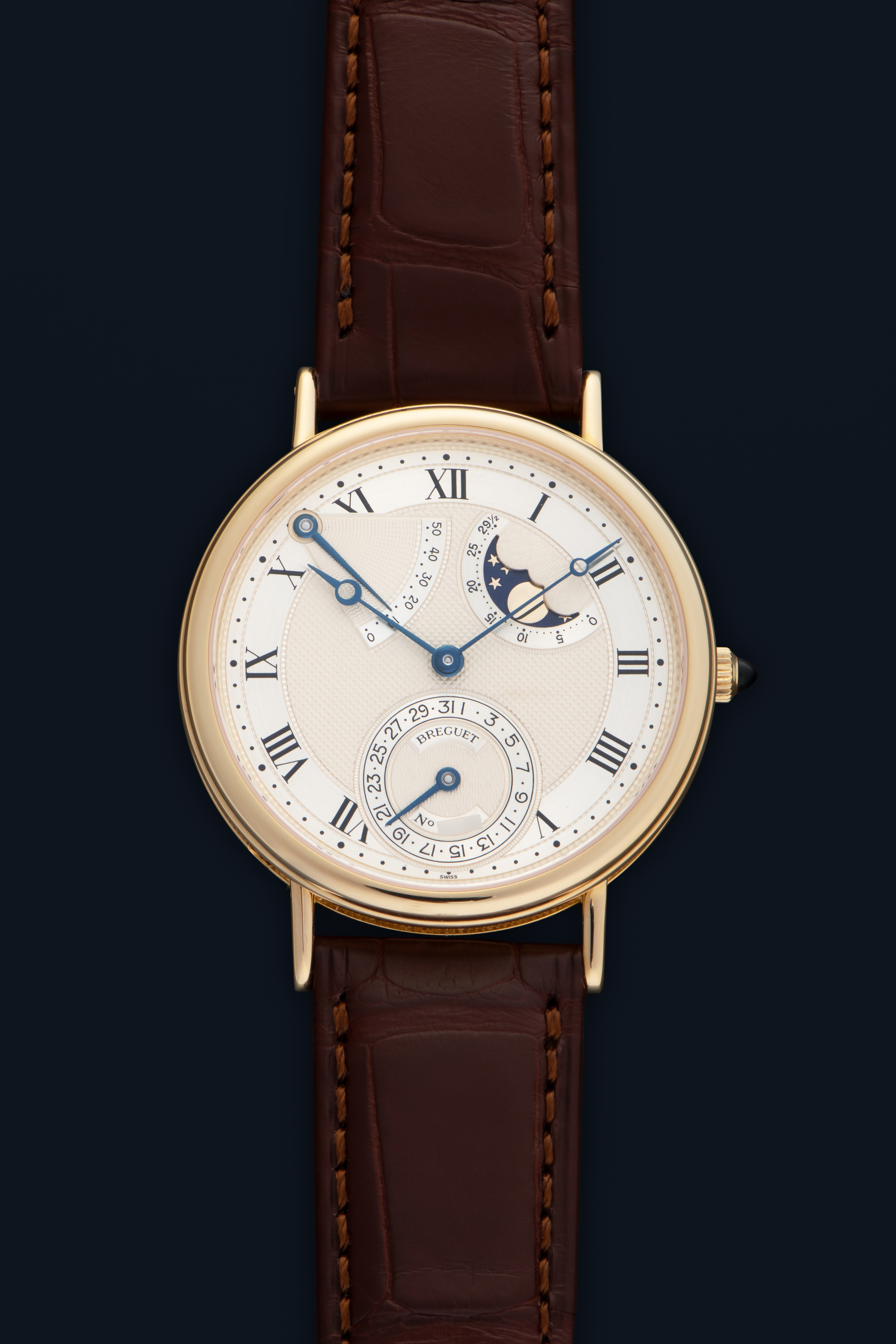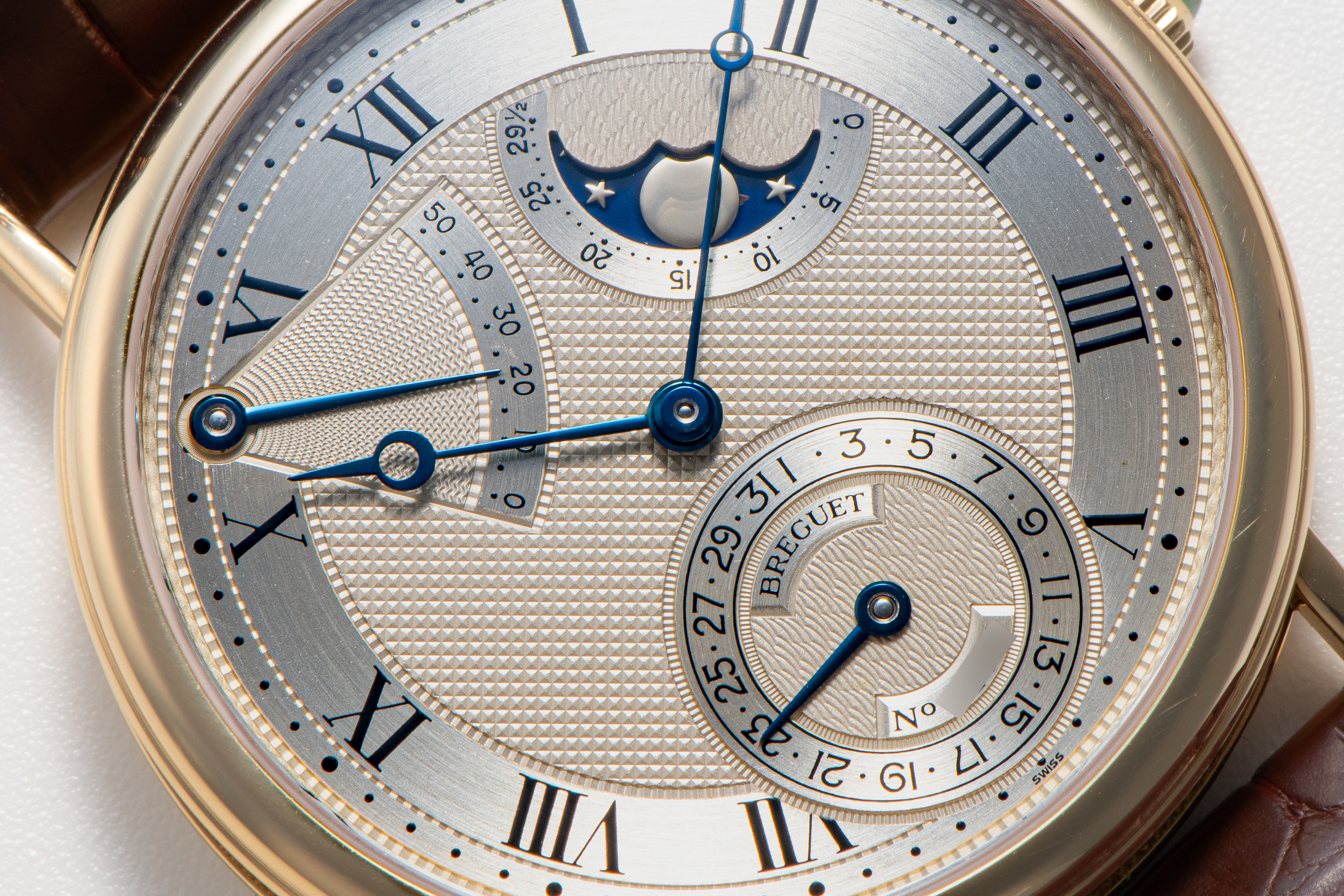DialSilvered gold dial with multiple guilloche patterns, roman numerals, heat-blued Breguet hands, date at 6 o'clock, moonphase between 1 and 2 o'clock, power reserve between 10 and 11 o'clock, signed 'Breguet' at 6 o'clock
