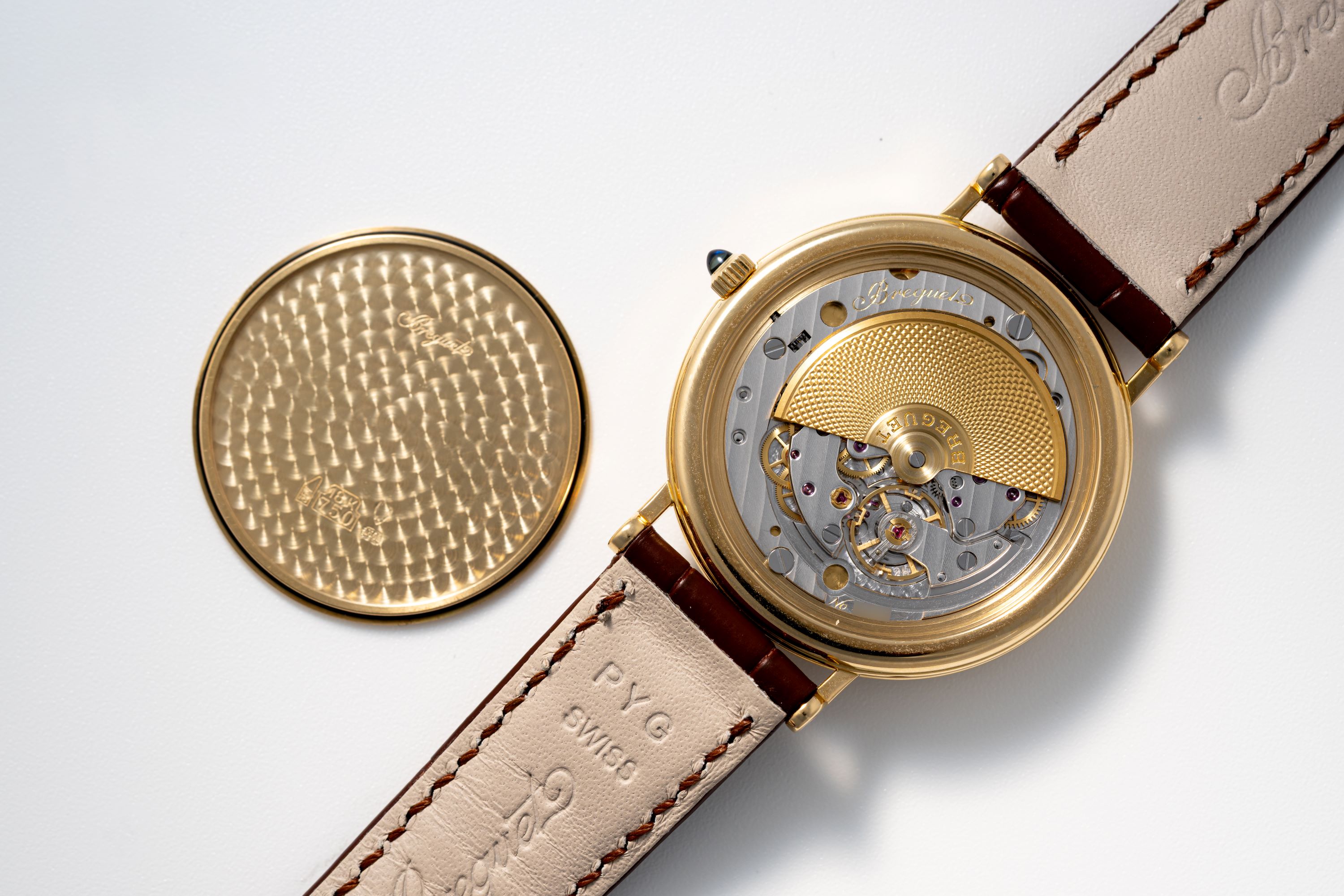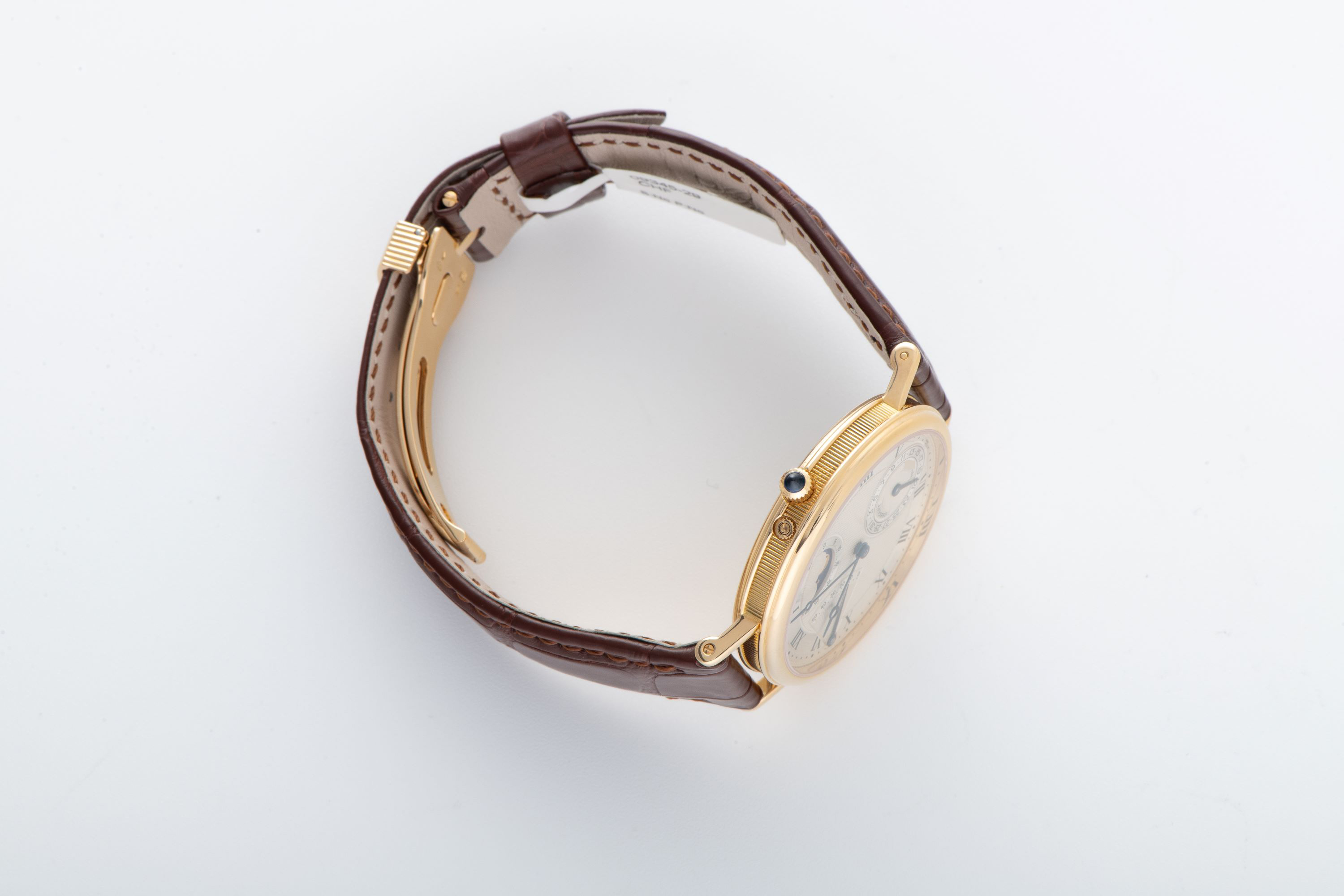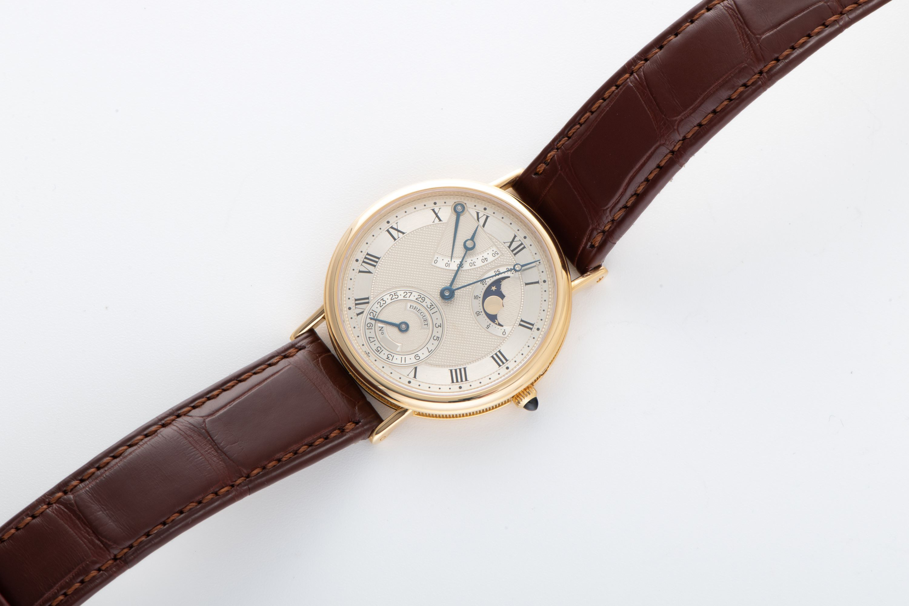DialSilvered gold dial with multiple guilloche patterns, roman numerals, heat-blued Breguet hands, date at 6 o'clock, moonphase between 1 and 2 o'clock, power reserve between 10 and 11 o'clock, signed 'Breguet' at 6 o'clock