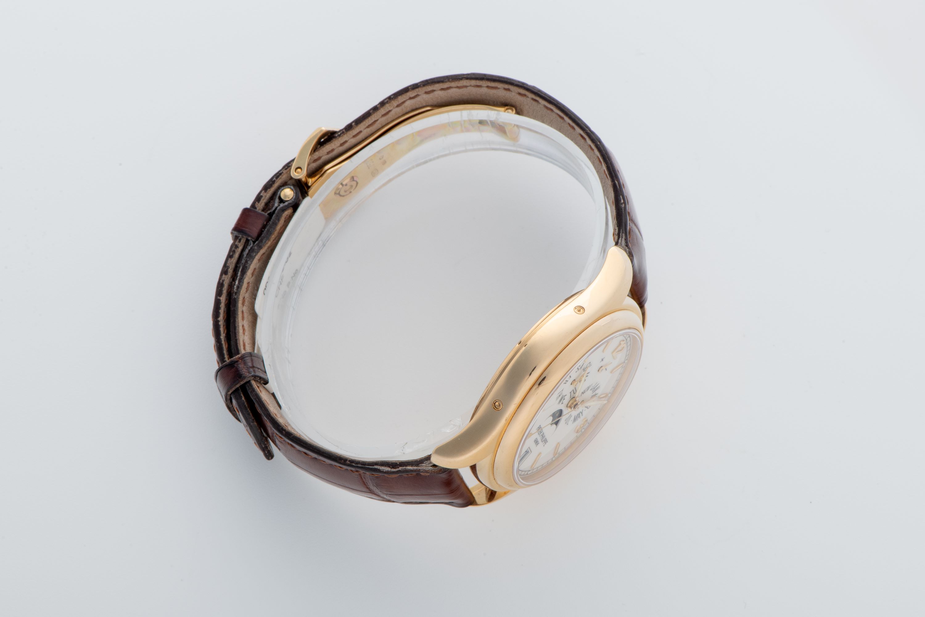 DialWhite lacquer dial with applied gold indices, date and moonphase at 6 o'clock, day at 9:30, month at 2:30, power reserve at 12 o'clock, signed 'Patek Philippe' at 6 o'clock
