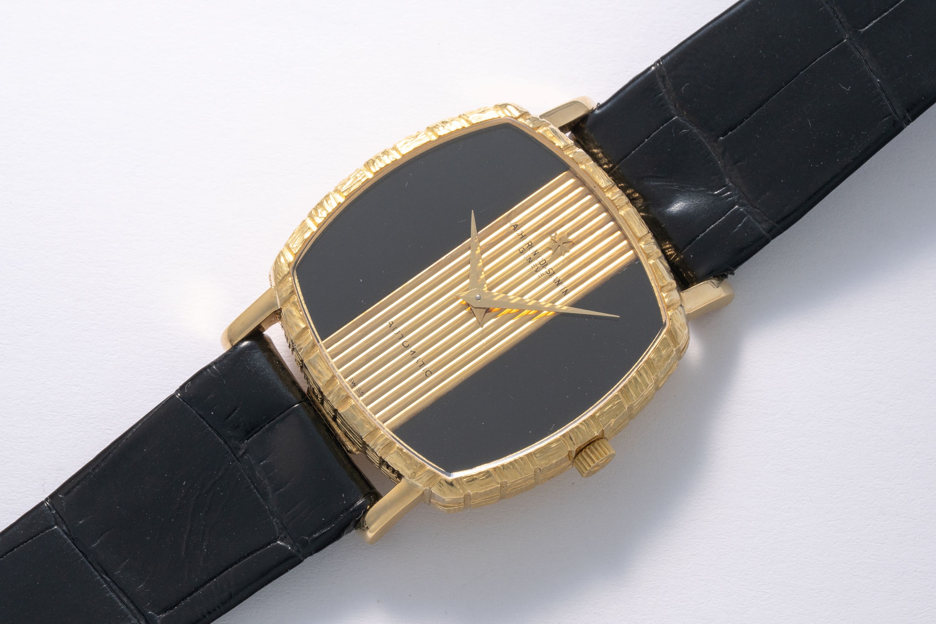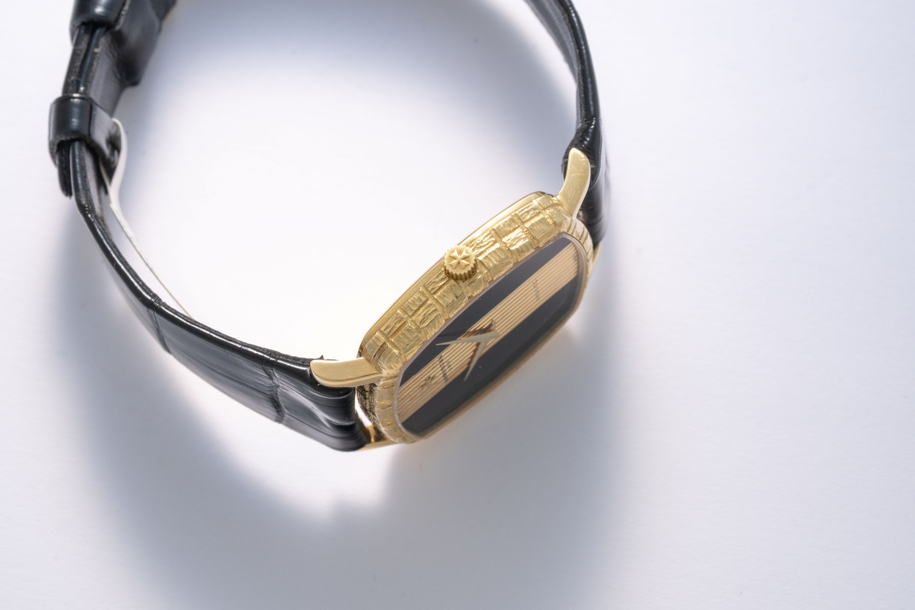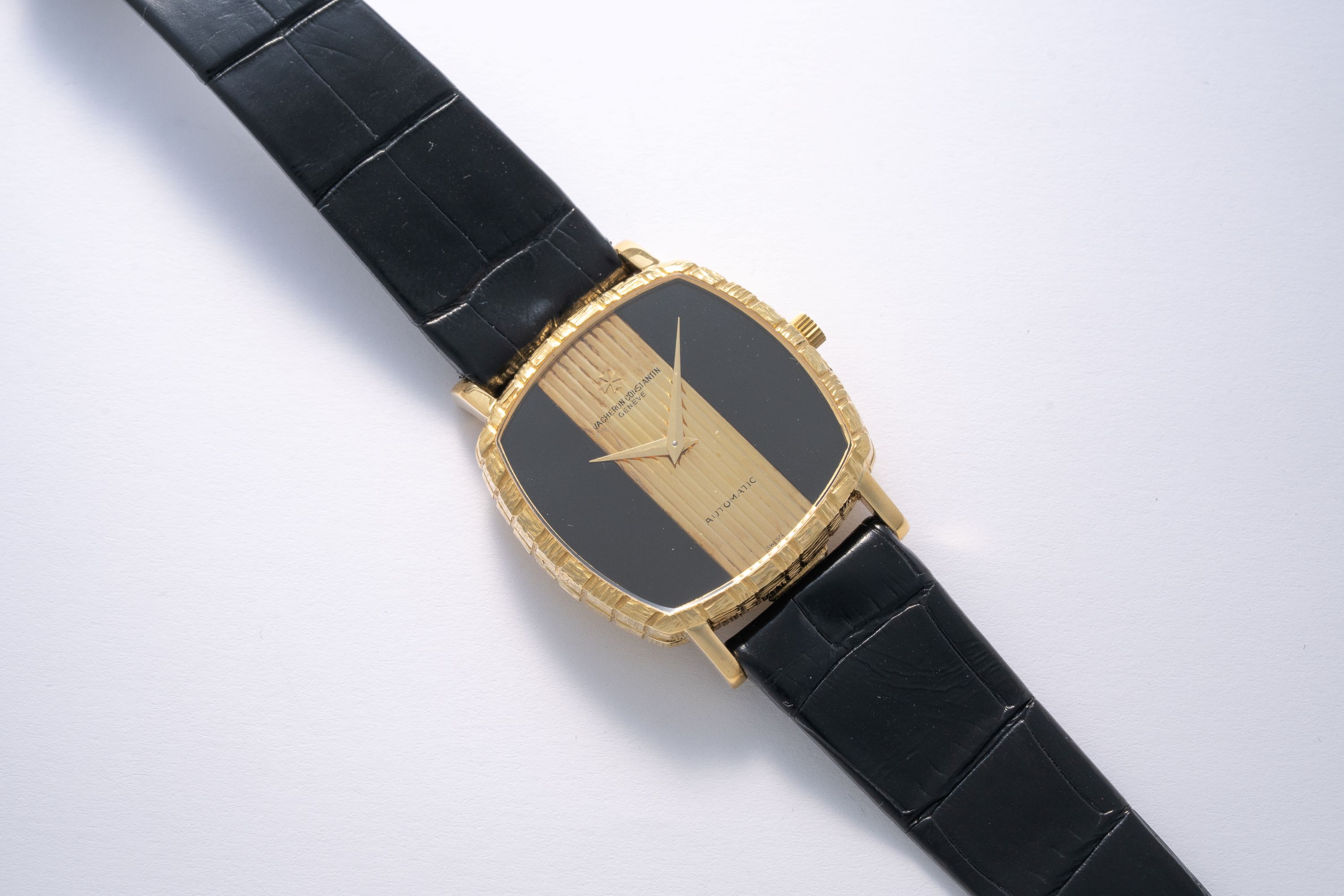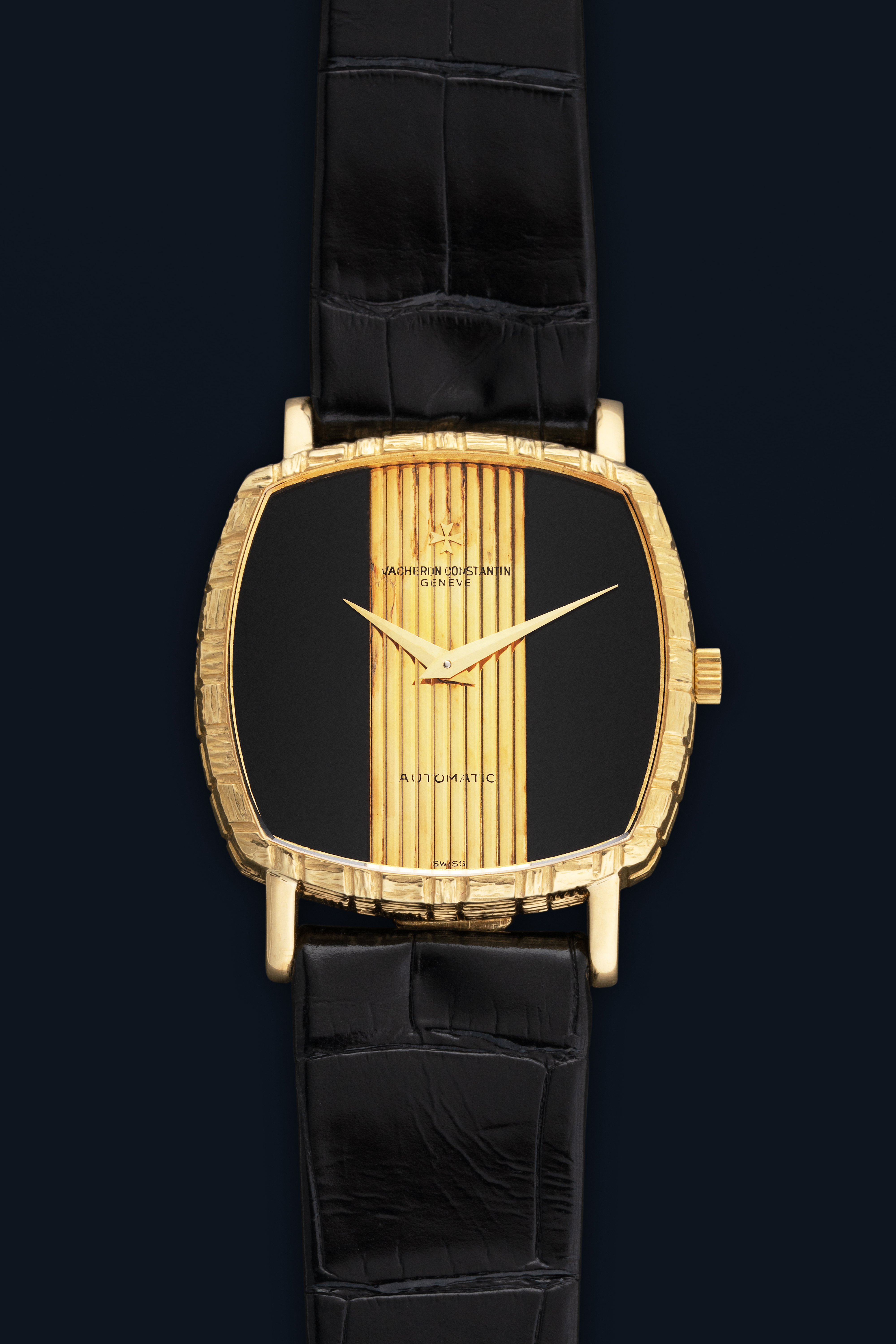 DialOnyx and gold dial with vertically striped center part, gold dauphine hands, signed 'Vacheron Constantin' with applied Maltese cross logo at 12 o'clock